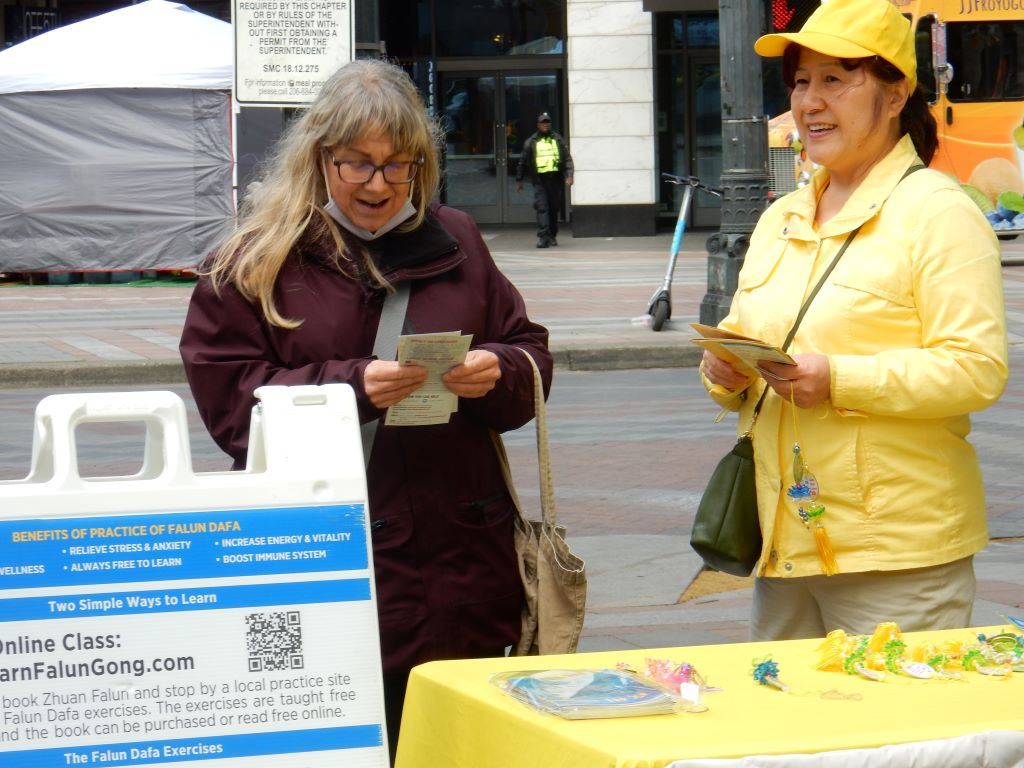 一位住在俄勒冈州波特兰市的行人表示很开心在西雅图见到这么多法轮功学员。他已经了解法轮功被中共迫害的真相,他很同情和赞赏坚守信仰的法轮功学员。他通过自己的阅读了解到中共的一些政策,包括对民众严重的监控。他同情中共统治下被压榨的中国大陆民众。