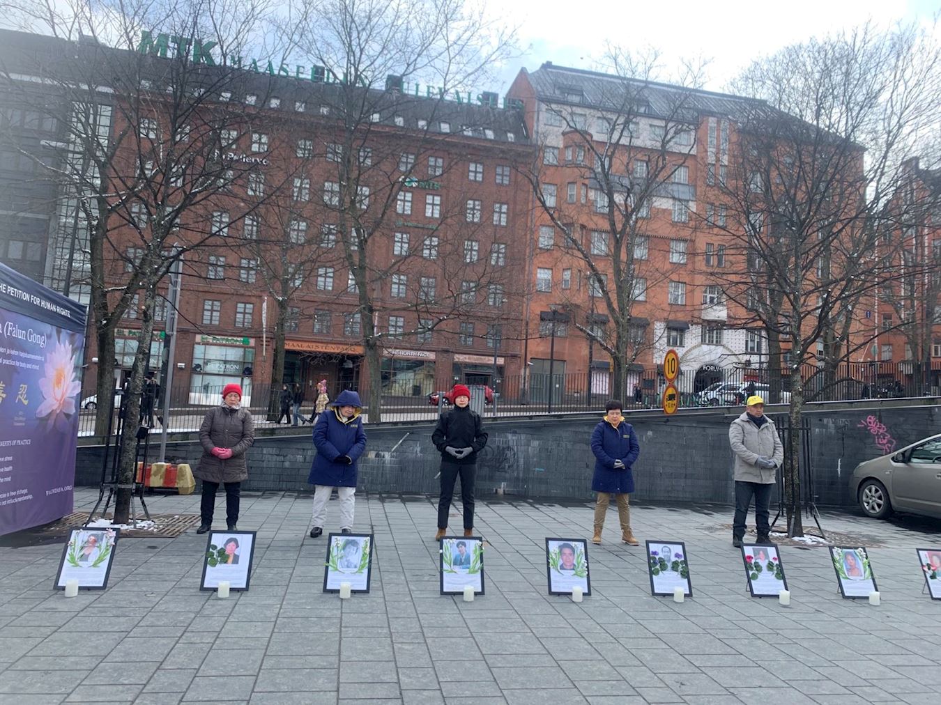 四月二十日的赫尔辛基市中心,学员将部分被迫害致死的法轮功学员的遗像摆在地上,并附上说明。当天天气阴晴不定,期间还下起了小雪,但仍然很多人驻足想要了解真相。