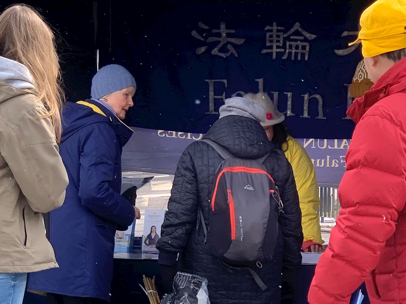 一位名叫苏珊娜的芬兰女士停下脚步在反迫害征签表上签下了她的名字。离开前,她告诉法轮功学员:“你们所做的事情非常重要,要继续努力。”