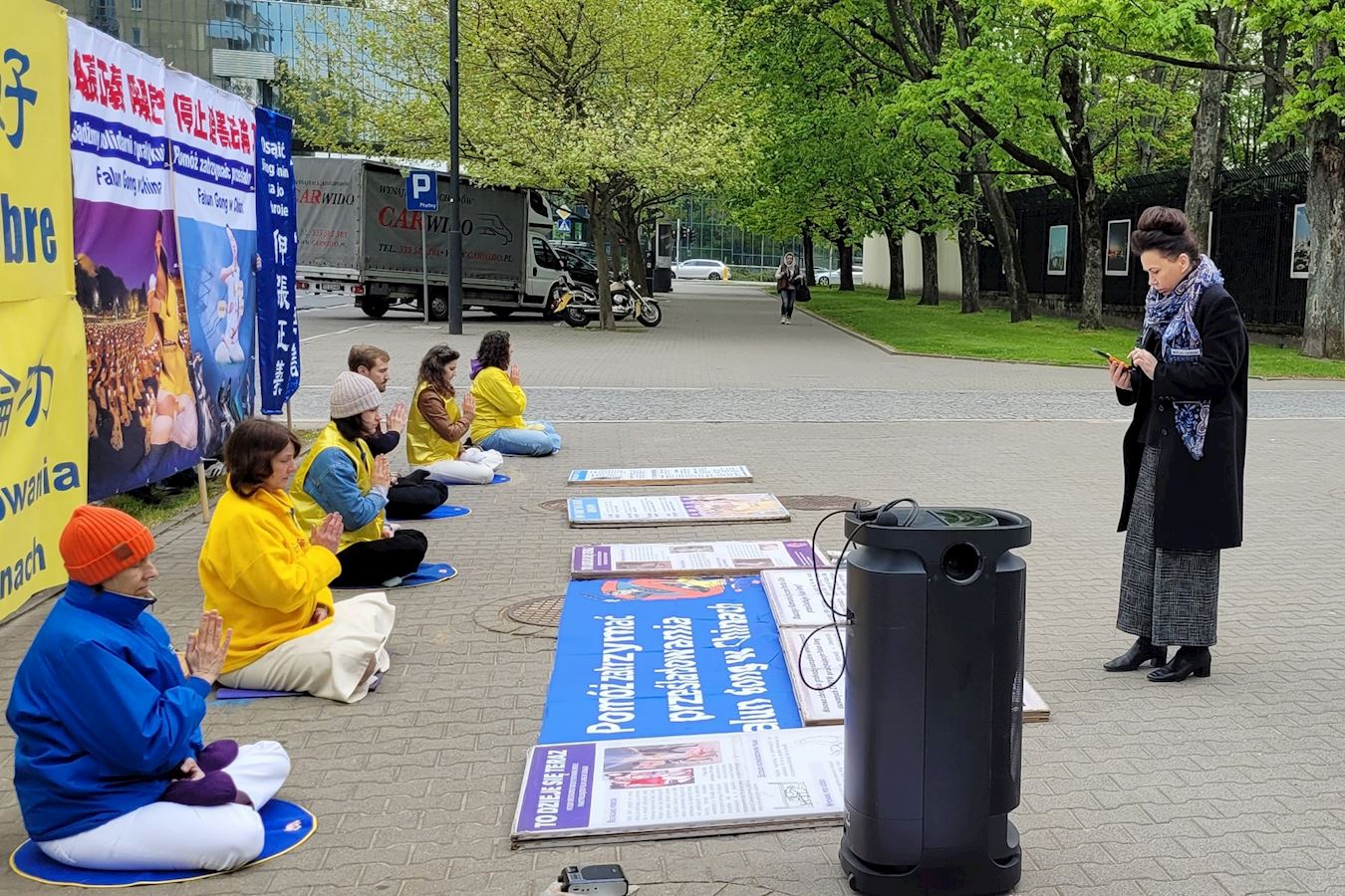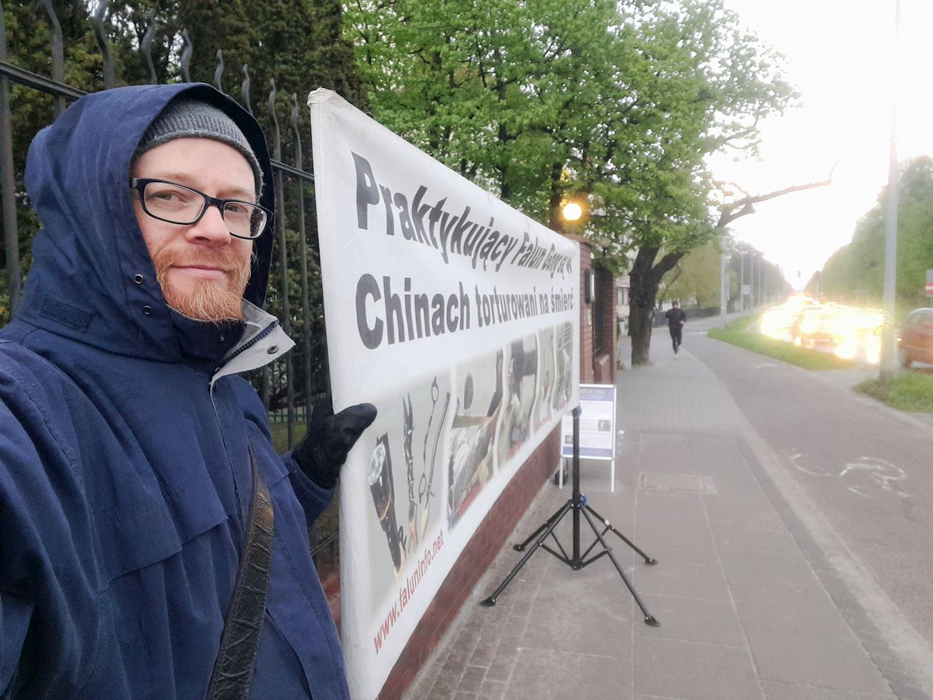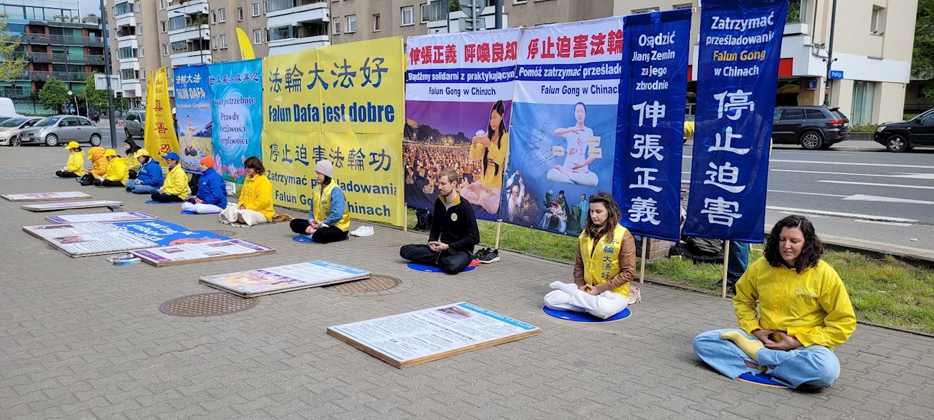今天是“四·二五”万名法轮功学员和平上访二十五周年纪念,学员身边的波兰语条幅表达着二十五年来从未中断的正义呼声“制止中共对法轮功的迫害”。