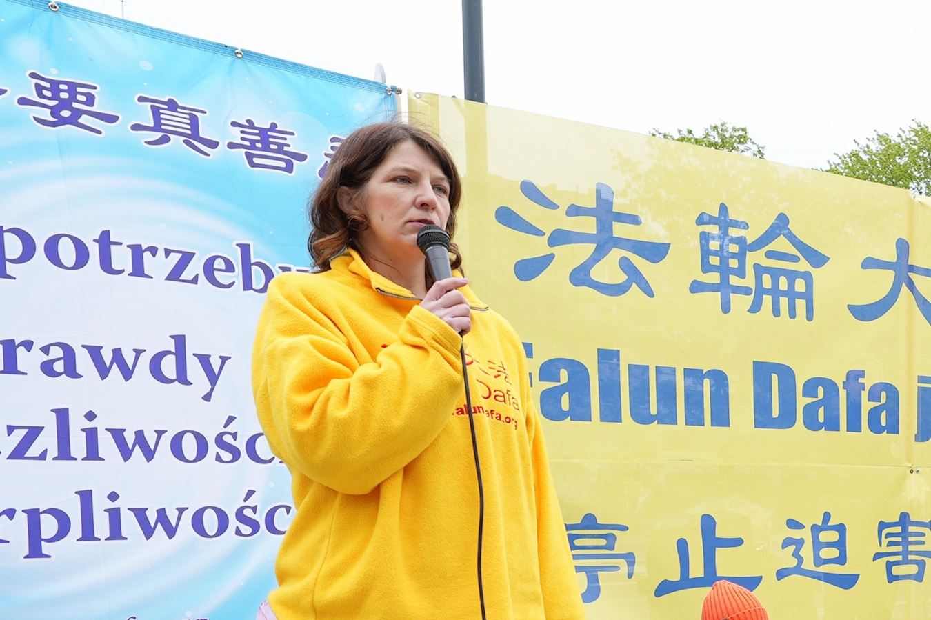![]() 图5:波兰法轮功学员玛丽亚(Maria)在中使馆前发言。 |