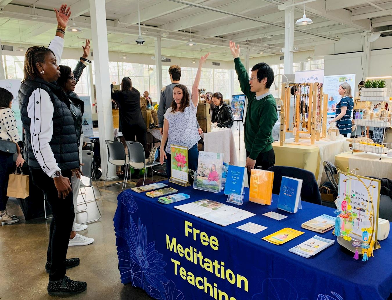 在现场,参展游客陆陆续续来到大法展位学炼功法,有学功者在炼功后感受到自己身体发热,获益良多,并决定购买《转法轮》回家拜读;多人在听完学员介绍后,都在询问密西沙加市哪里有炼功点。
