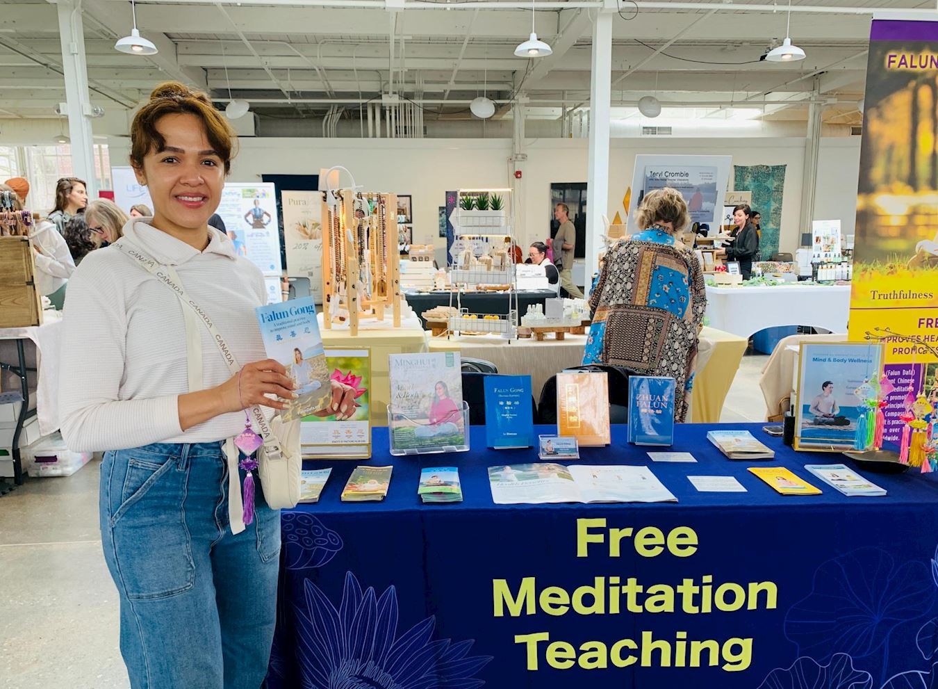 海伦(Helen)来自圭尔夫(Guelph)小镇,她有打坐的习惯和爱好。因为兴趣相投,她在展位上学炼了功法。