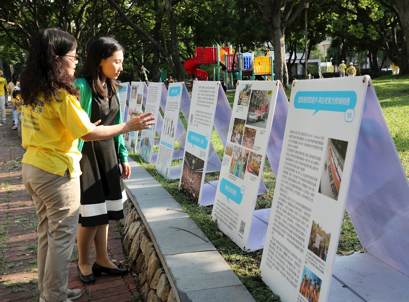 惠来森林公园集会地点,在会场两侧摆起法轮大法真相图片,也有法轮功学员在现场教民众学炼法轮功的五套功法。市民对法轮功功法很感兴趣,有的当场跟着学员动作学炼功法,有的向学员询问更多关于法轮功的讯息。