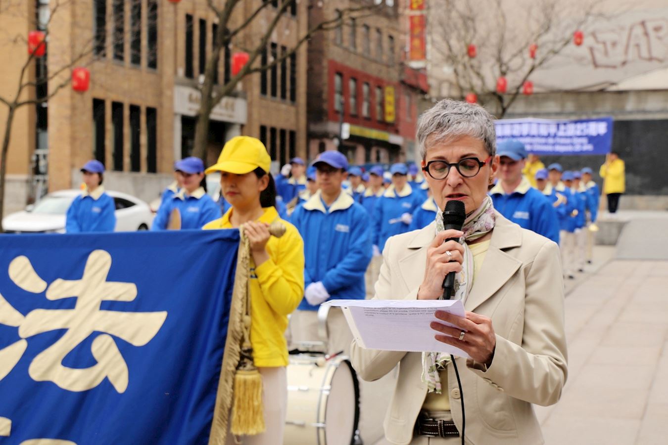 在集会上,法轮功学员代表用中、英、法三种语言发言,还原“四·二五”历史真相,并指出法轮功学员无畏强权、大善大忍的精神,是永恒的道德丰碑。
