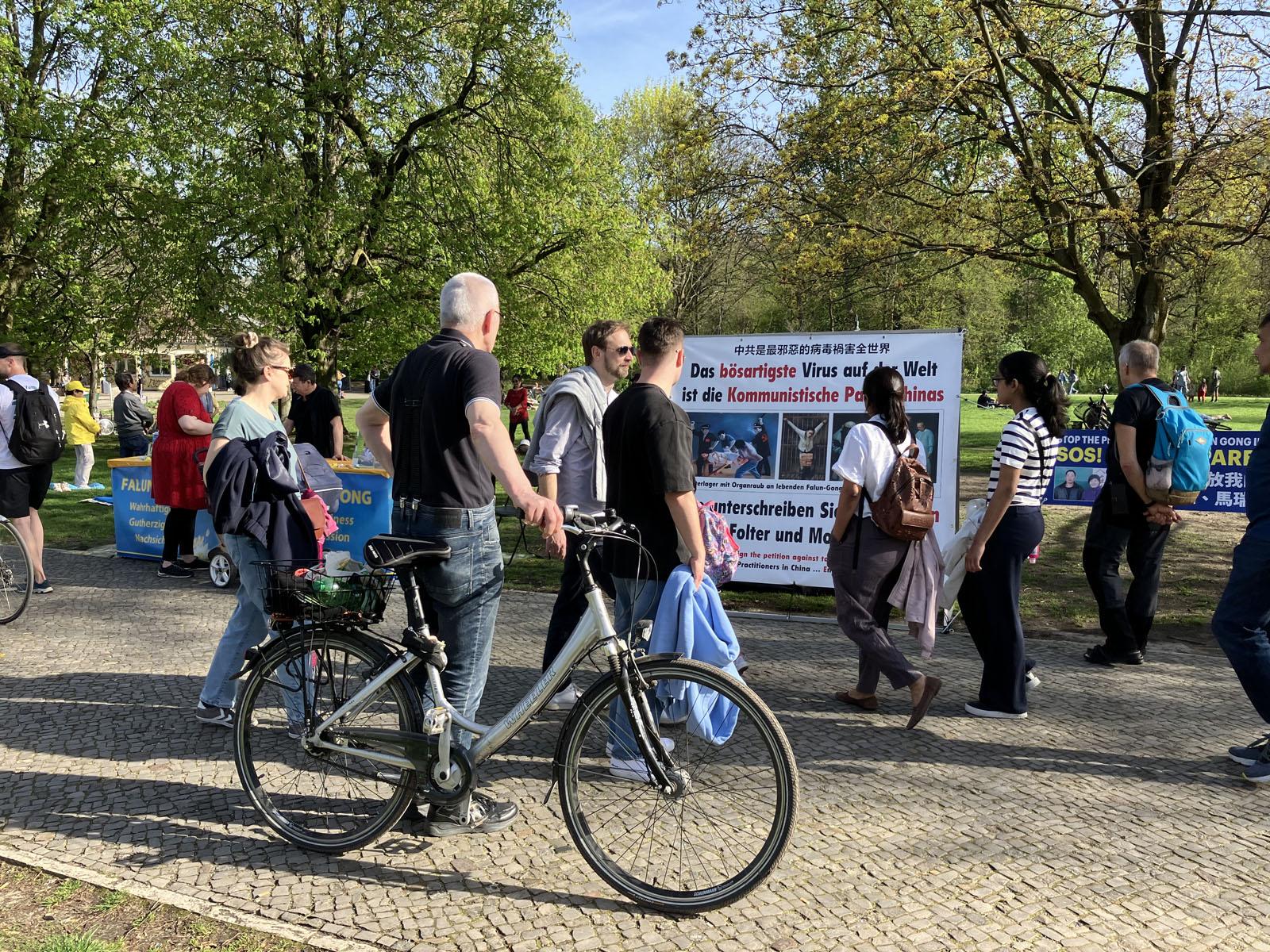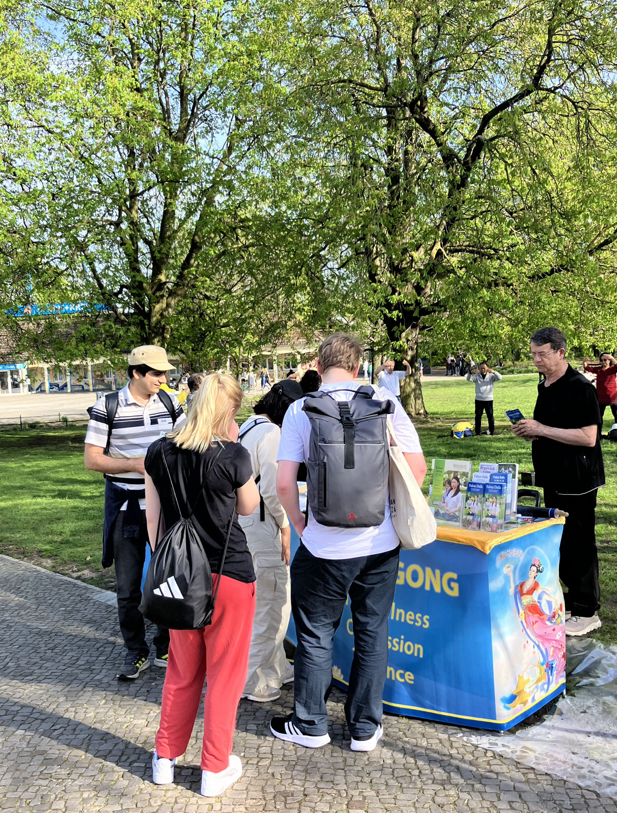 【明慧网二零二四年四月八日】“在哪里可以签名支持你们?”“请问在哪里可以学炼法轮功?“这都是三五成群的柏林市民进入东柏林特雷普托公园(Treptower Park)时,向法轮功学员们提出的问题。