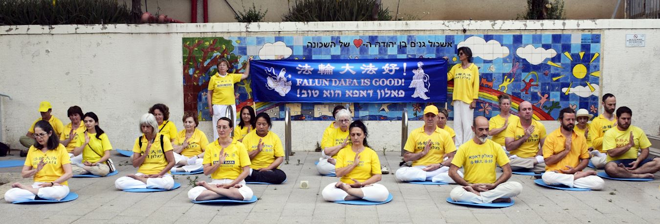 学员们展示出了以中文、英文和希伯来文的横幅,横幅上写着:“法轮大法好”、“法轮大法—真善忍”、“现在就立即停止虐杀没做任何错事的人!”、“一九九九年以来,法轮功学员在中国因坚持信仰而被迫害致死”、“二十五年前,中国的法轮功学员平和表达了在生活中遵循信仰的愿望”。
