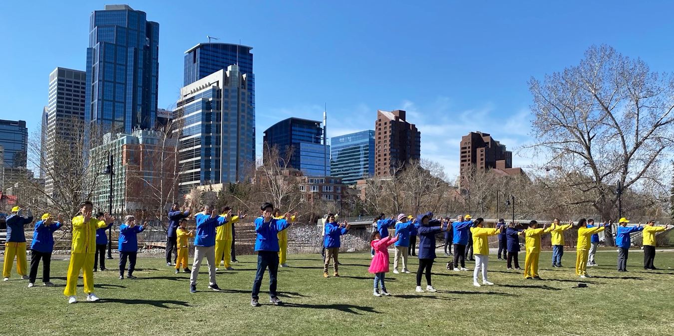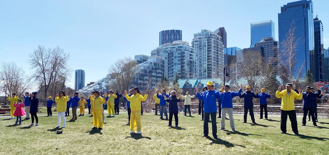 ![]() 图2~3:二零二四年四月二十八日,加拿大卡尔加里(Calgary)部分法轮功学员在市中心的王子岛公园集体炼功,庆祝世界法轮大法日。 |