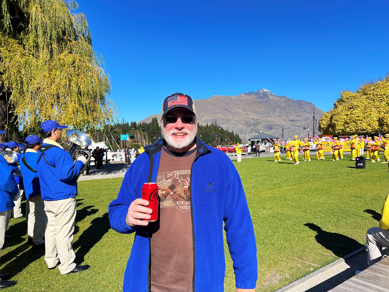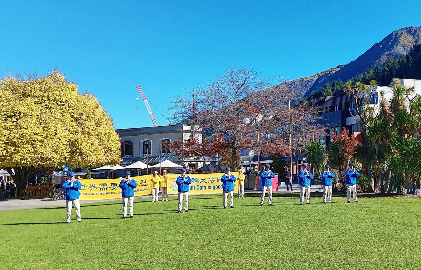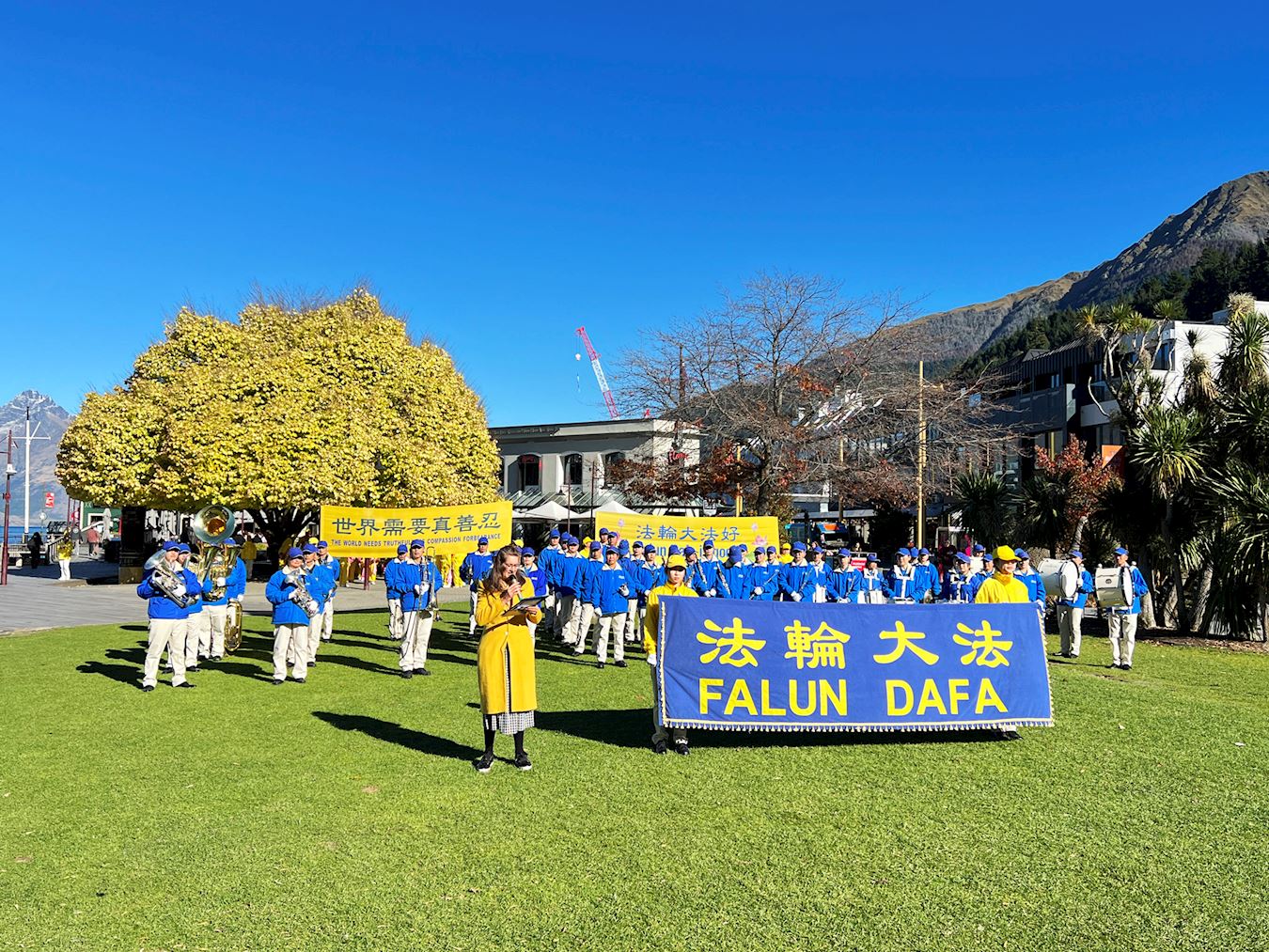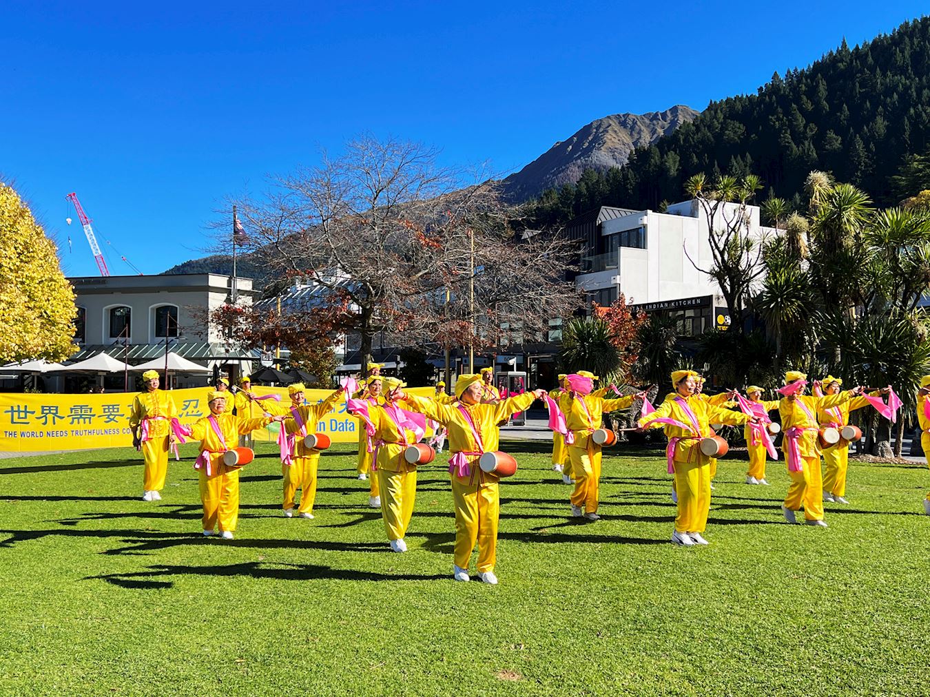 皇后镇位于新西兰南岛西南部,整个城市被非常壮观的群山环绕,远峰覆着白雪,湖水碧蓝悠远,景色变化万千,宛如仙境,成为了全新西兰乃至世界闻名的旅游度假胜地。活动当天,游人如织,来自世界各地的人们观看了由法轮功学员组成的天国乐团和腰鼓队的表演,了解了法轮大法的美好。