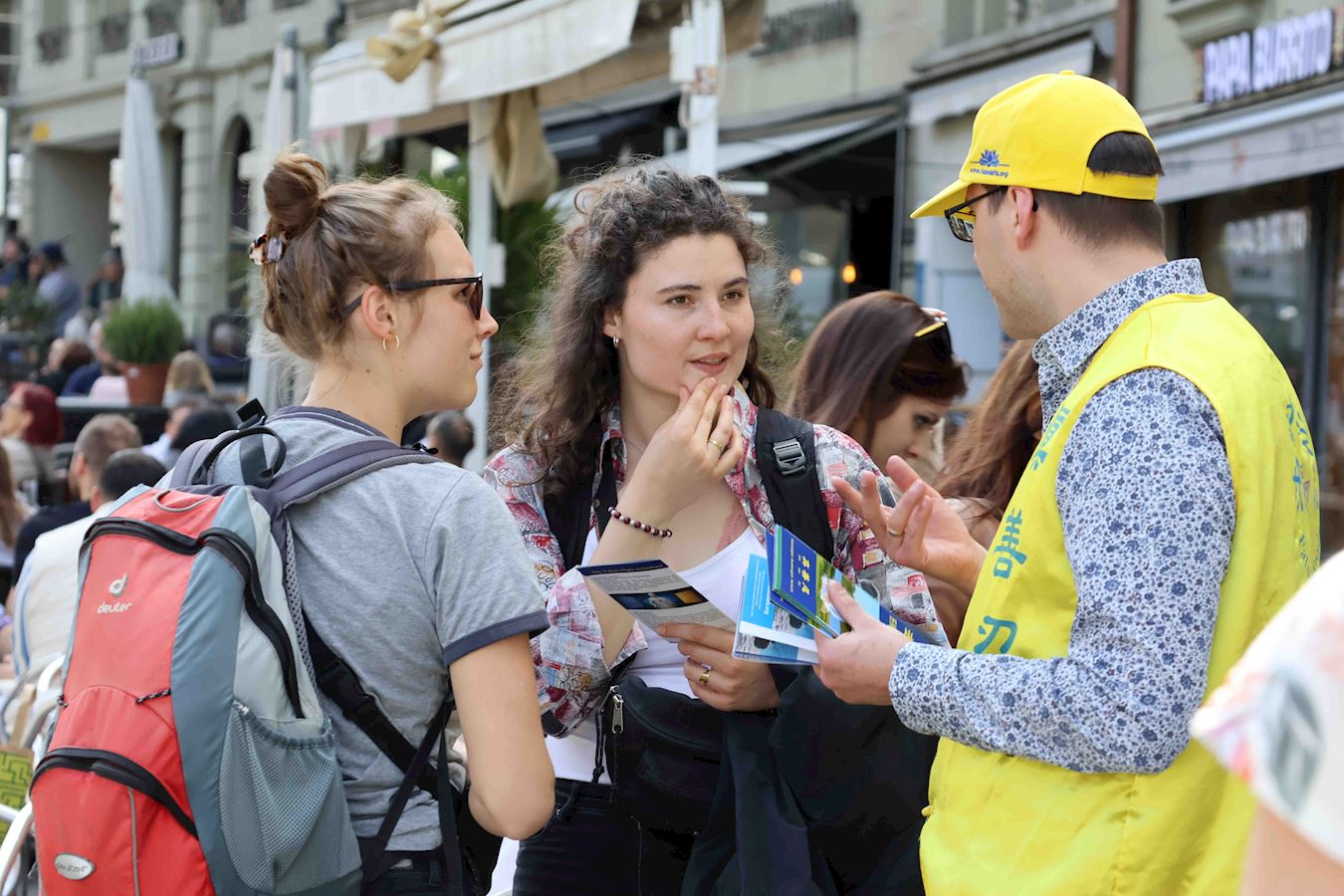 ![]() 图9~11:路人在接过真相资料后与学员交谈,了解更多真相 |