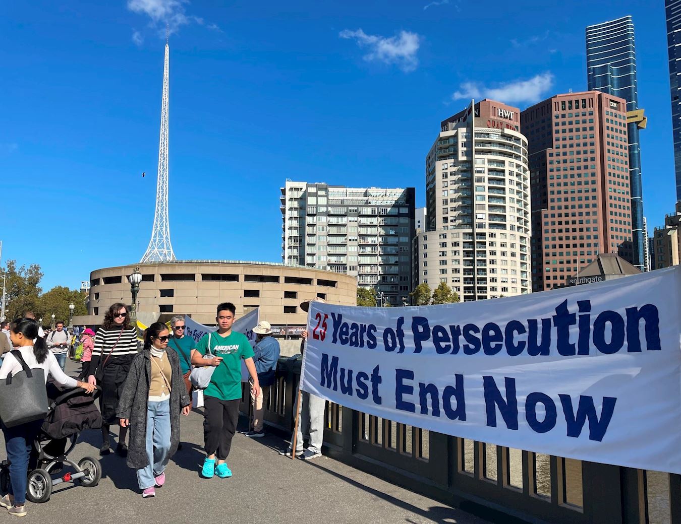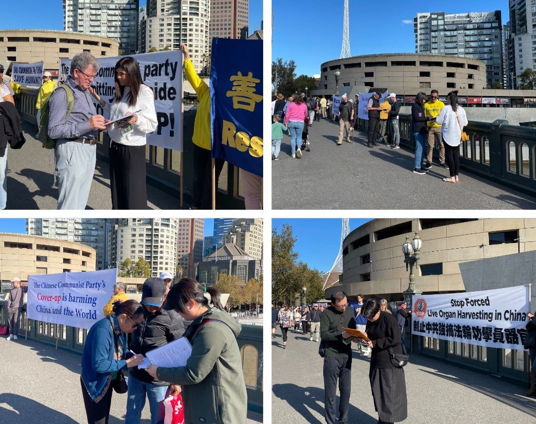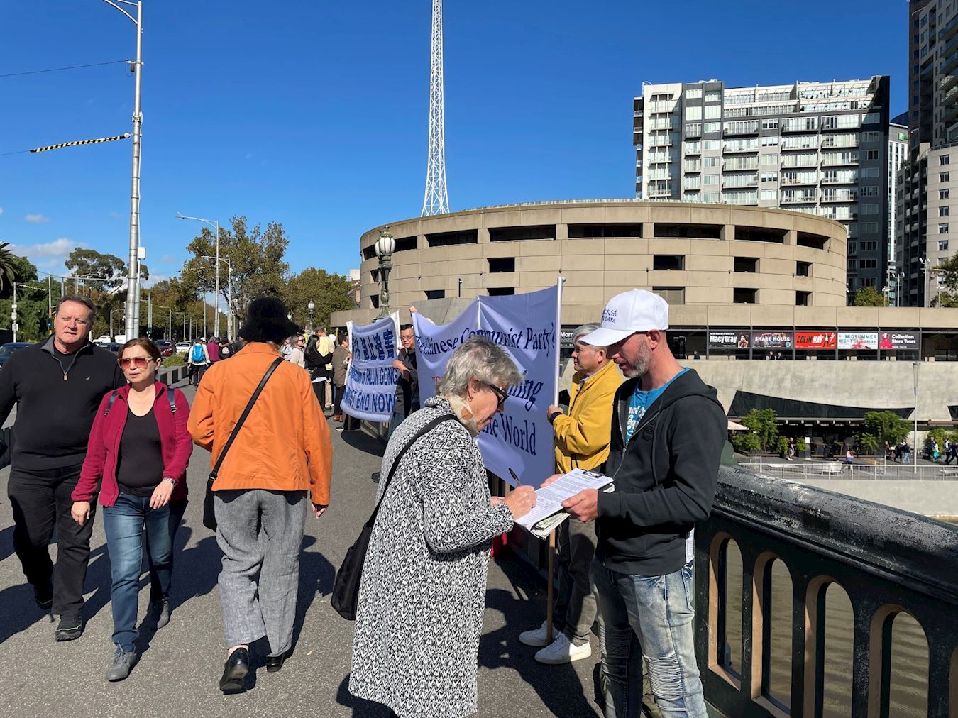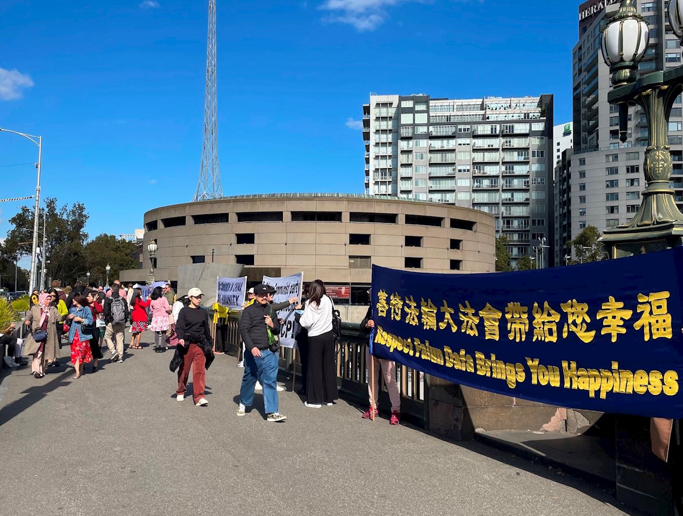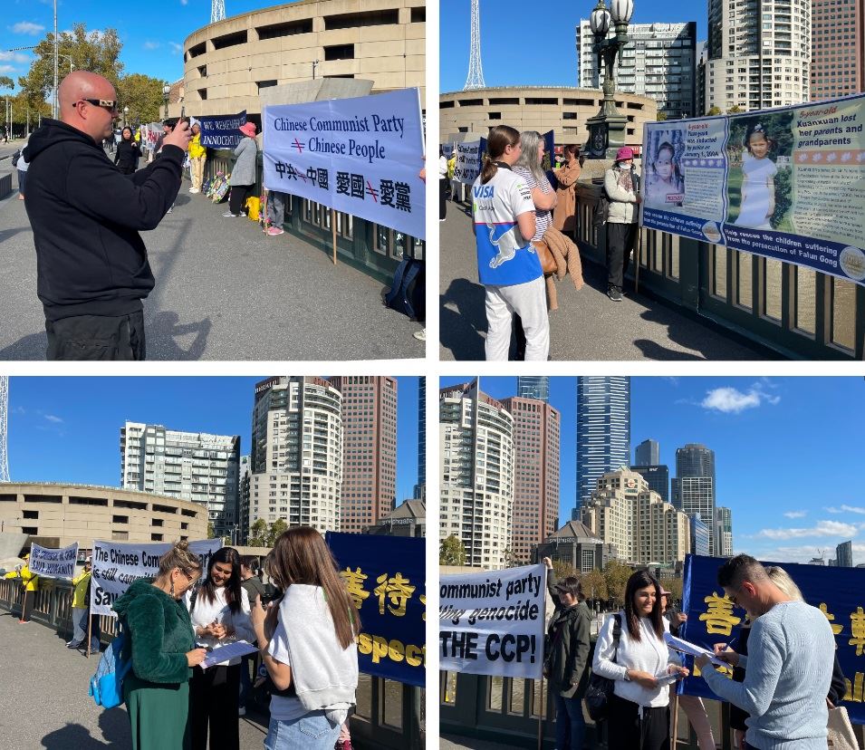 比邻中心火车站的王子桥,横跨雅拉河,有一百三十多年的历史,是墨尔本最繁忙的路段之一,终年游人不断。排列在桥面两端的法轮功真相横幅,在秋季温暖的阳光下显得很醒目。