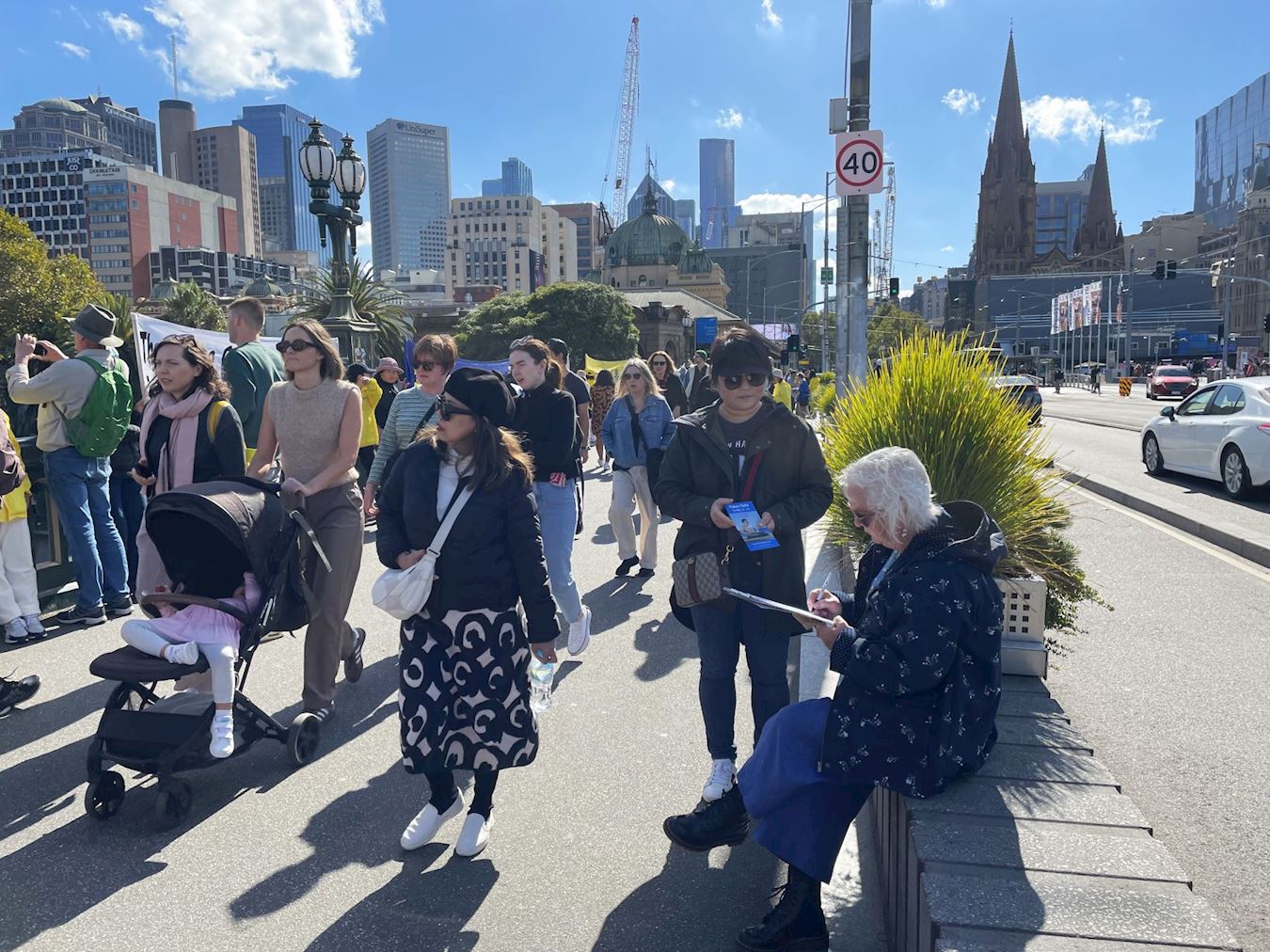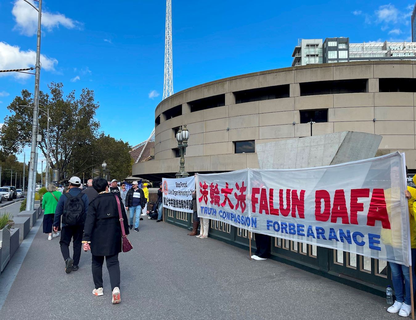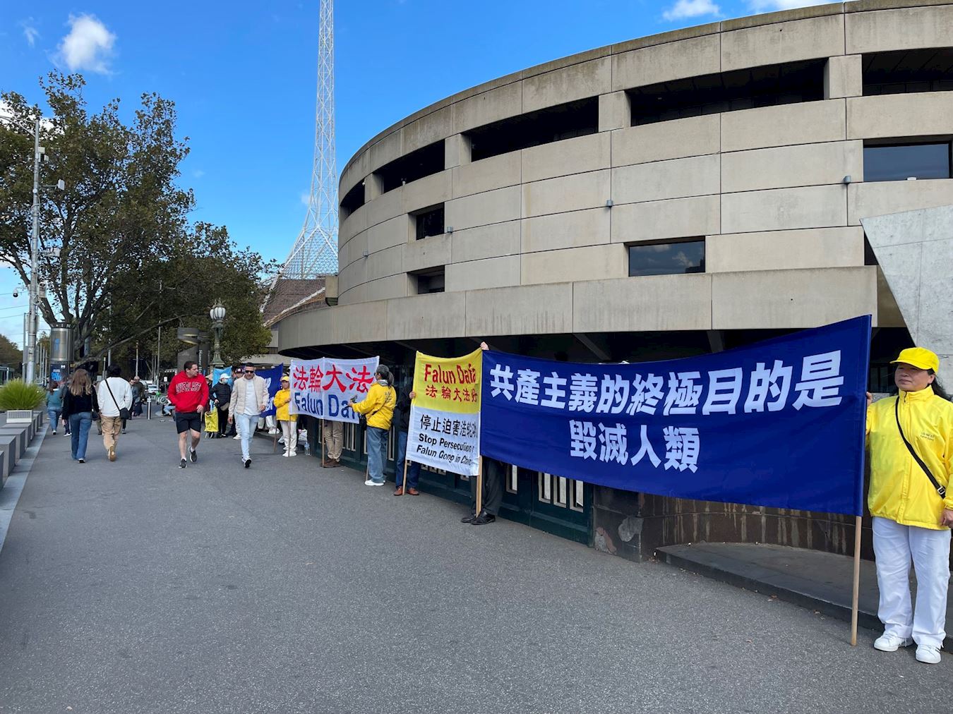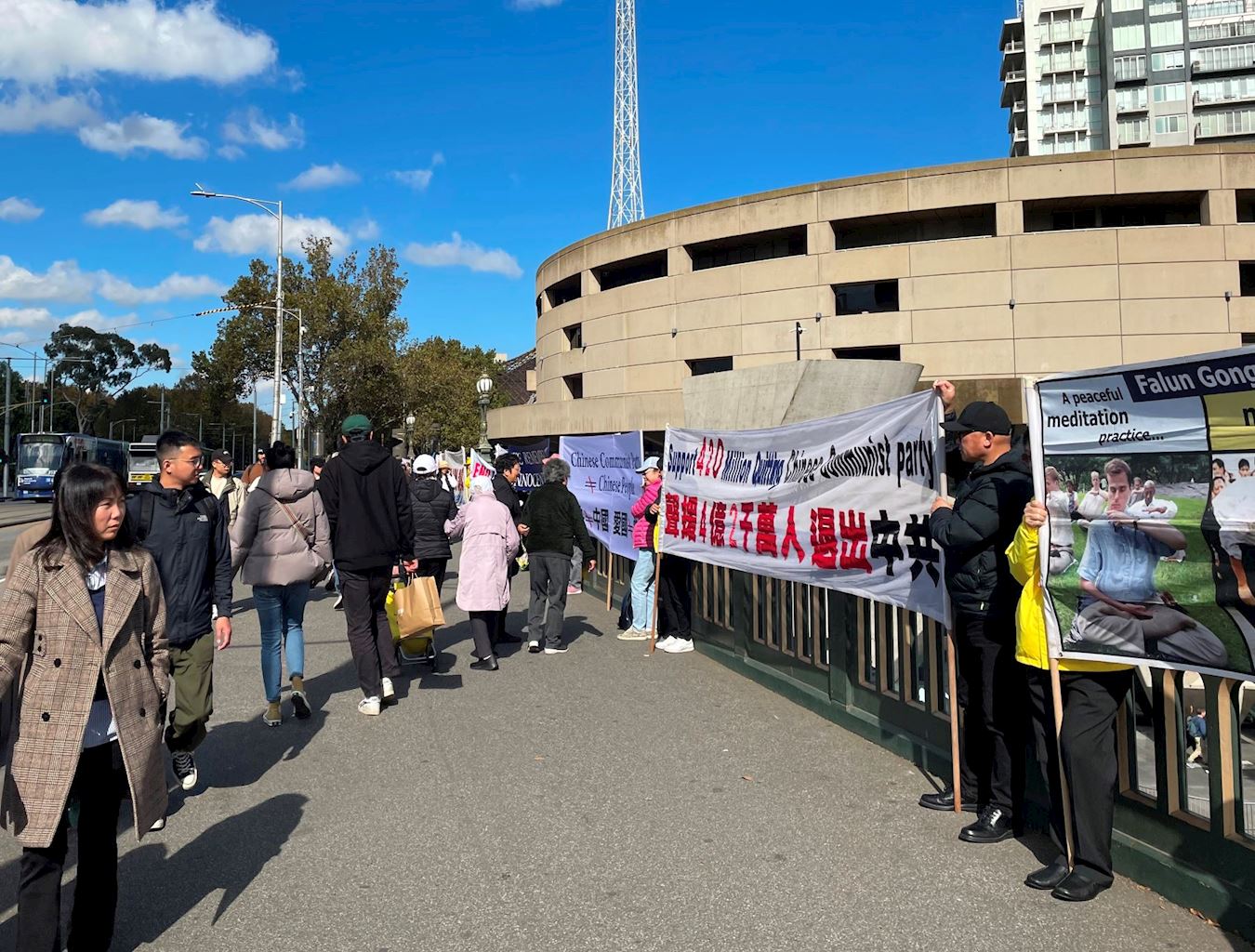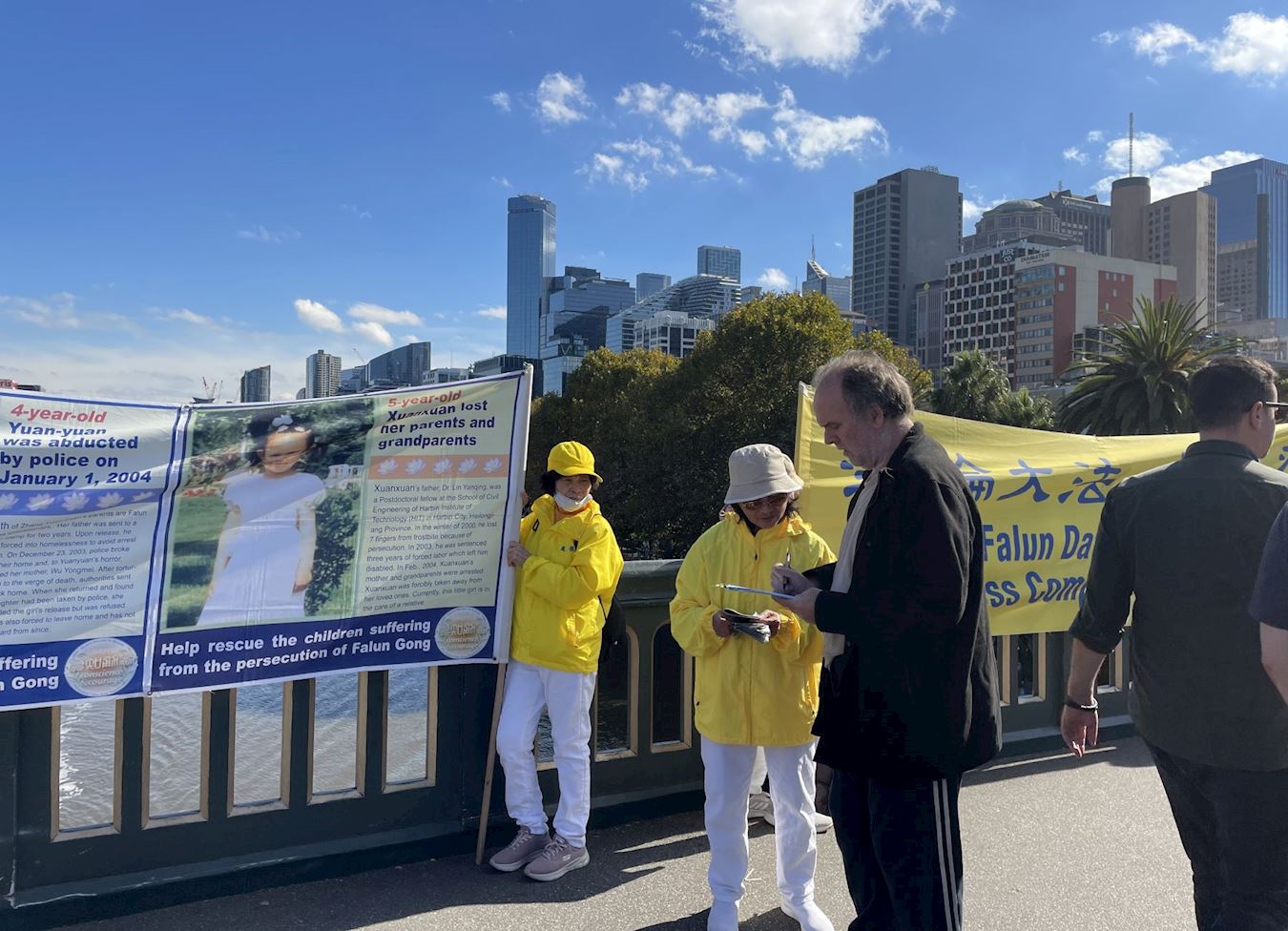 比邻中心火车站的王子桥,横跨雅拉河,有一百三十多年的历史,是墨尔本最繁忙的路段之一,终年游人不断。排列在桥面两端的法轮功真相横幅,在秋季温暖的阳光下显得很醒目。