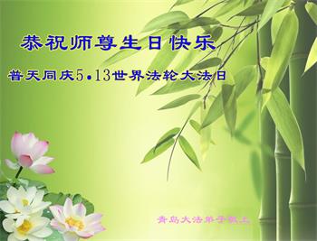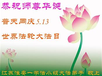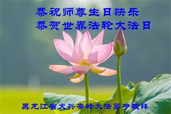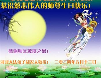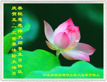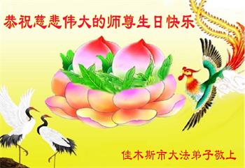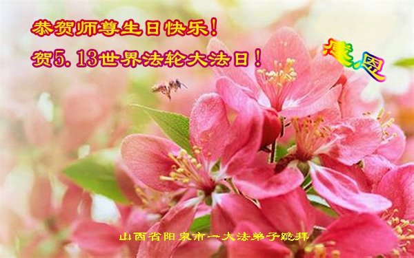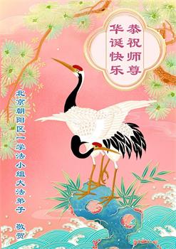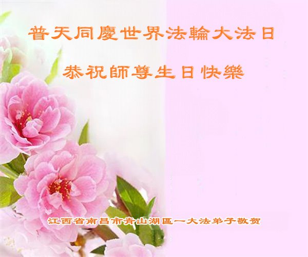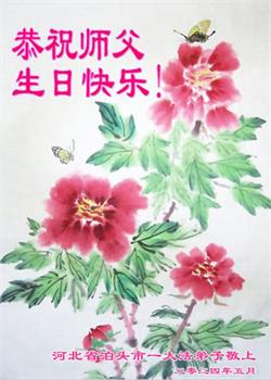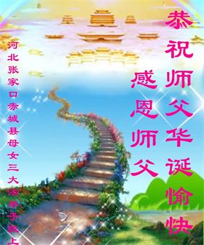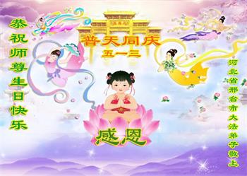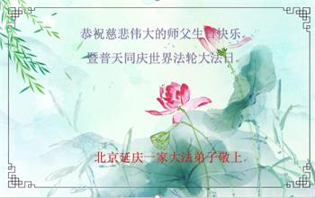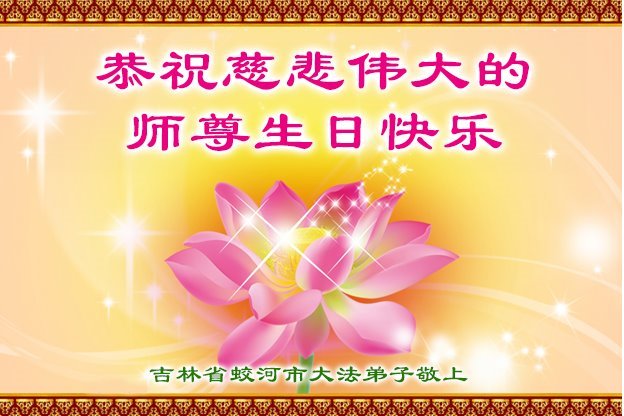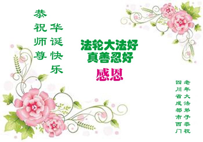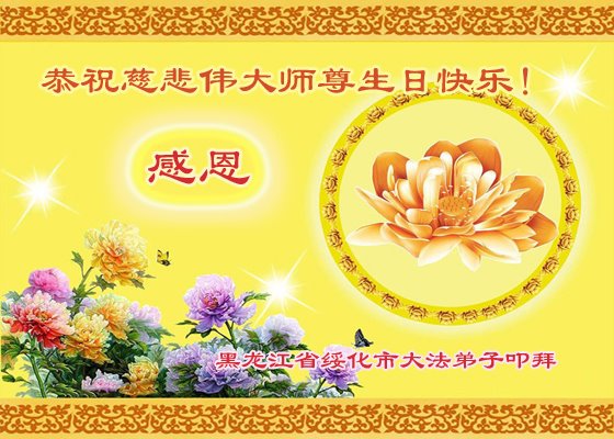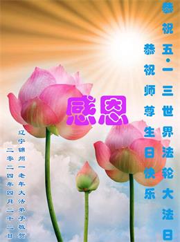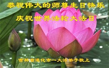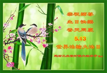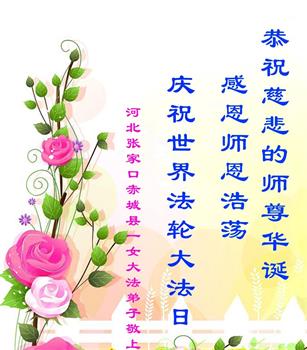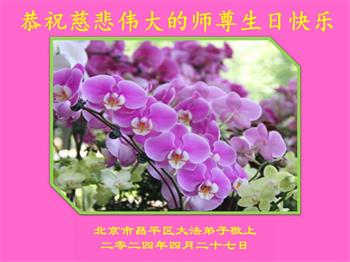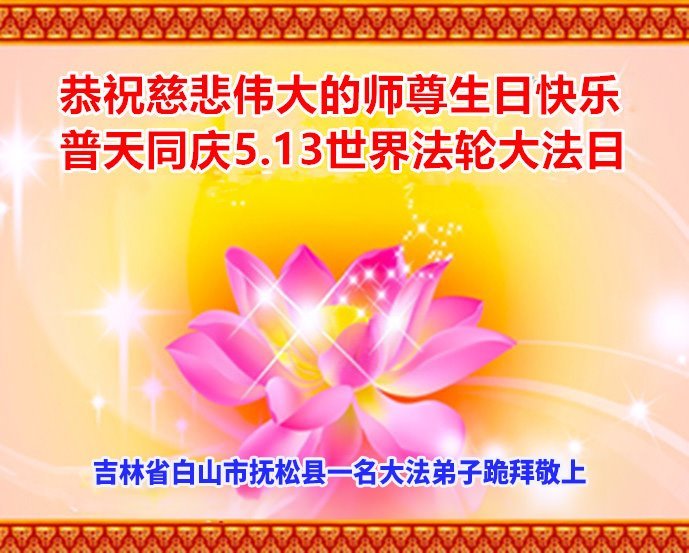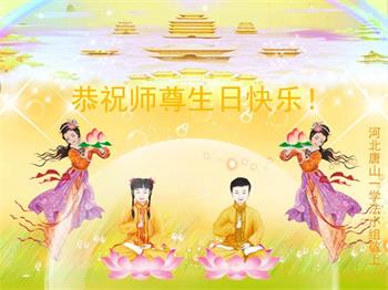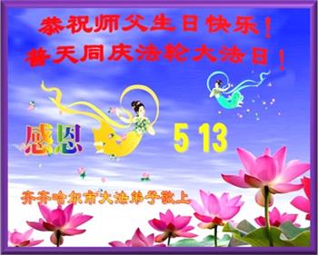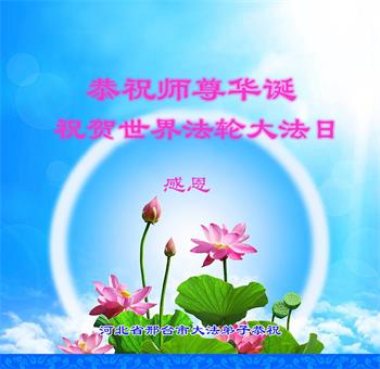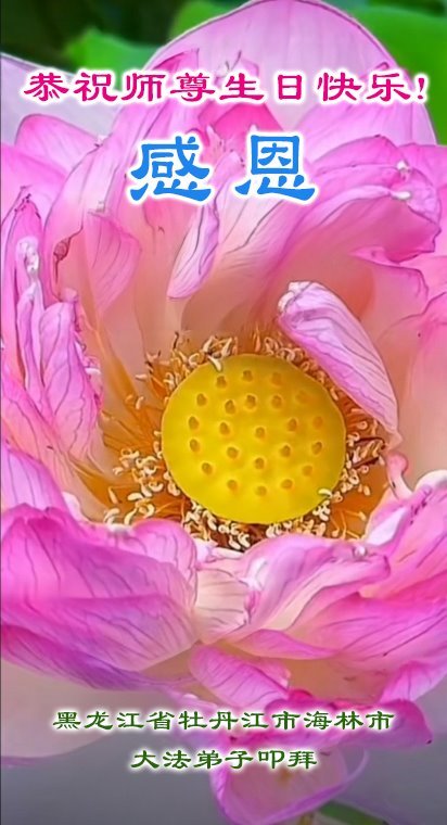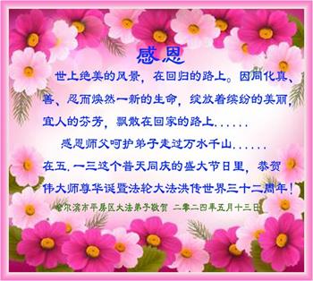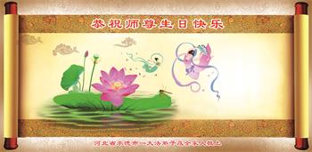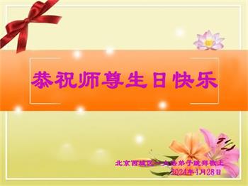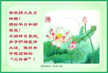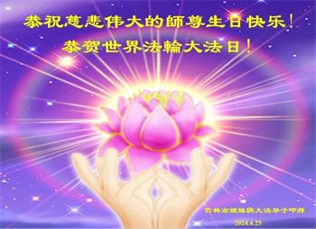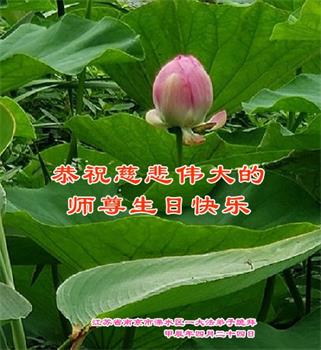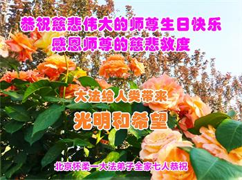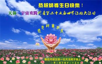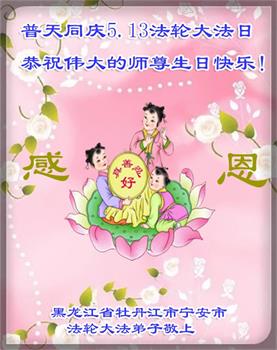北京市一名硕士研究生说:“我就读于北京某师范院校,是一名即将毕业的硕士研究生。近日我陷入难关后,因为常念‘法轮大法好,真善忍好’,感受到大法赐予我智慧与力量!我深感师父的慈悲苦度。在此我深怀感恩之心,恭贺世界法轮大法日!恭祝大法师父生日快乐!”
