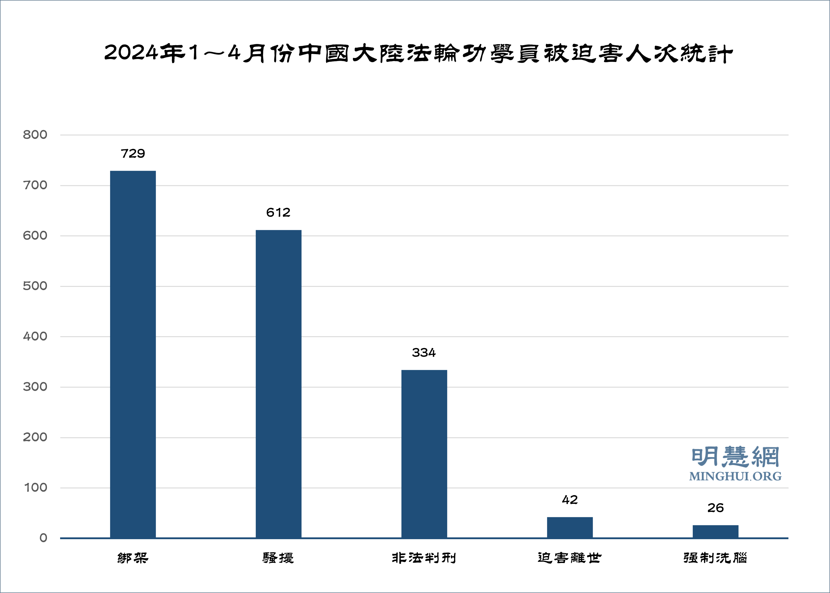 ![]() 图1:2024年1~4月份中国大陆法轮功学员被迫害人次统计 |