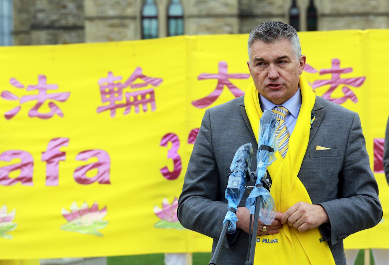 国会国防常务委员会副主席、资深保守党国会议员詹姆斯·贝赞(James Bezan)在发言中祝愿在场的法轮功学员“法轮大法日”快乐,他说:“在此庆祝法轮大法(弘传)三十二周年,我要感谢你们的坚韧不拔,年复一年地来到这里,提出你们的诉求,确保所有加拿大人了解法轮功修炼者在中国所遭受的(非法)起诉与迫害。”
