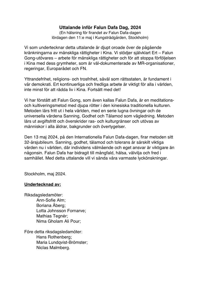 八位瑞典政要给法轮功学员发来联合贺信,贺信译文如下: