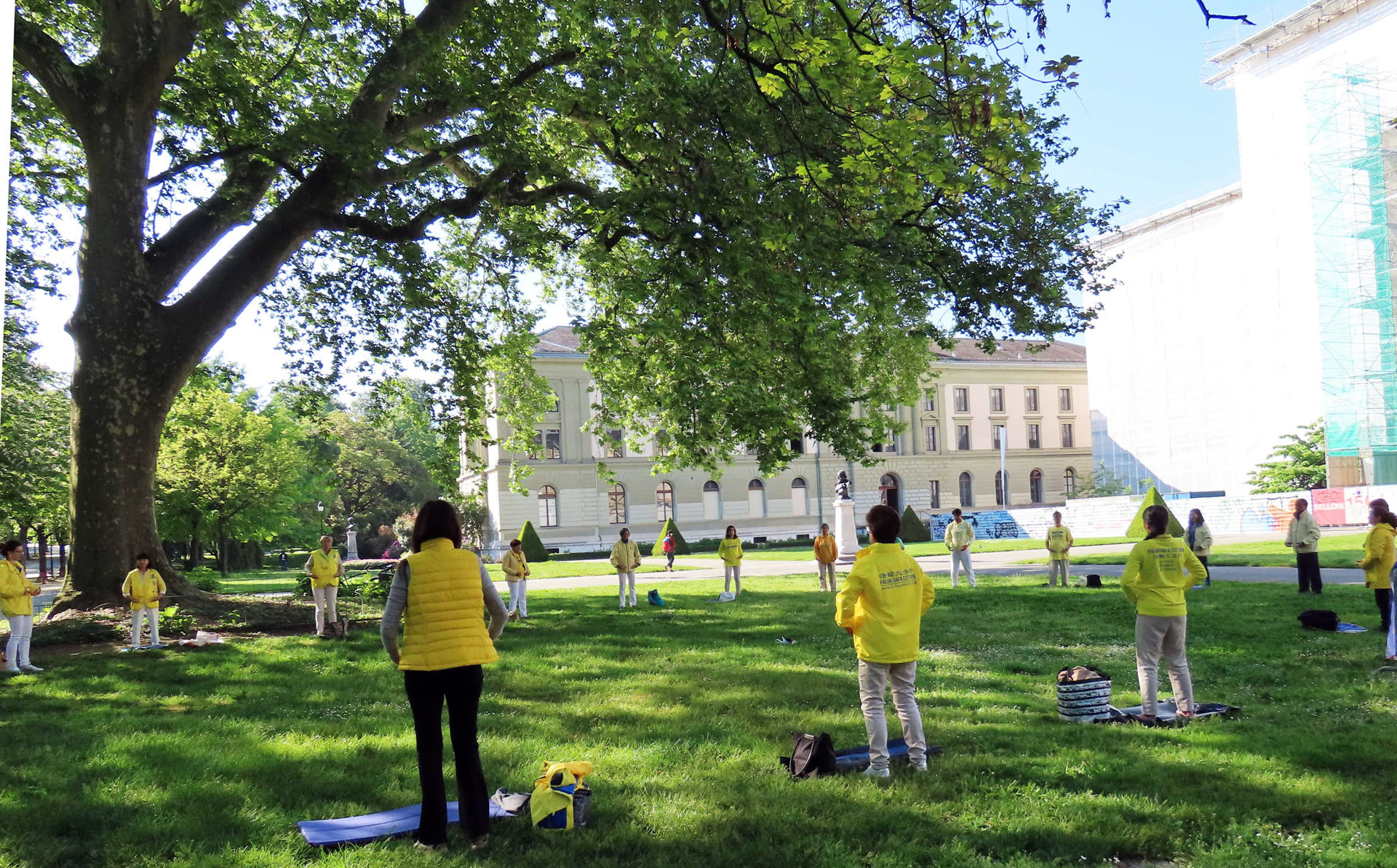 ![]() 图2:学员们在著名的巴士雄公园(parc de Bastions)里集体炼功,展示法轮大法的美好。 |