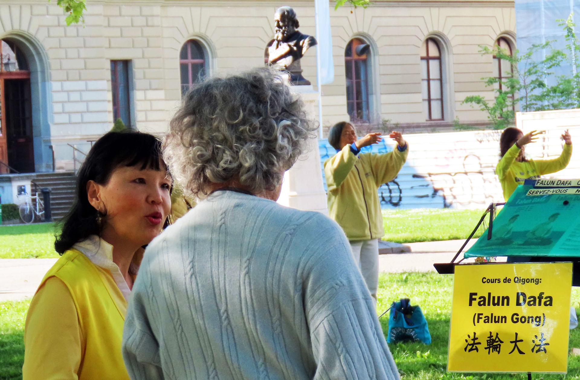 ![]() 图3:人们向学员了解法轮功真相。 |