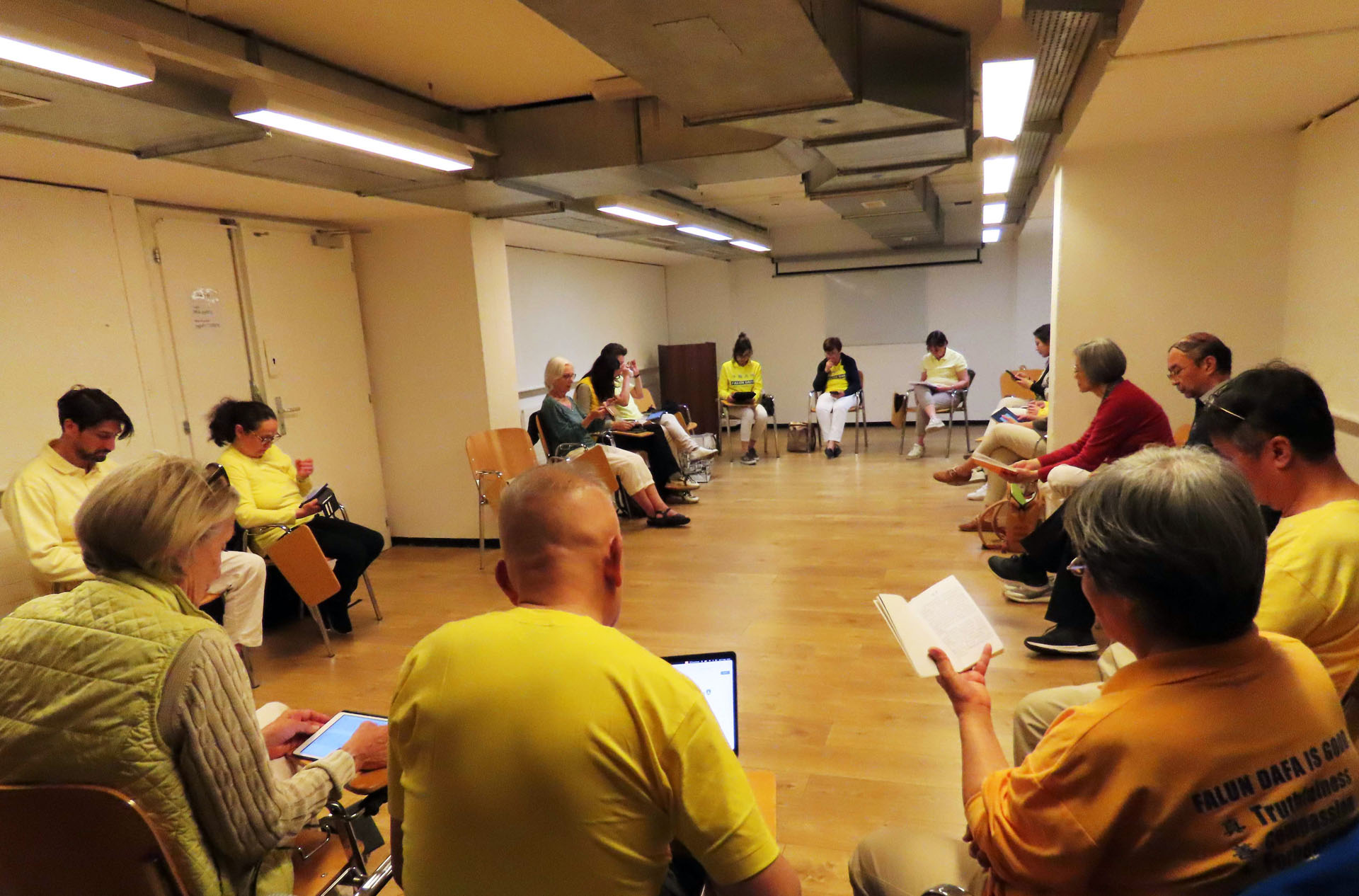 当天下午,法轮功学员们集体学法,并且交流了在项目中实修的体验。