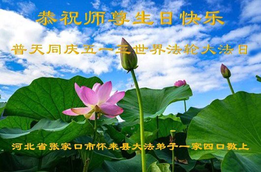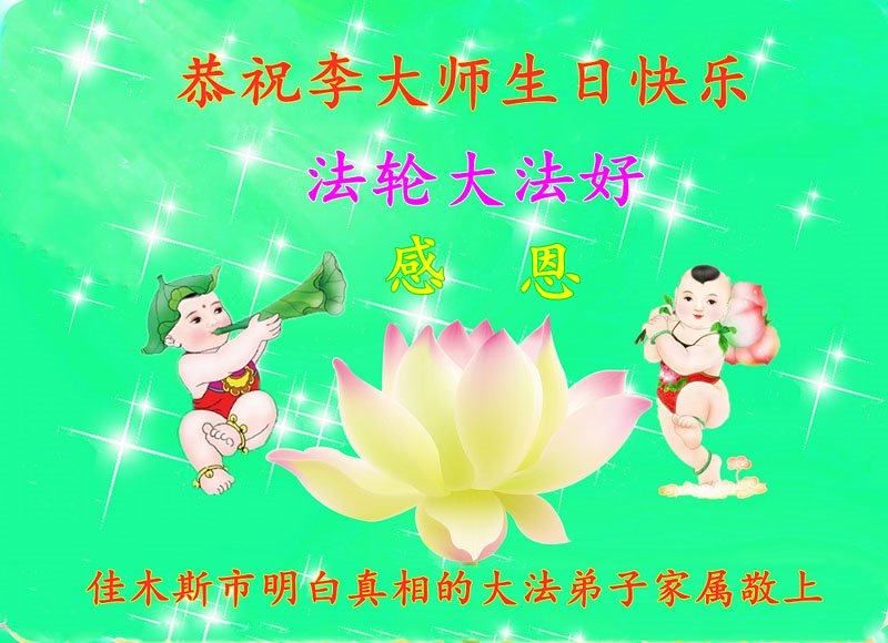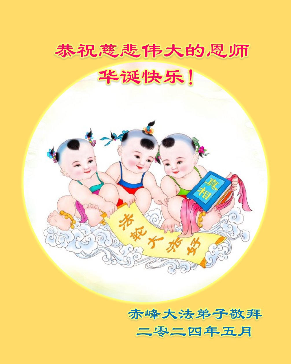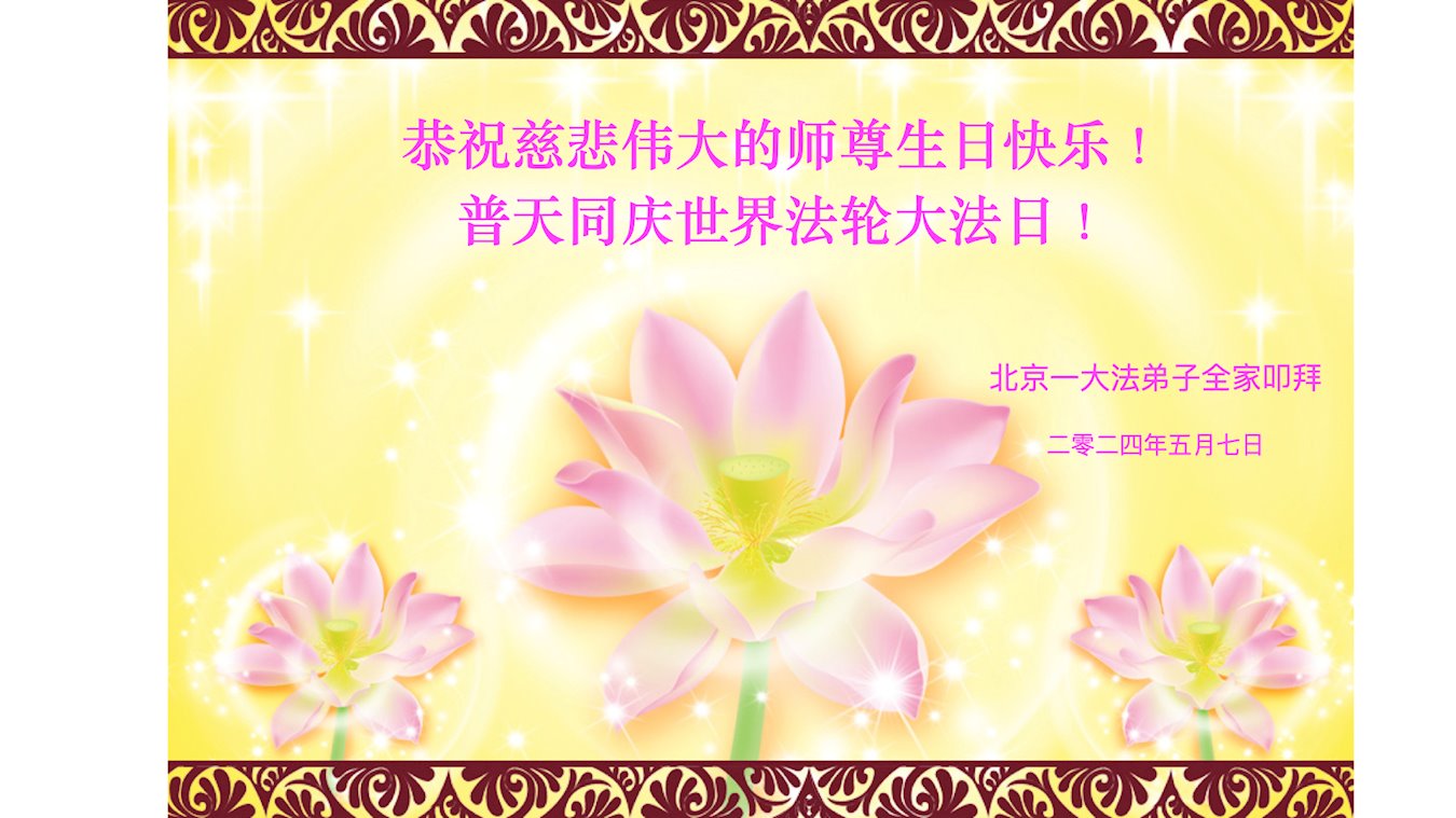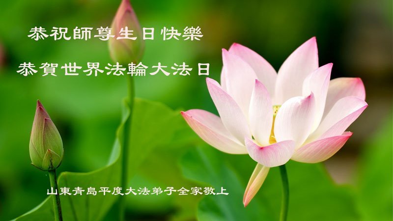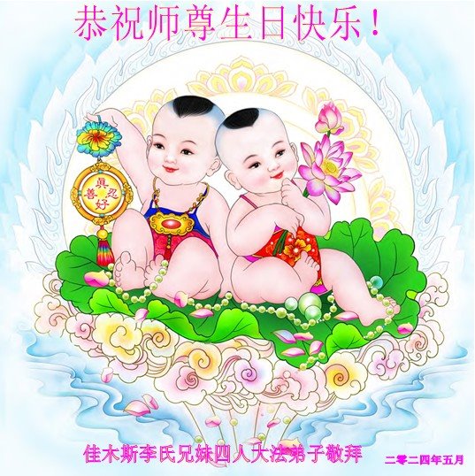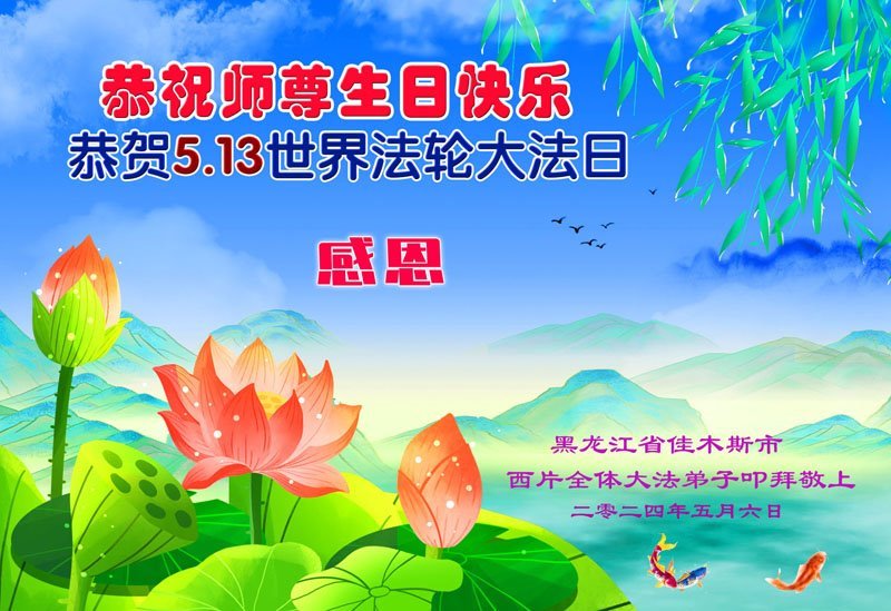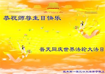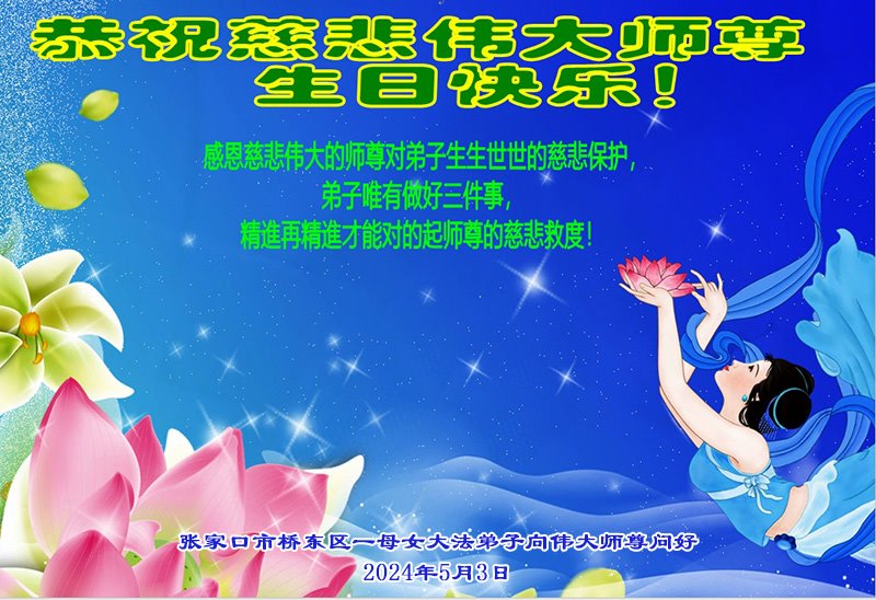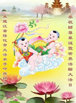 我是年轻妈妈,炼功四月有余,感受到大法的超常与神奇,身体与身心都得到了净化,谢谢师父的慈悲救度。我代表修炼多年的婆婆还有小弟子及全家人恭祝师尊生日快乐! 感谢师尊的慈悲救度,感谢对我们全家人的呵护,我要好好修,我们全家人都想跟您回家。