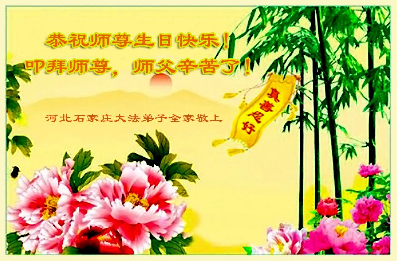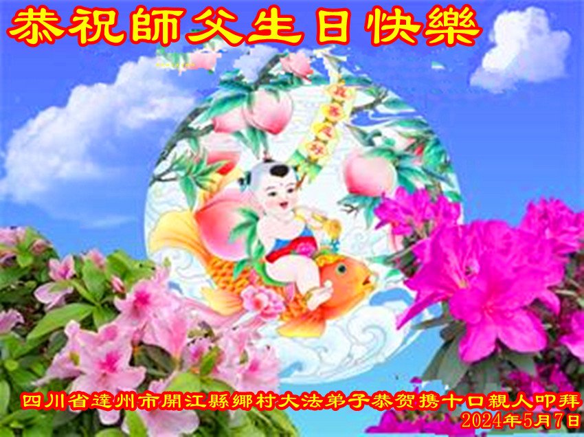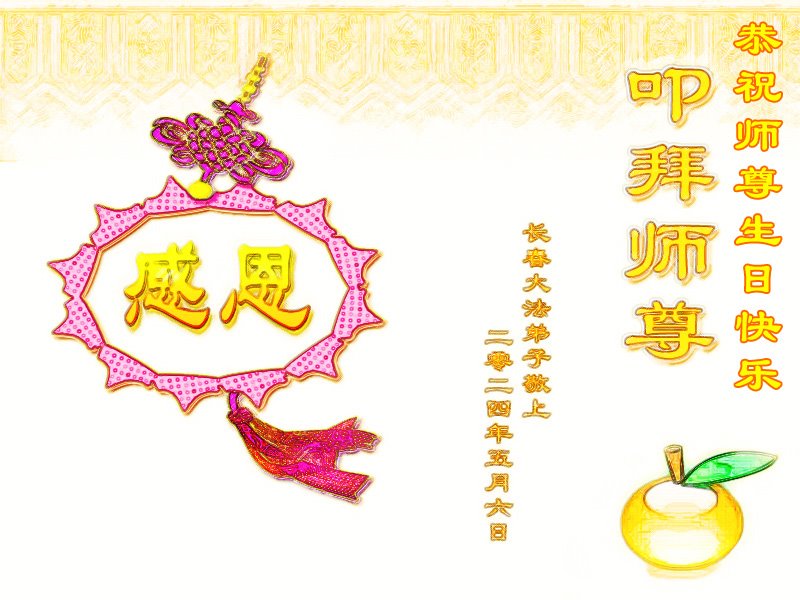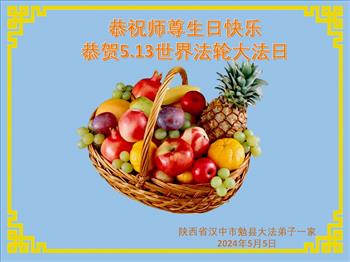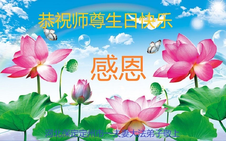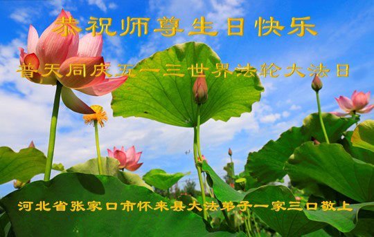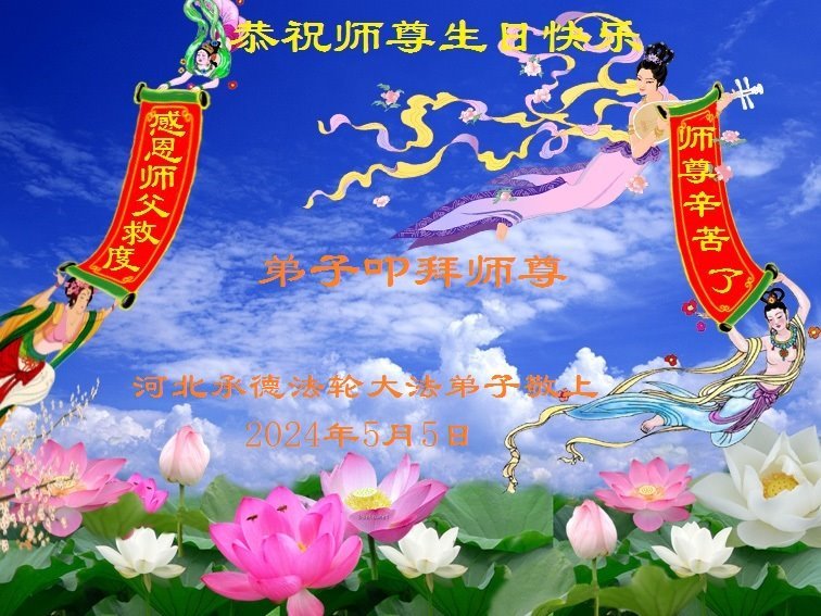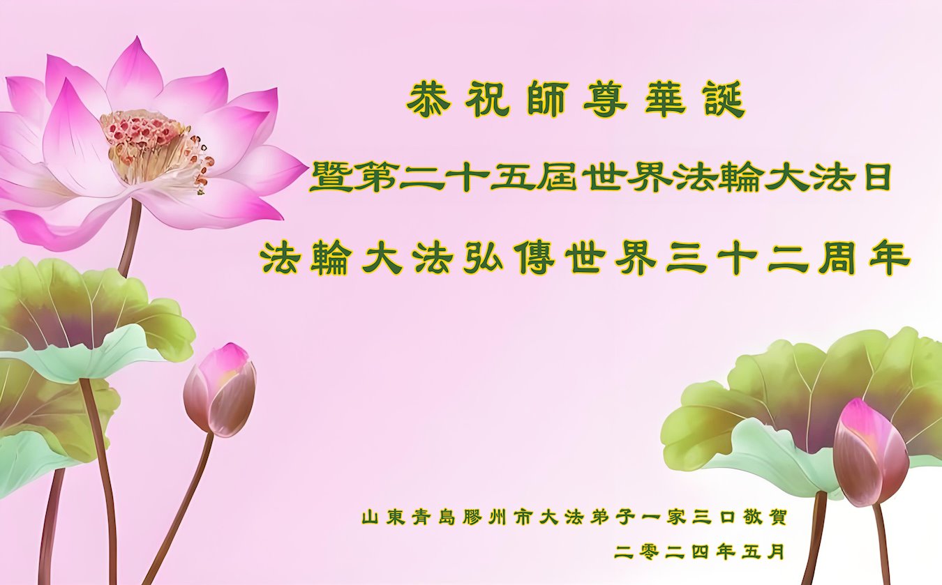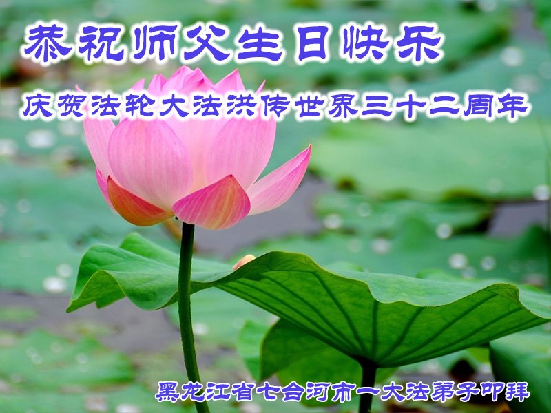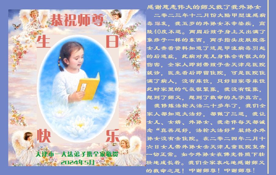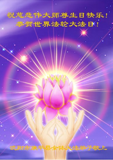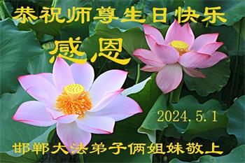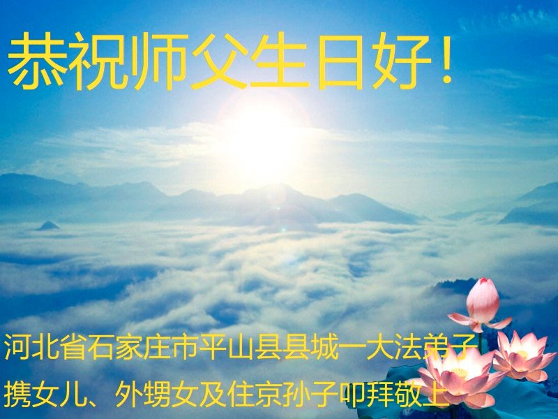 我是年轻妈妈,炼功四月有余,感受到大法的超常与神奇,身体与身心都得到了净化,谢谢师父的慈悲救度。我代表修炼多年的婆婆还有小弟子及全家人恭祝师尊生日快乐! 感谢师尊的慈悲救度,感谢对我们全家人的呵护,我要好好修,我们全家人都想跟您回家。