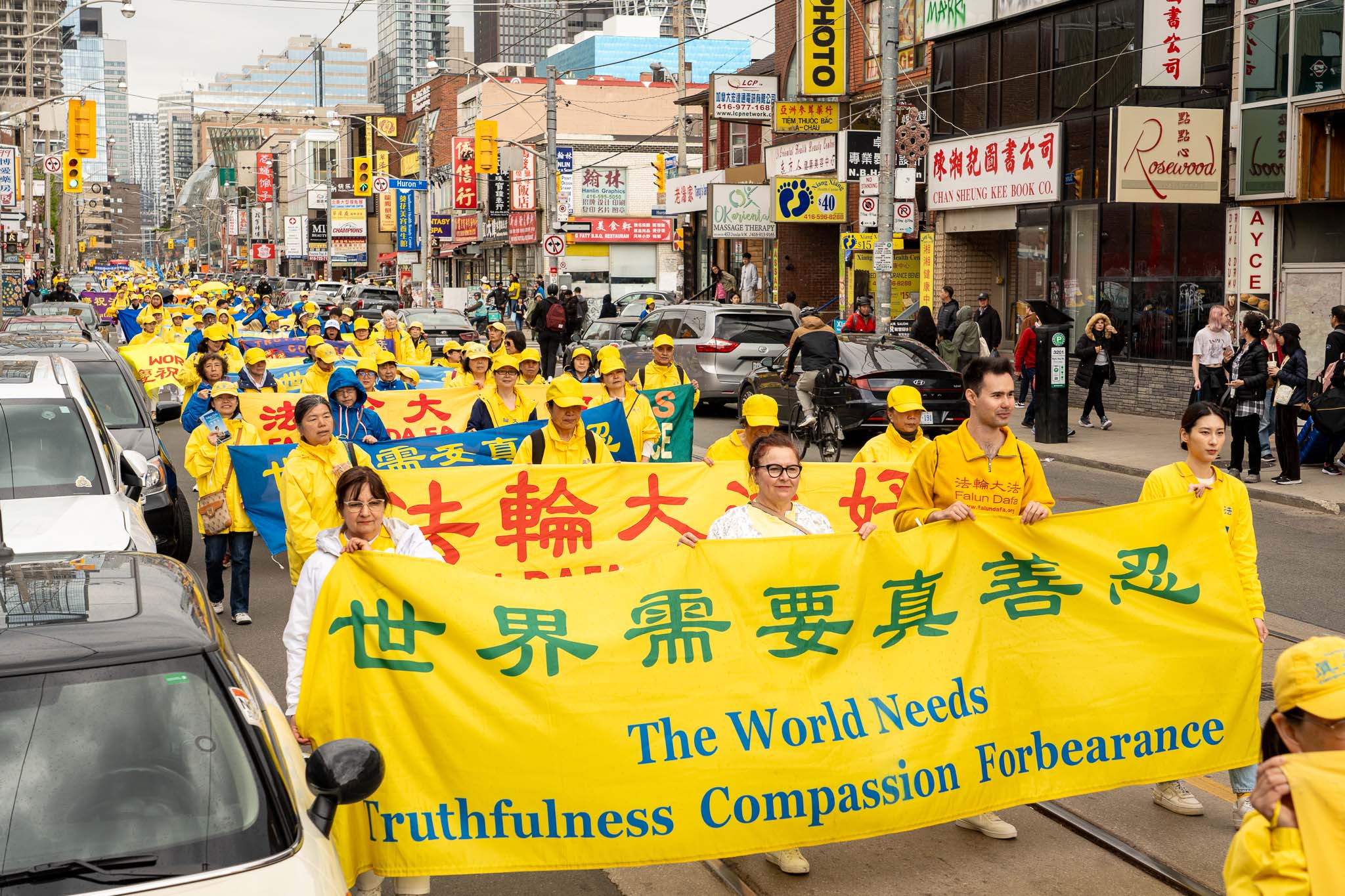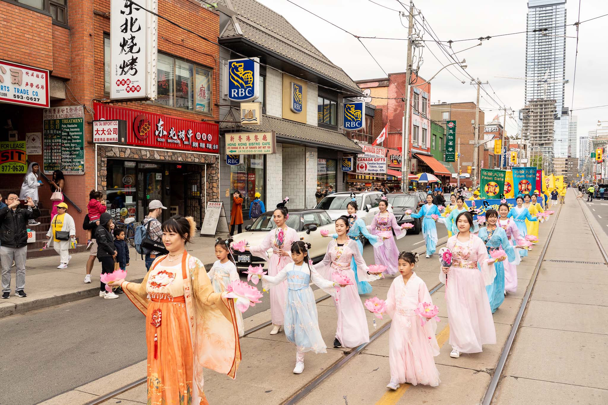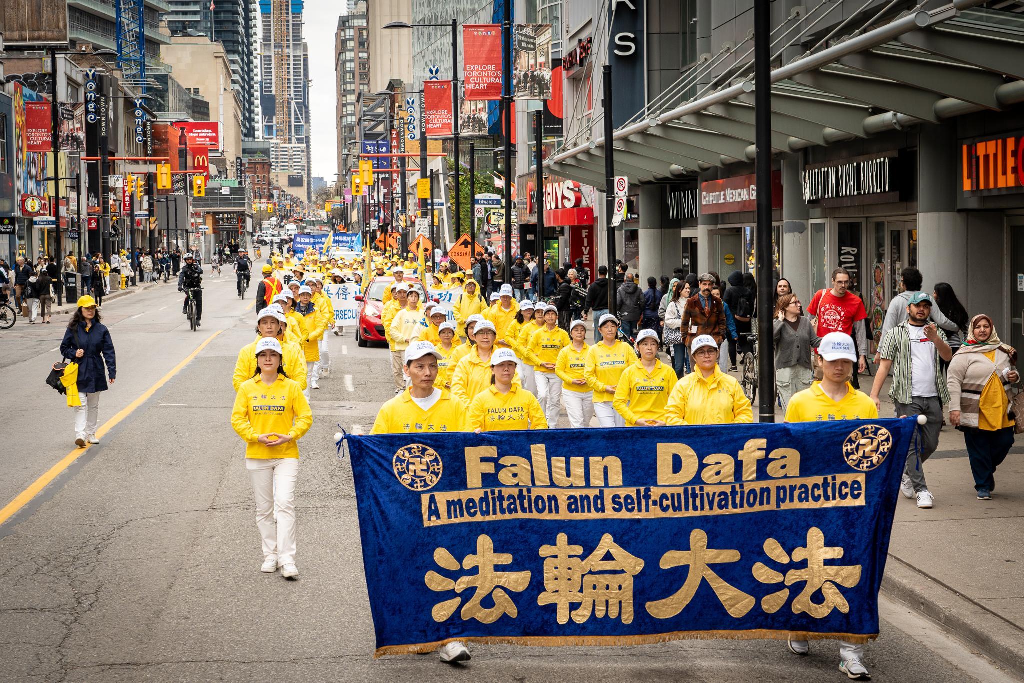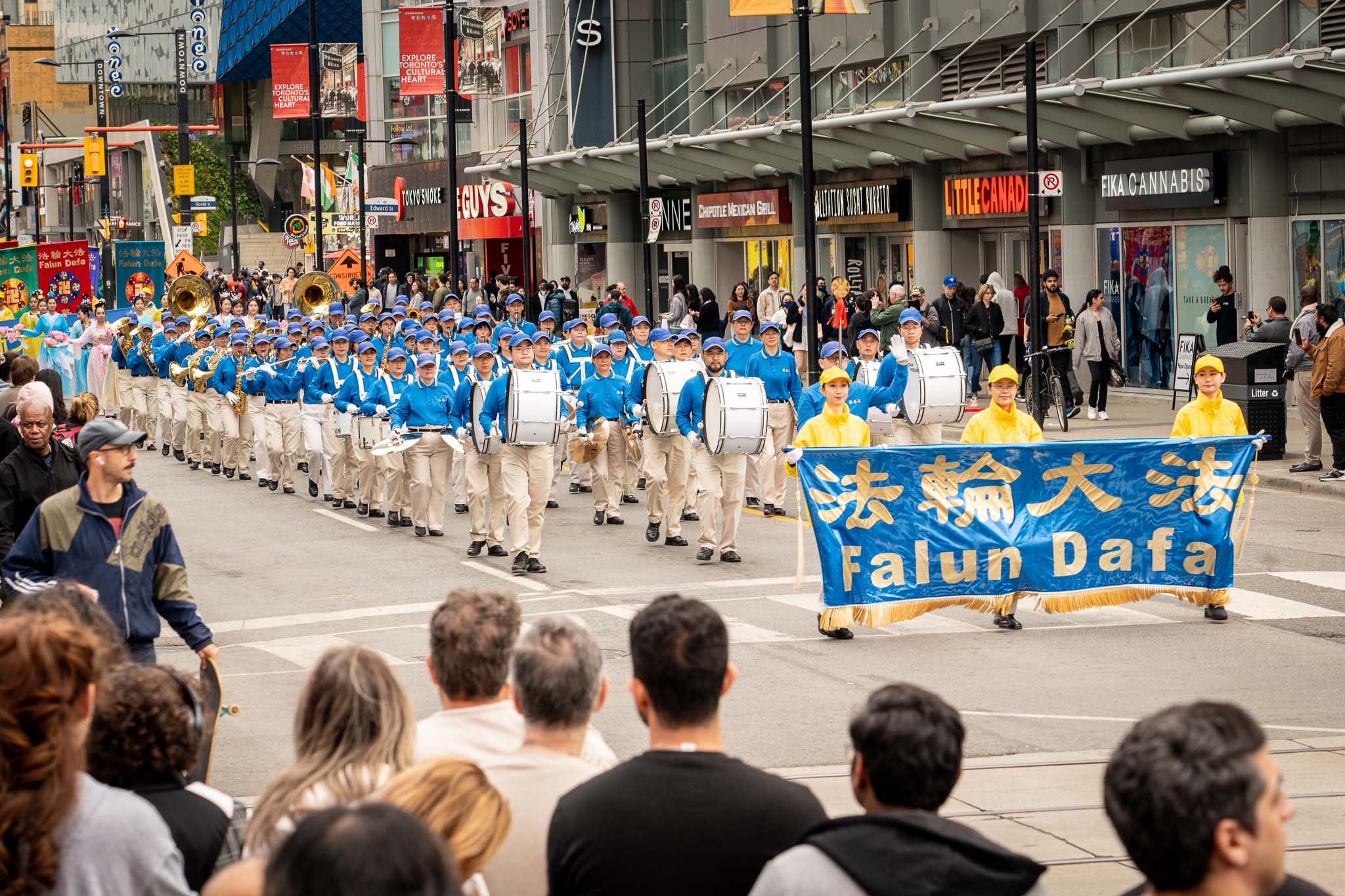 五月春日的街道上,树木正长出新叶。居民与游客们纷纷在外抖擞精神、活动筋骨,恰逢游行队伍经过,便高兴地与学员们共同庆祝节日。色彩明亮的游行队伍从格兰奇木头玩具公园(Grange Park)出发,穿过了市中心多个热门景点,包括唐人街、多伦多大学、安大略美术馆、伊顿中心以及加拿大最繁华的登打士广场。