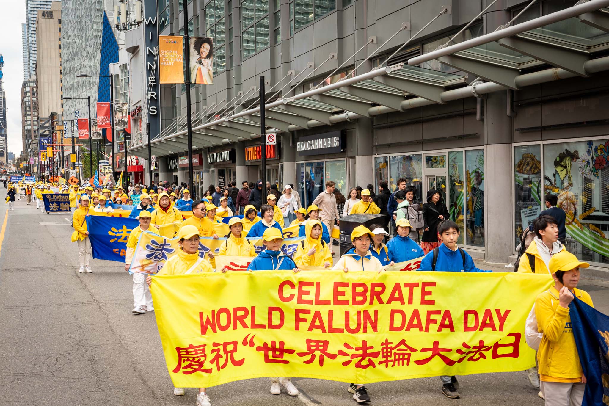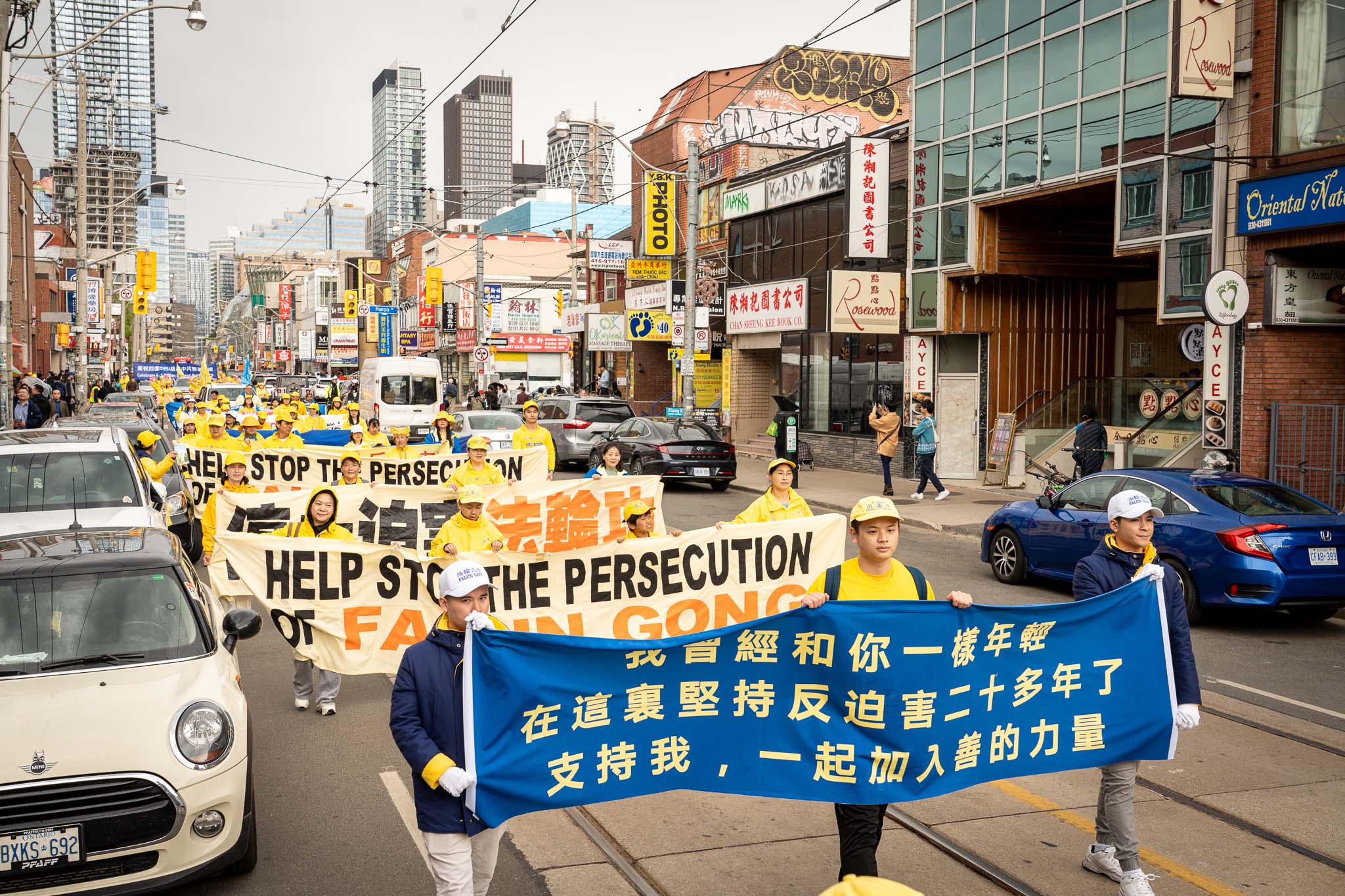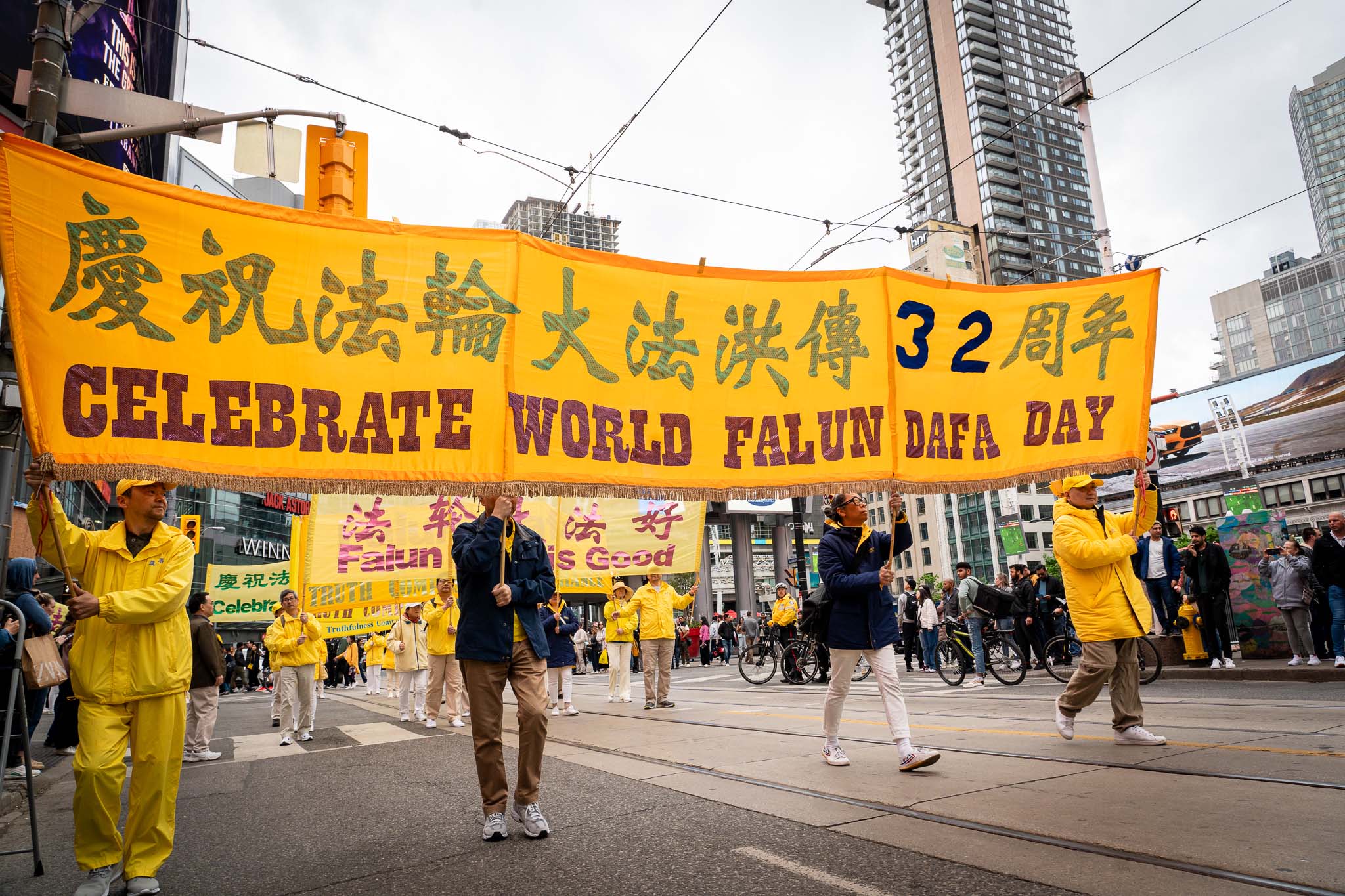 五月春日的街道上,树木正长出新叶。居民与游客们纷纷在外抖擞精神、活动筋骨,恰逢游行队伍经过,便高兴地与学员们共同庆祝节日。色彩明亮的游行队伍从格兰奇木头玩具公园(Grange Park)出发,穿过了市中心多个热门景点,包括唐人街、多伦多大学、安大略美术馆、伊顿中心以及加拿大最繁华的登打士广场。
