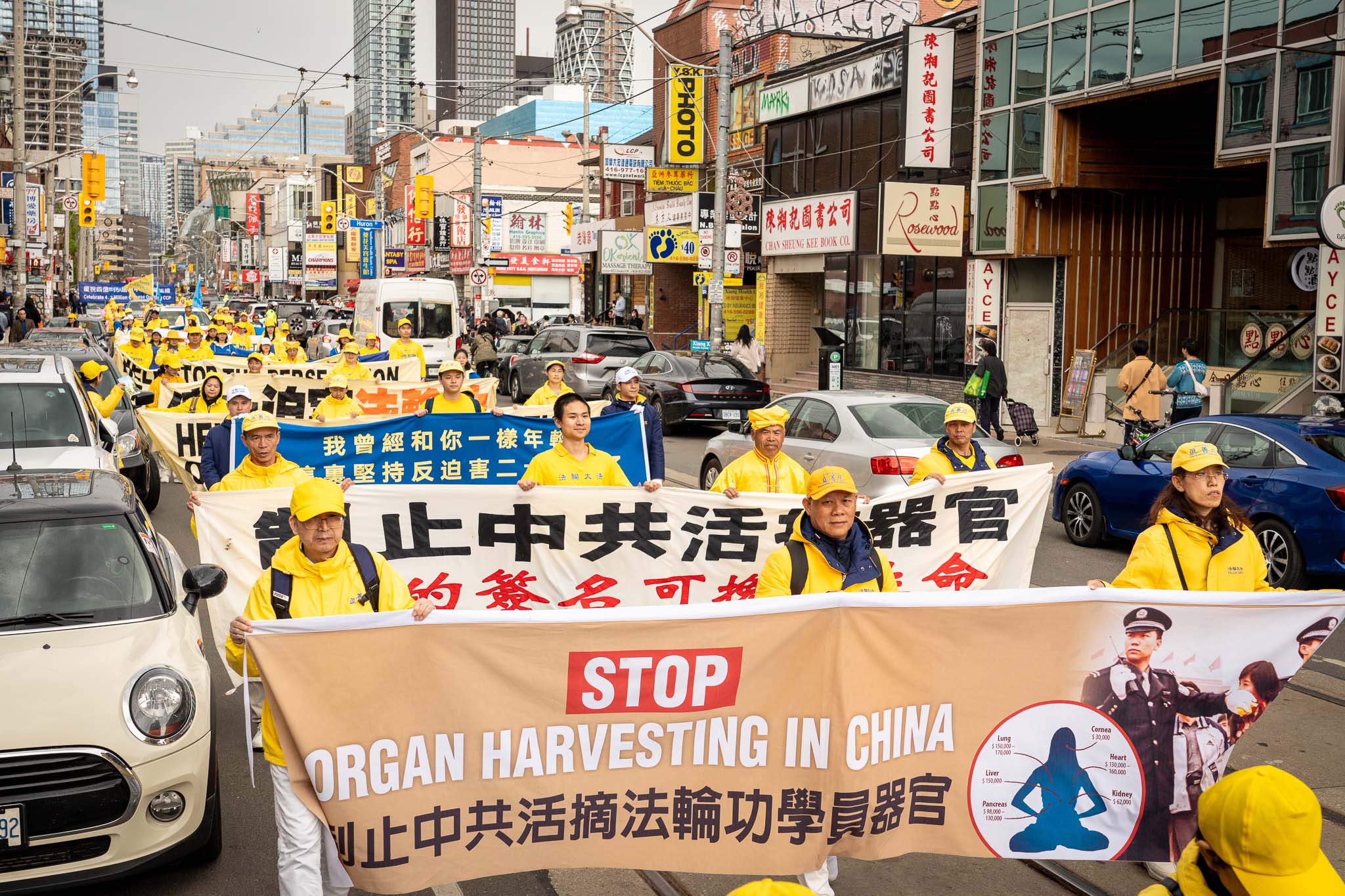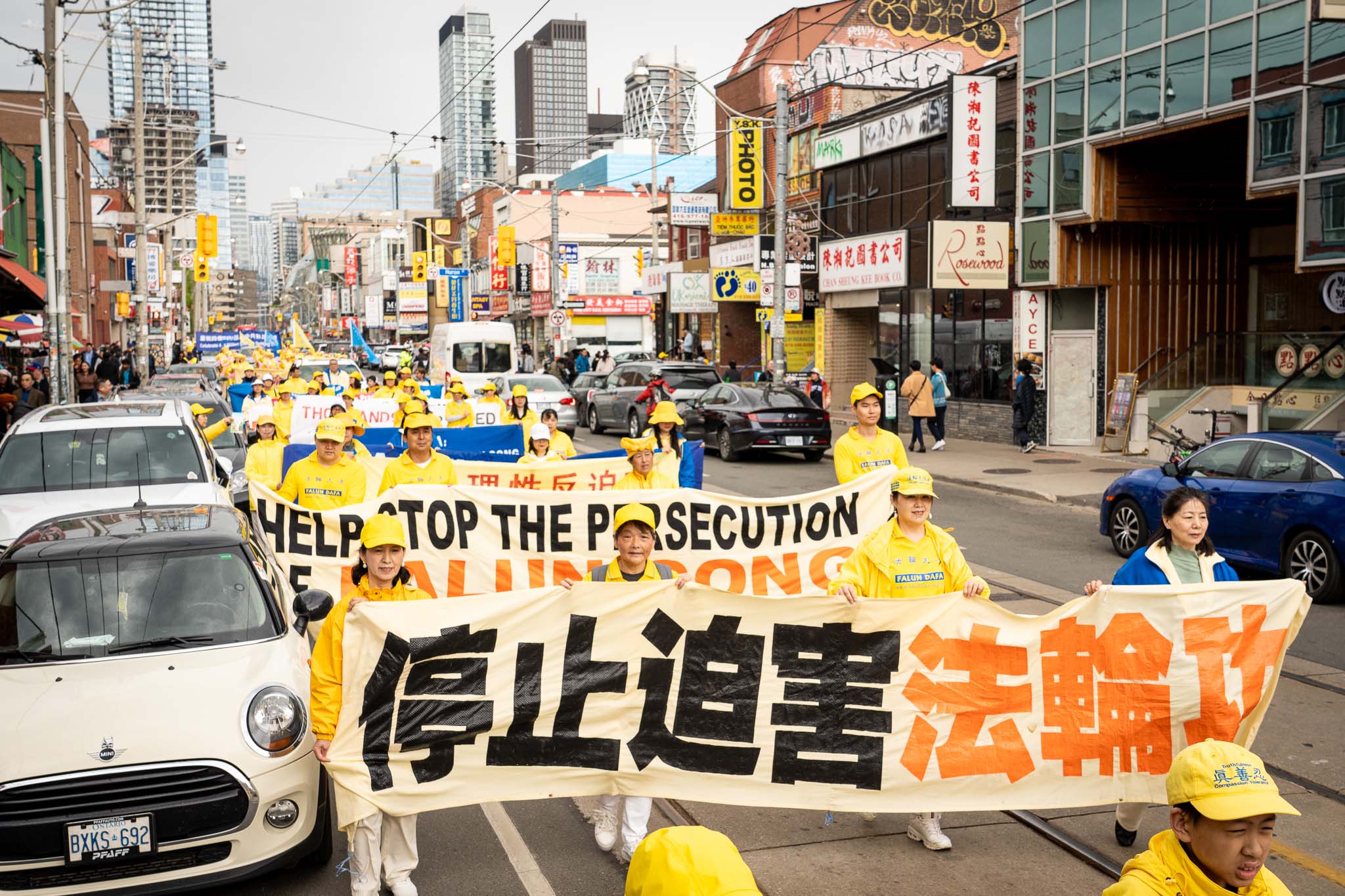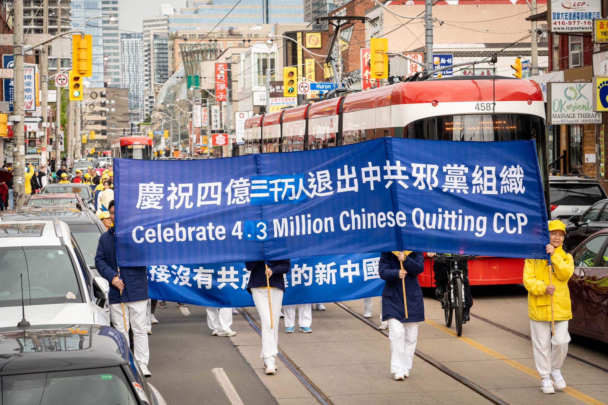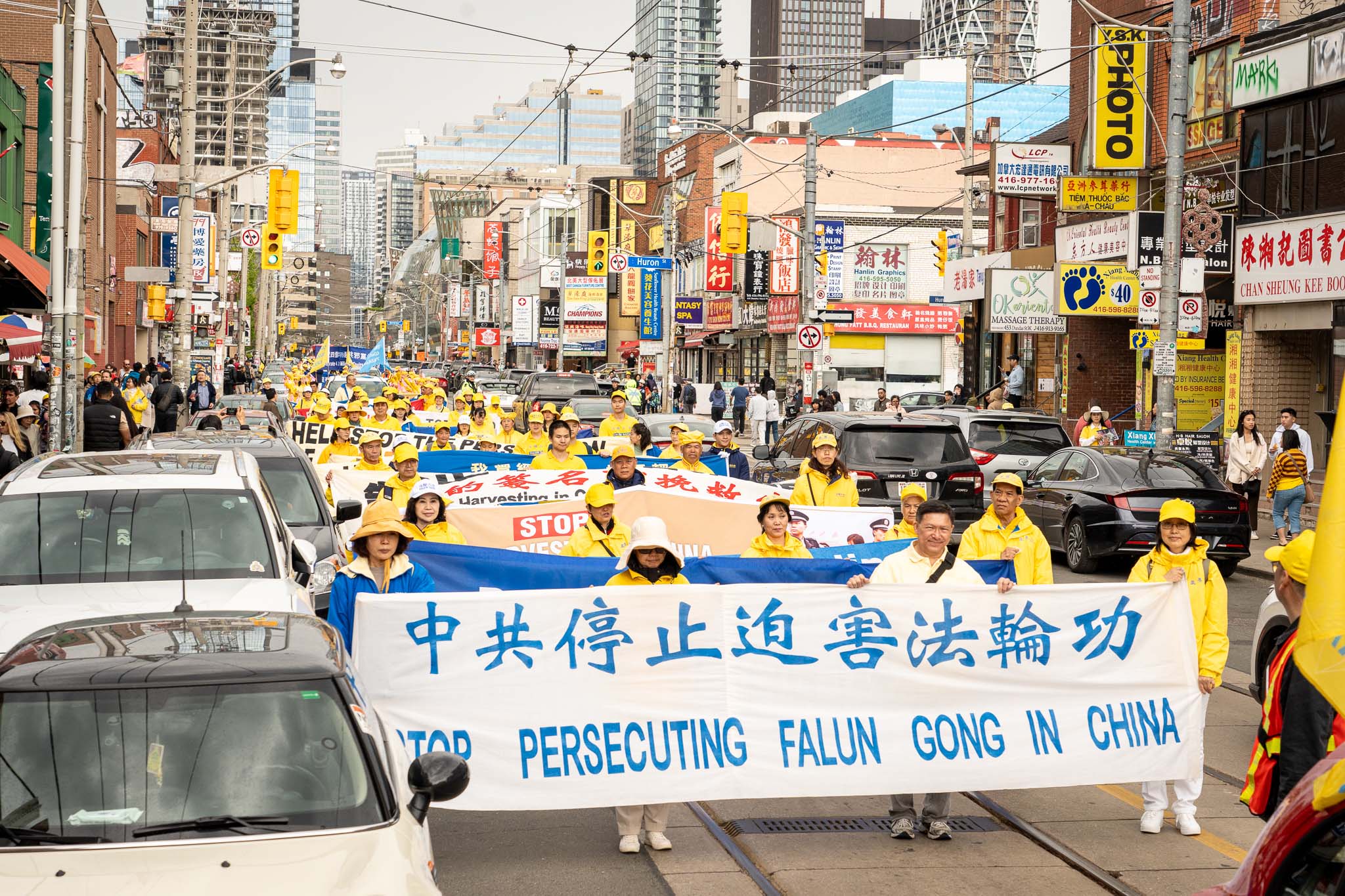 五月春日的街道上,树木正长出新叶。居民与游客们纷纷在外抖擞精神、活动筋骨,恰逢游行队伍经过,便高兴地与学员们共同庆祝节日。色彩明亮的游行队伍从格兰奇木头玩具公园(Grange Park)出发,穿过了市中心多个热门景点,包括唐人街、多伦多大学、安大略美术馆、伊顿中心以及加拿大最繁华的登打士广场。