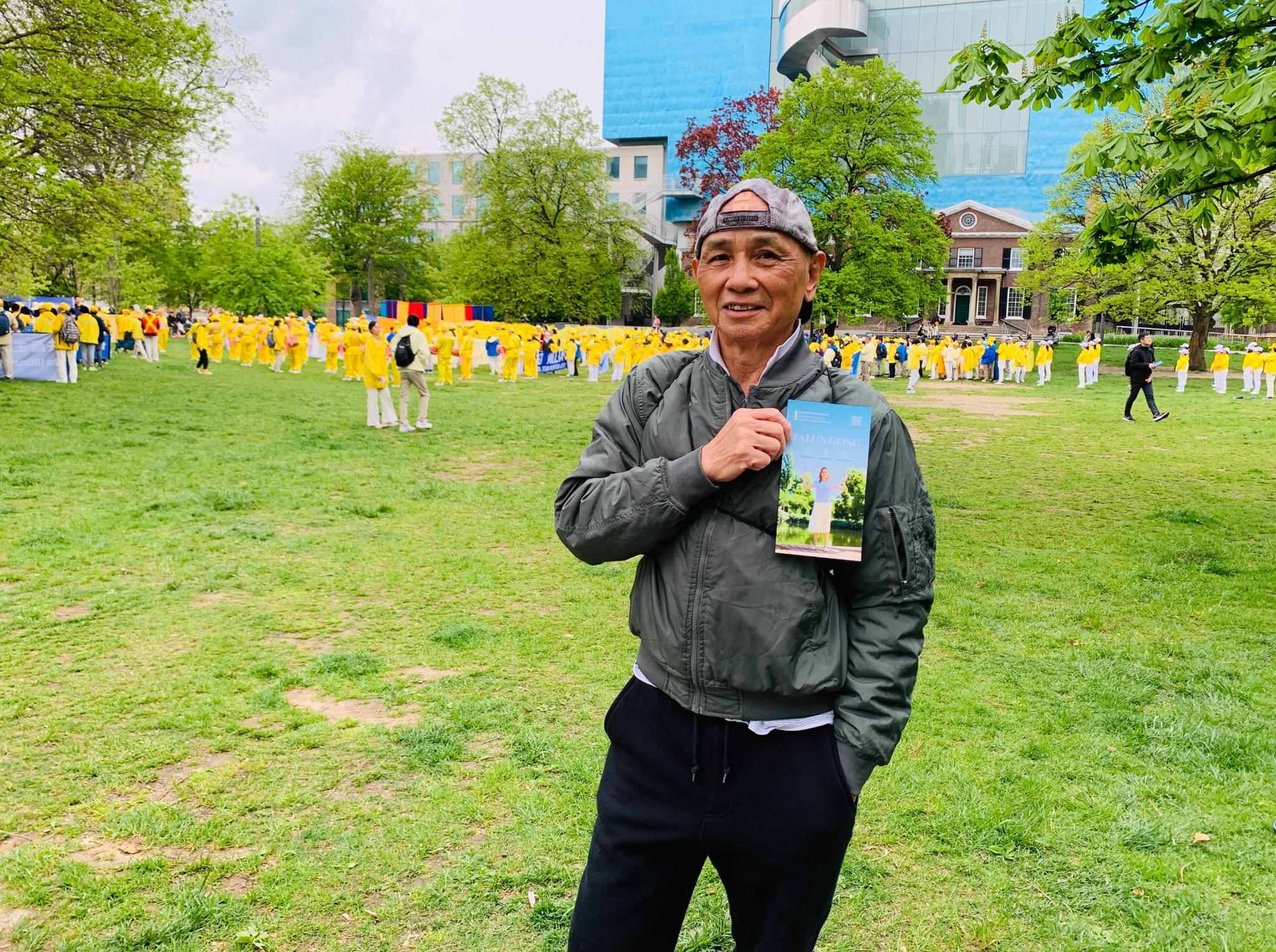 谭(Tan)来自越南,骑车路过公园时看到学员们正在准备游行,便停下来等待观看。他对学员说:“我的朋友多次跟我提到法轮功,谈到功法对人的身体健康有益。朋友之前有眼疾,炼法轮功后好了,所以他介绍我来炼时,我就很感兴趣。”