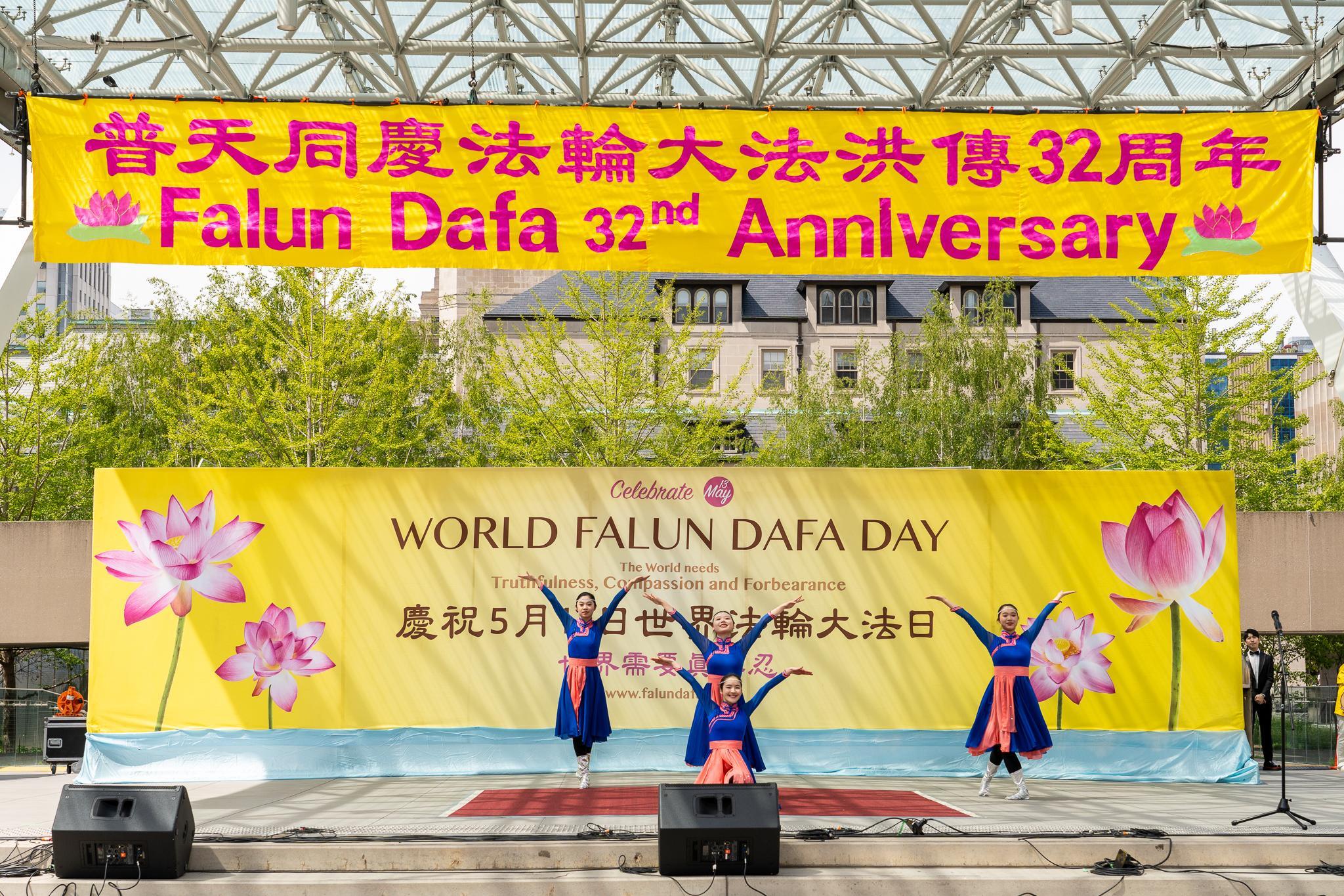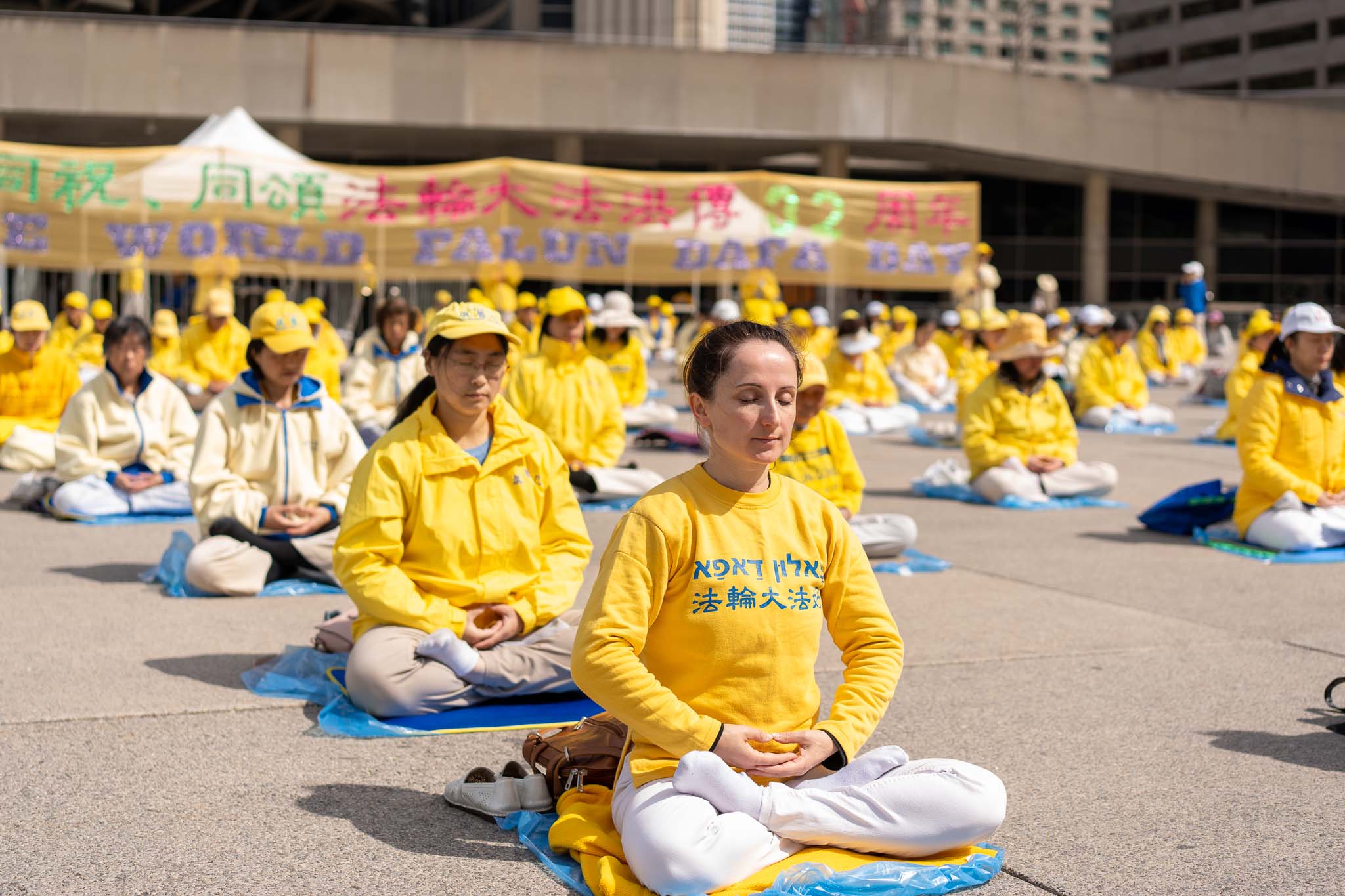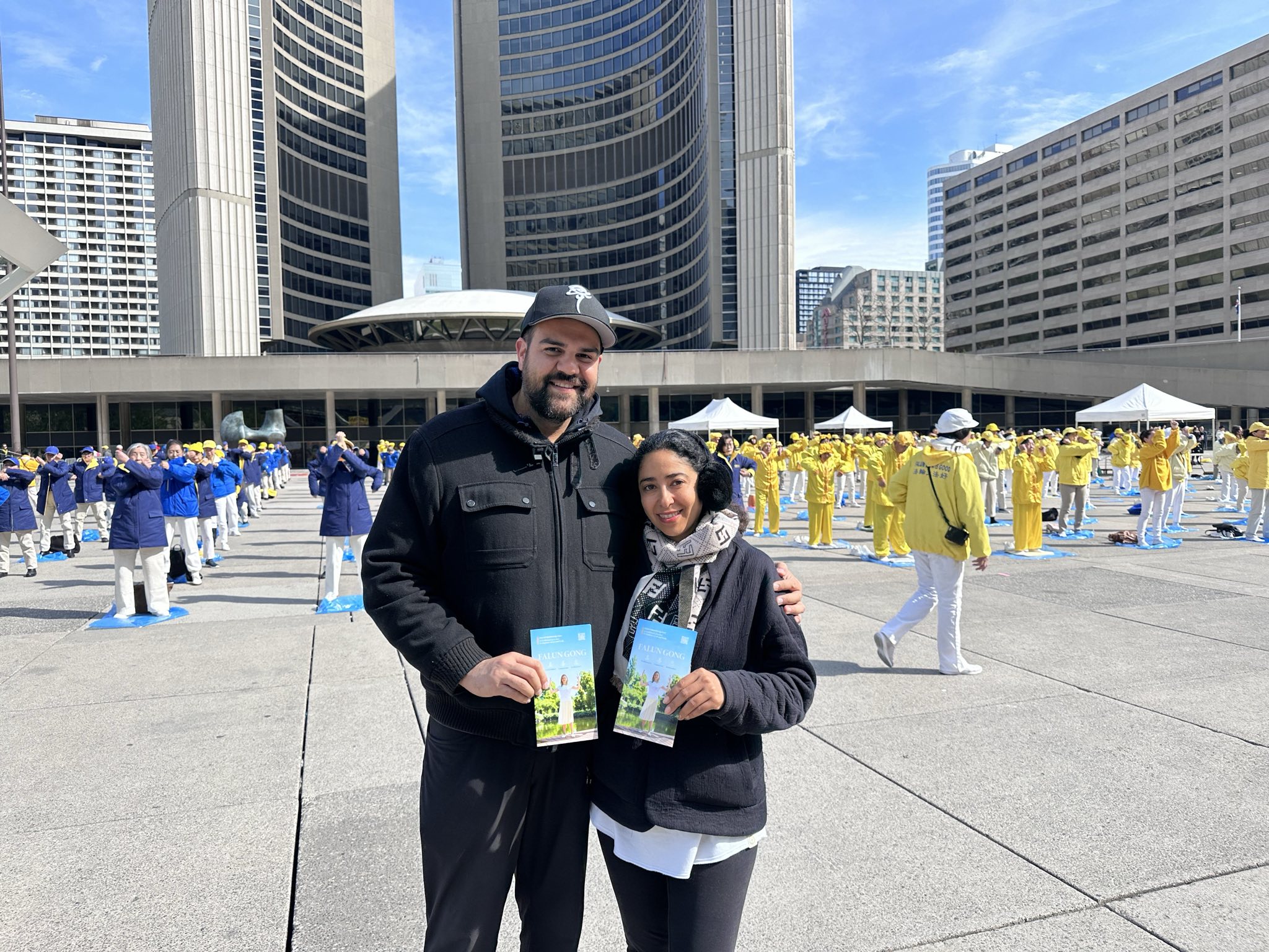 皮杰(PJ)和莫娜(Mona)在市政厅广场上看到了学员集体炼功,感到整个场面给他们带来了深深的平静,因而前来了解功法。皮杰第一次听说法轮功,而莫娜之前在码头边的多伦多音乐花园就看到过十几个学员在那里集体炼功。