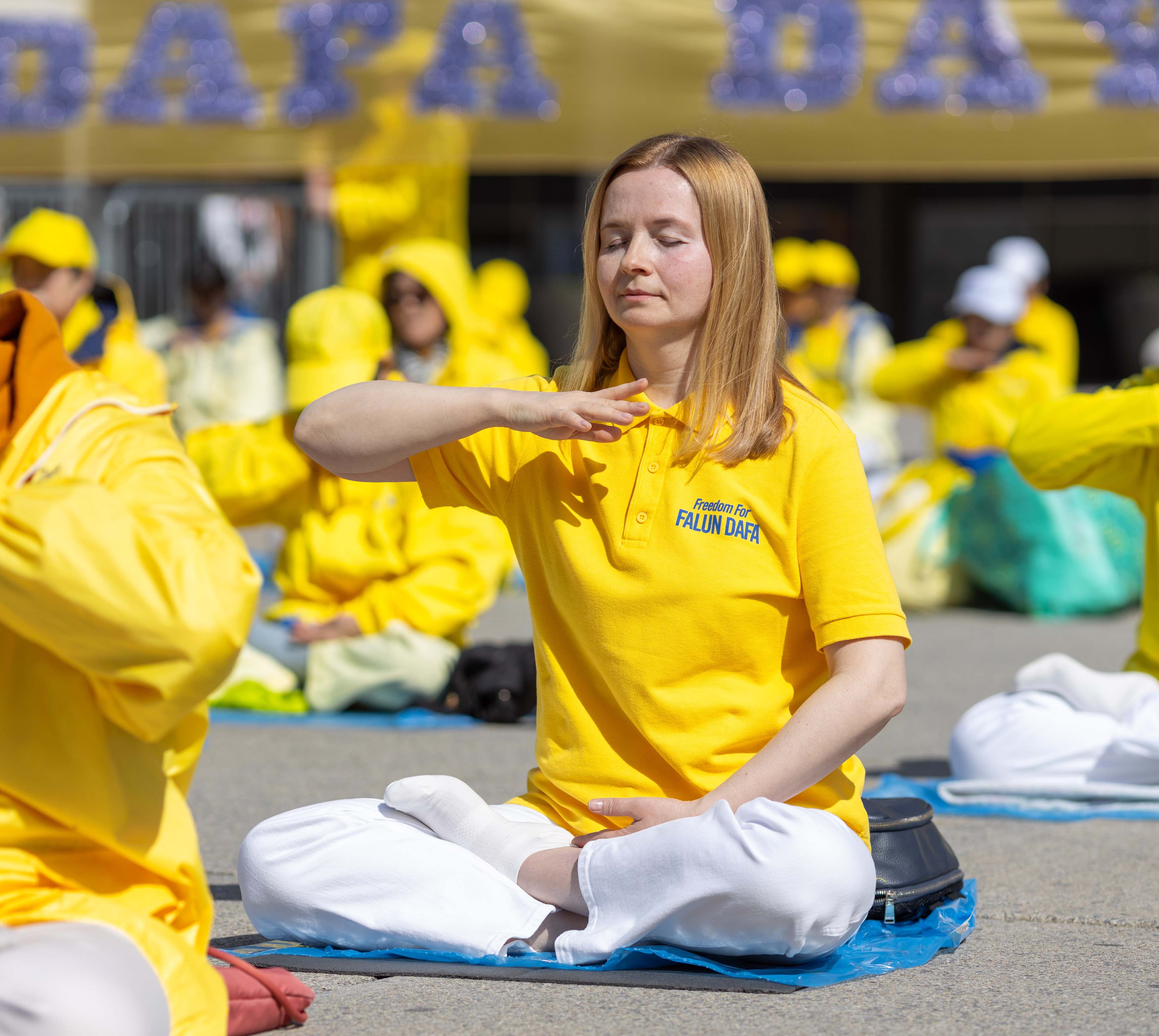 她说:“这次活动很有意义。学员们金黄的着装,象征着阳光、光明。站在这里看他们炼功,听着音乐,我也感到平静,是一种与宇宙、地球的和谐。”