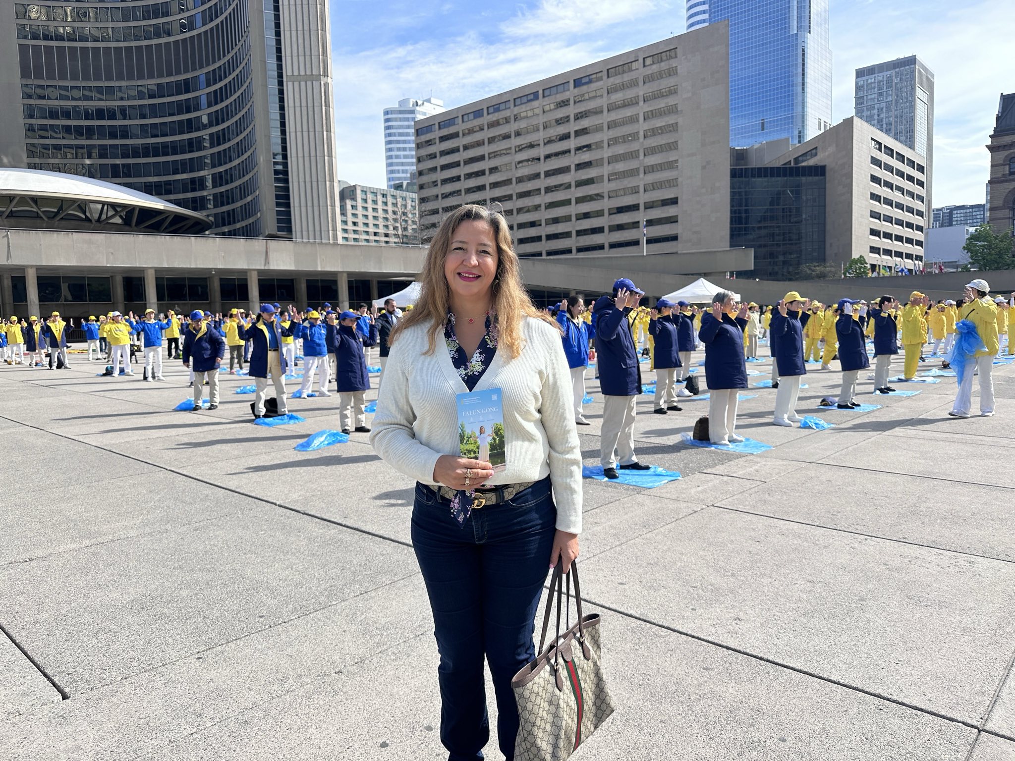 伊莎(Elsa)从事地产行业。法轮功学员们整齐的衣着引起了她的注意,她便停下脚步,并主动与学员交谈、了解功法。