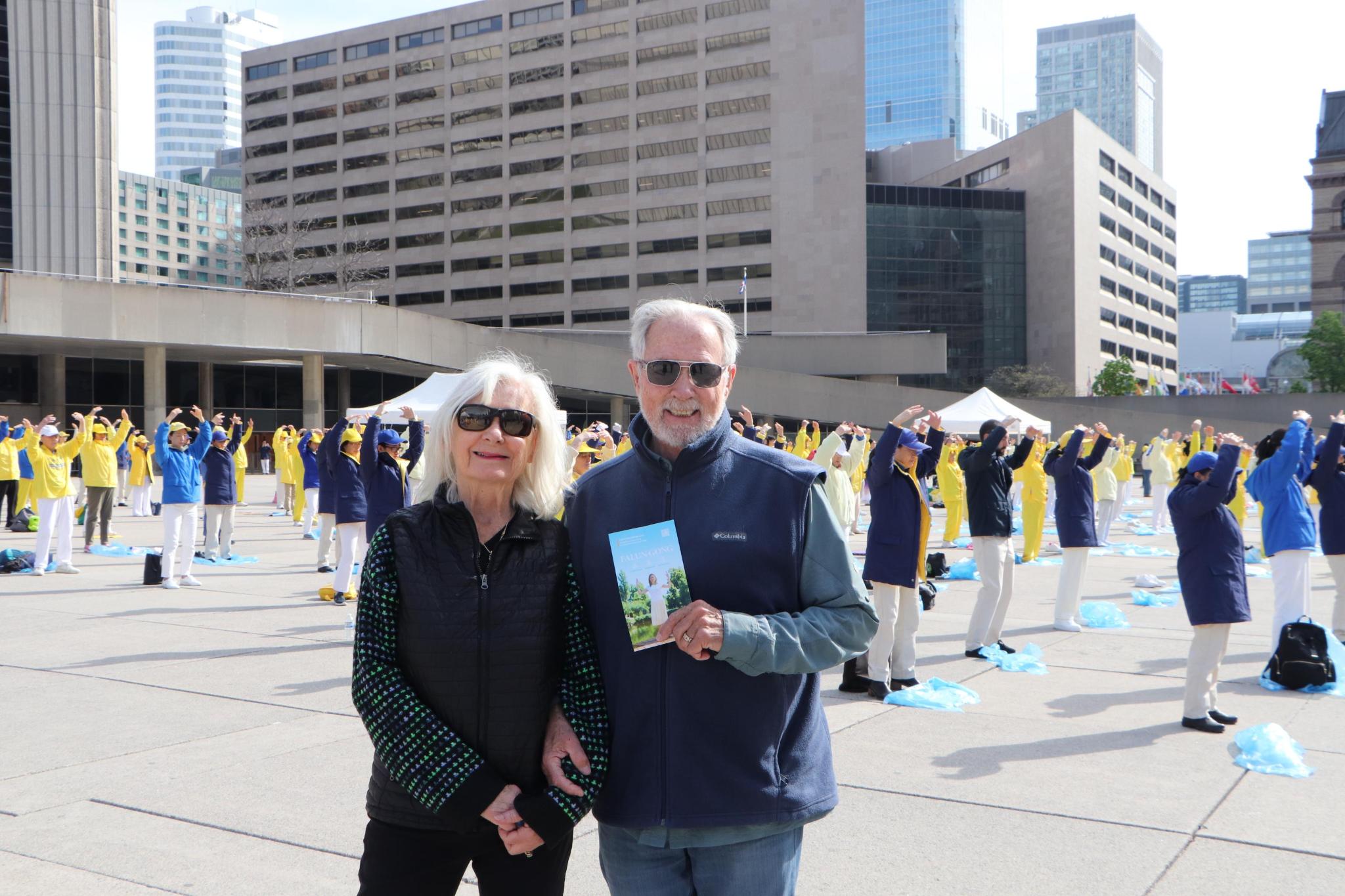 柯尔特(Colt)和贝茜(Betsy)来自内华达,来多伦多旅行。他们透过酒店的窗户看到市政厅广场正在举办集体炼功的活动,感到好奇,于是前来观看。