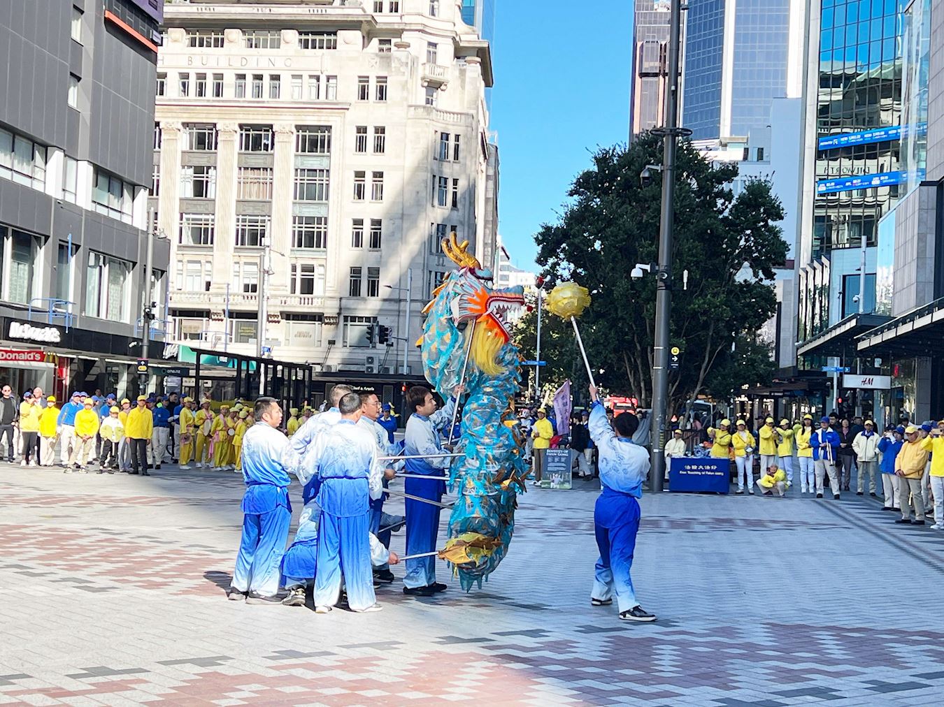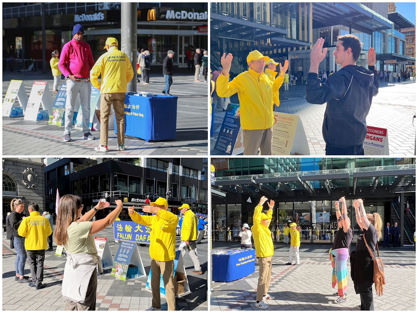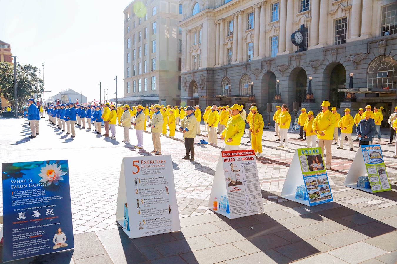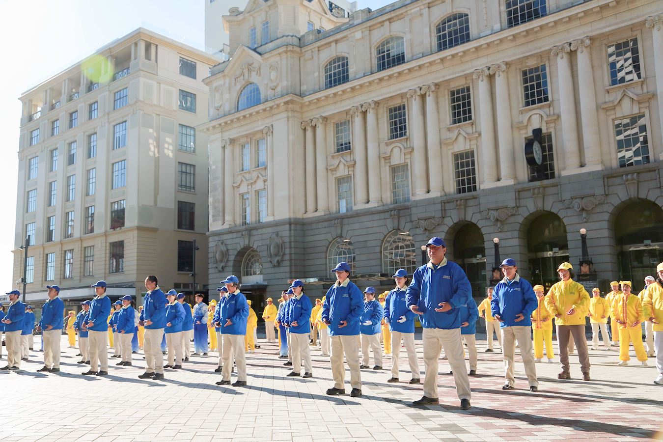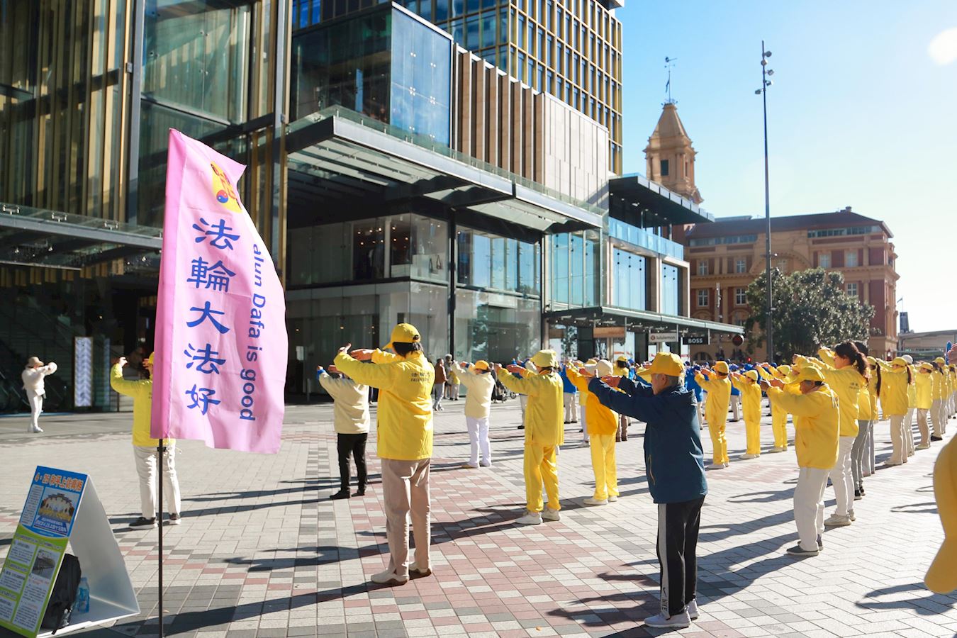 清晨,紧邻奥克兰美丽海港的伊丽莎白广场上响起了悠扬的法轮大法炼功音乐,学员们集体炼功,舒缓优美的动作、祥和平静的壮观场面吸引了很多人驻足观看、拍照录像。