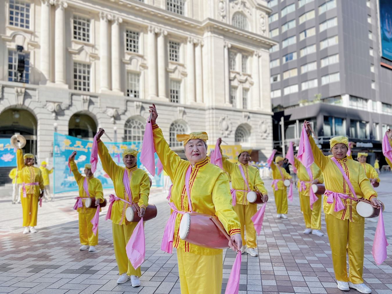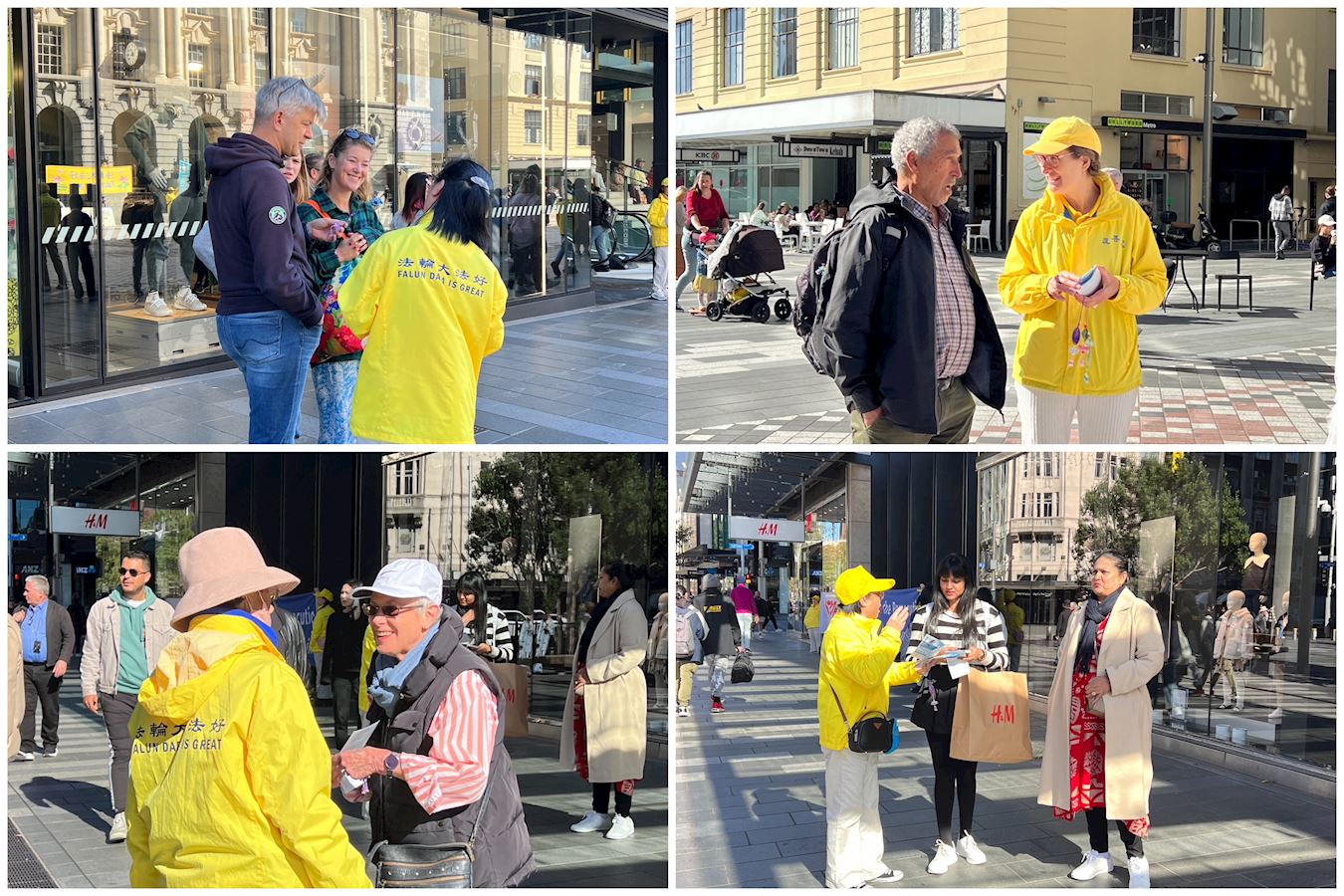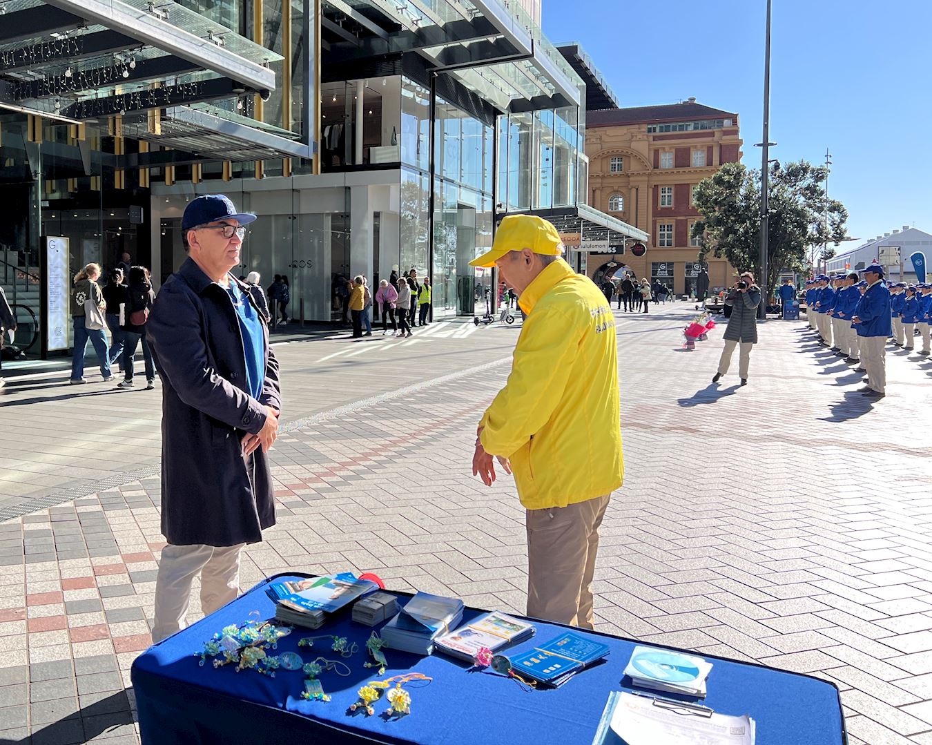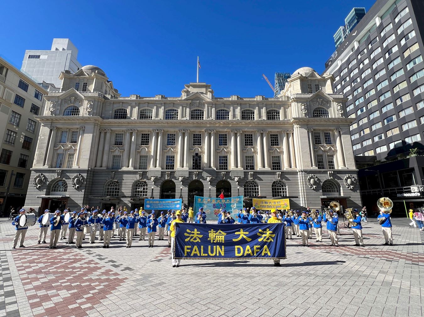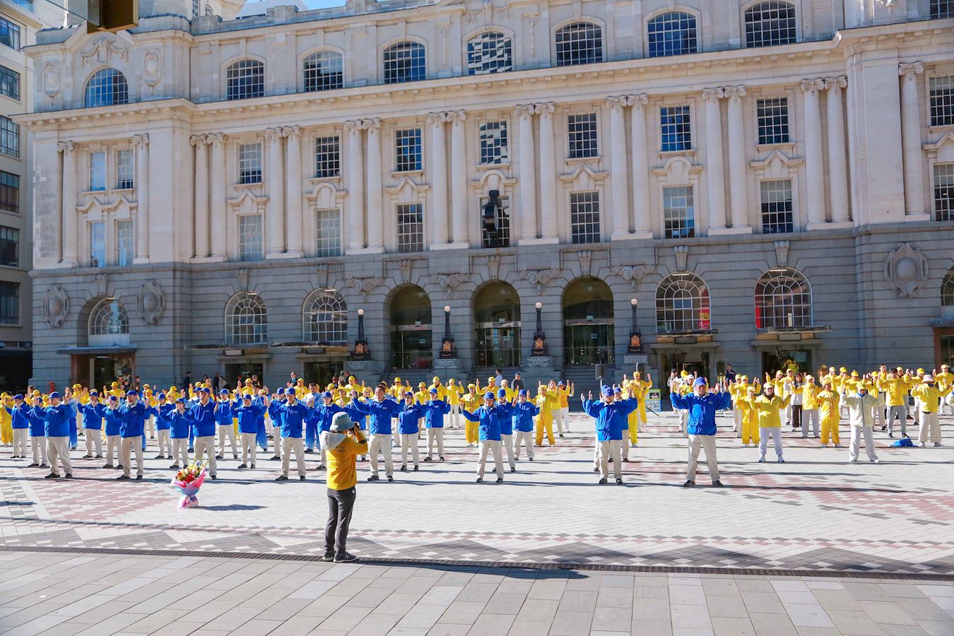 清晨,紧邻奥克兰美丽海港的伊丽莎白广场上响起了悠扬的法轮大法炼功音乐,学员们集体炼功,舒缓优美的动作、祥和平静的壮观场面吸引了很多人驻足观看、拍照录像。