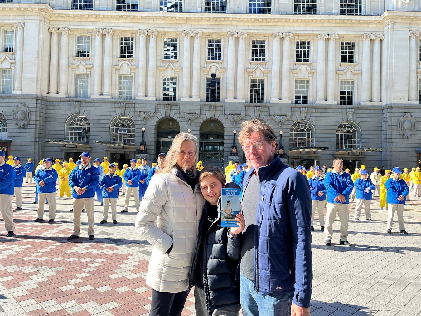 来自新西兰尼尔森(Nelson)的黛安娜·哈特(Diana Hart)与丈夫乔治·哈特(George Hart)以及他们的儿子约书亚(Joshua)在法轮功学员炼功队伍前驻足观看。黛安娜说:“他们看起来太美好了,很平静、祥和。我其实正在寻找着一些什么。这(法轮功)很吸引我。我感觉这个功法对心灵有益,我正需要这个!”