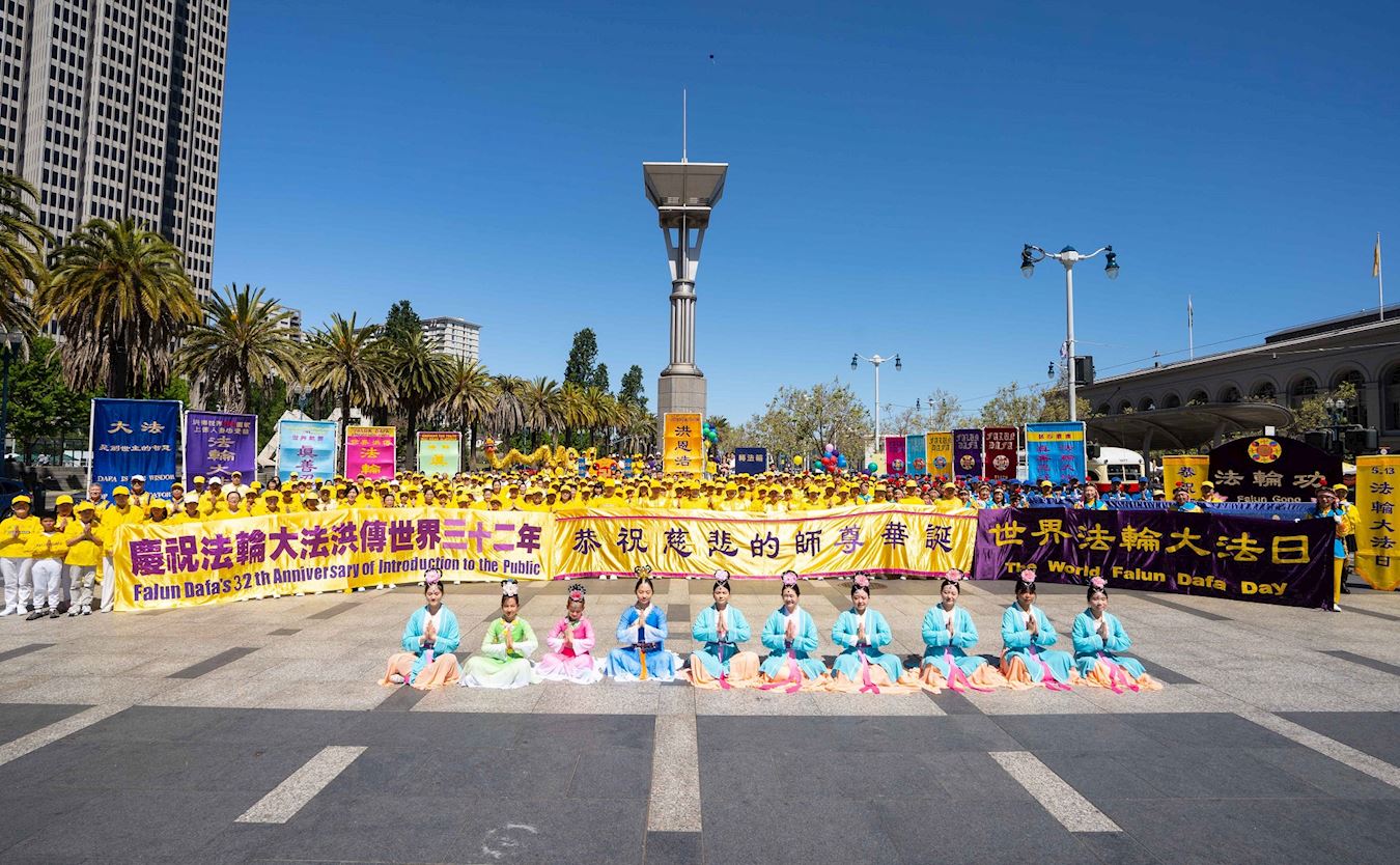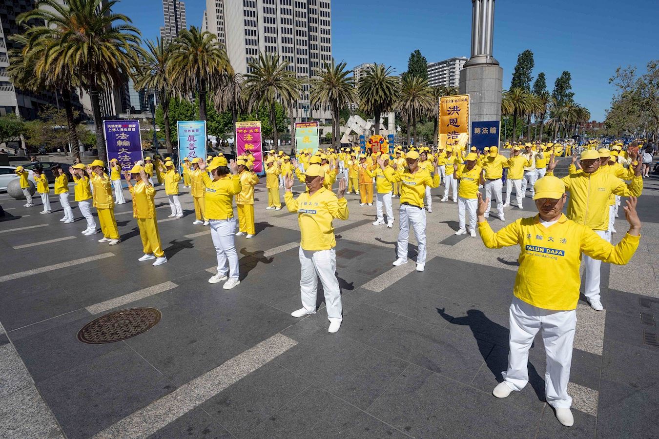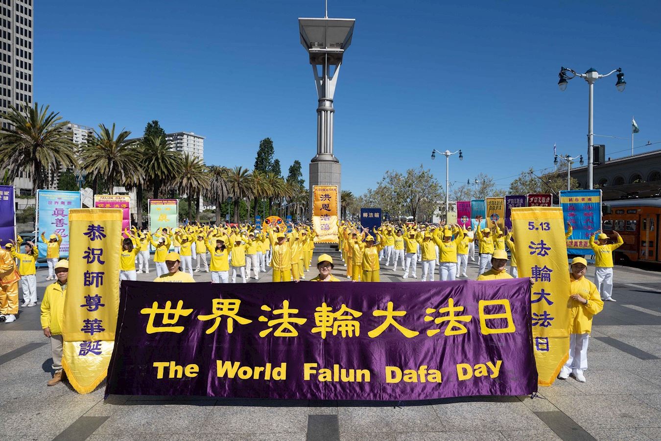 星期六上午九点,法轮功学员首先在旧金山渡轮大厦(Ferry Building)广场前集体炼功,向市民展示祥和优美的功法,庆祝世界法轮大法日。不少游客被吸引驻足观看,有的想了解什么是法轮功。有的跟着法轮功学员的动作学功。