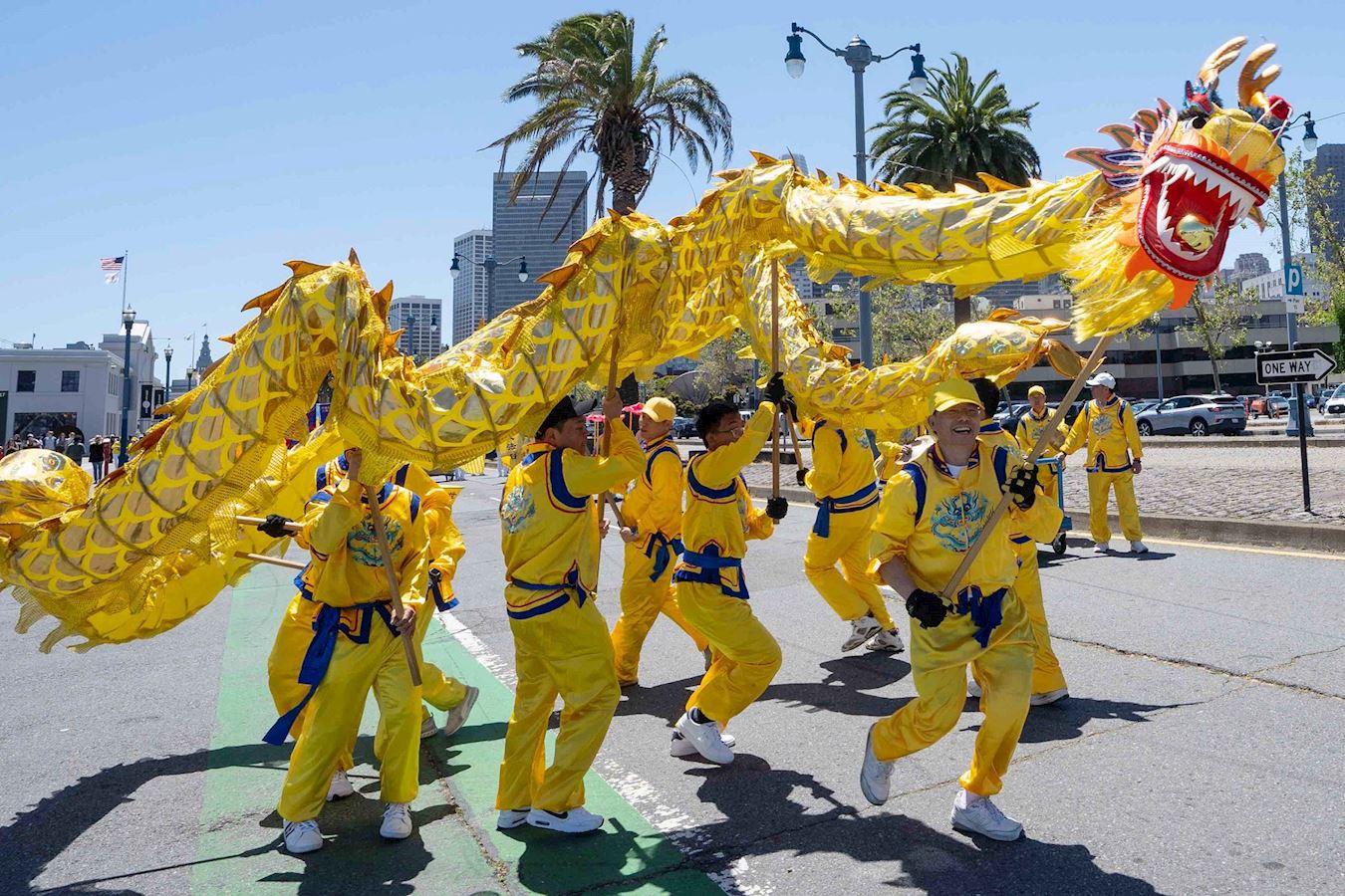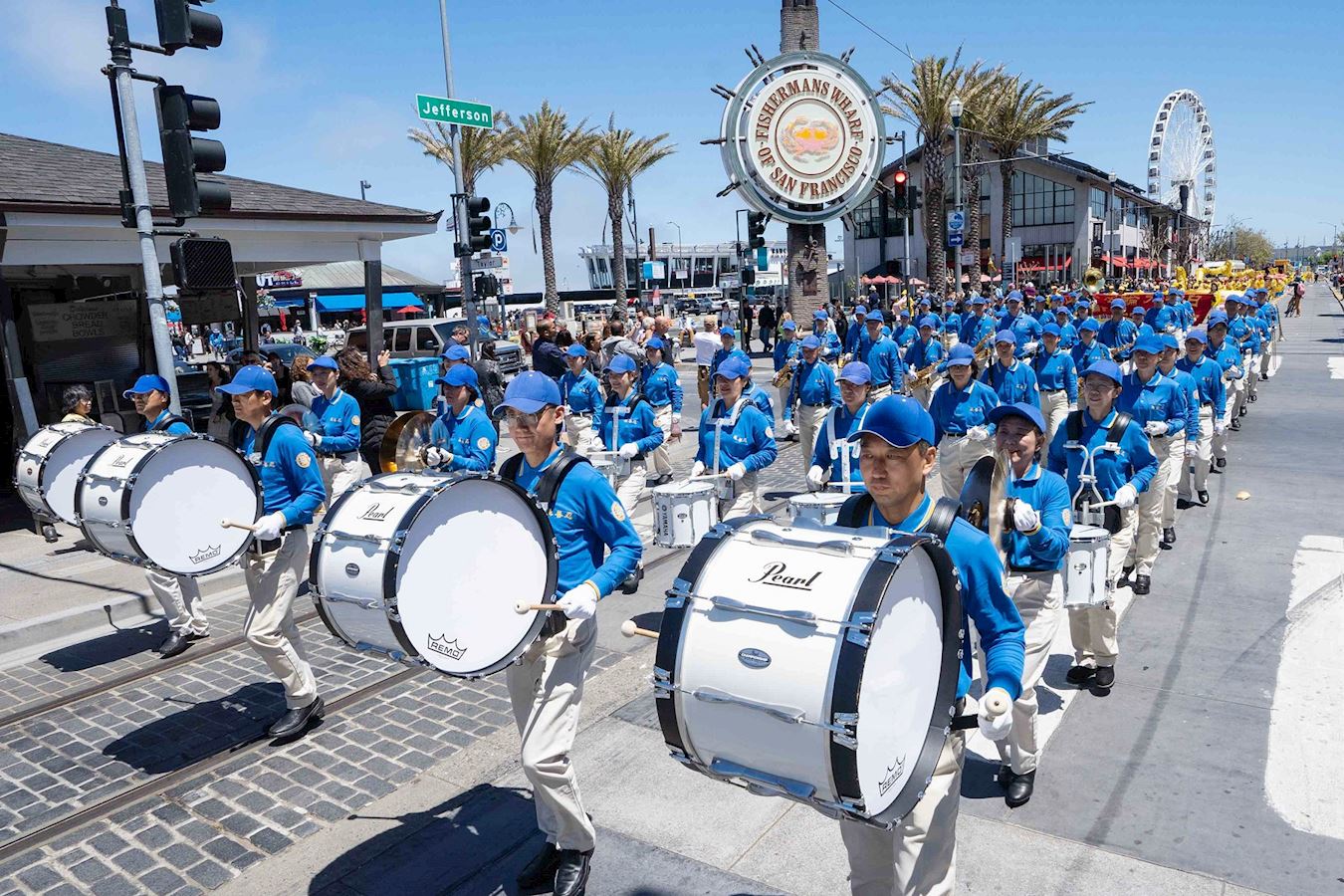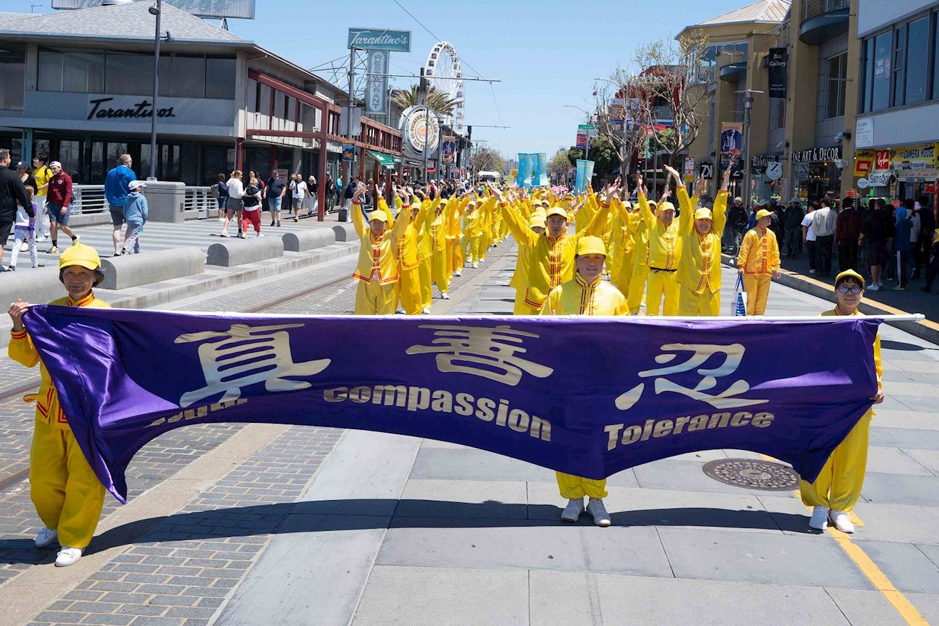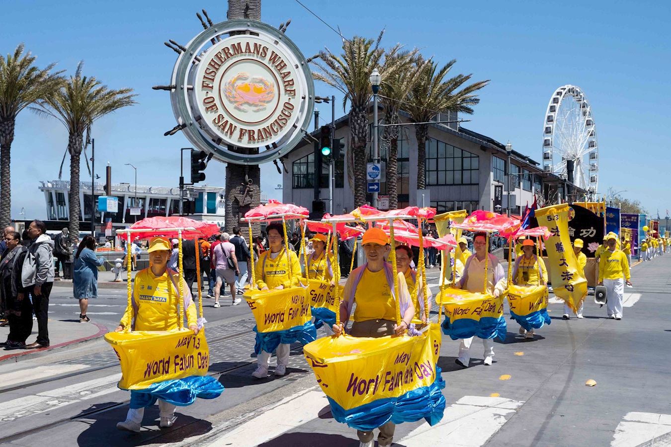 中午十二点,庆祝游行开始。法轮功学员从渡轮大厦出发,沿着内河码头(Embacadero)大道,经过著名的渔人码头,最后抵达海洋公园。