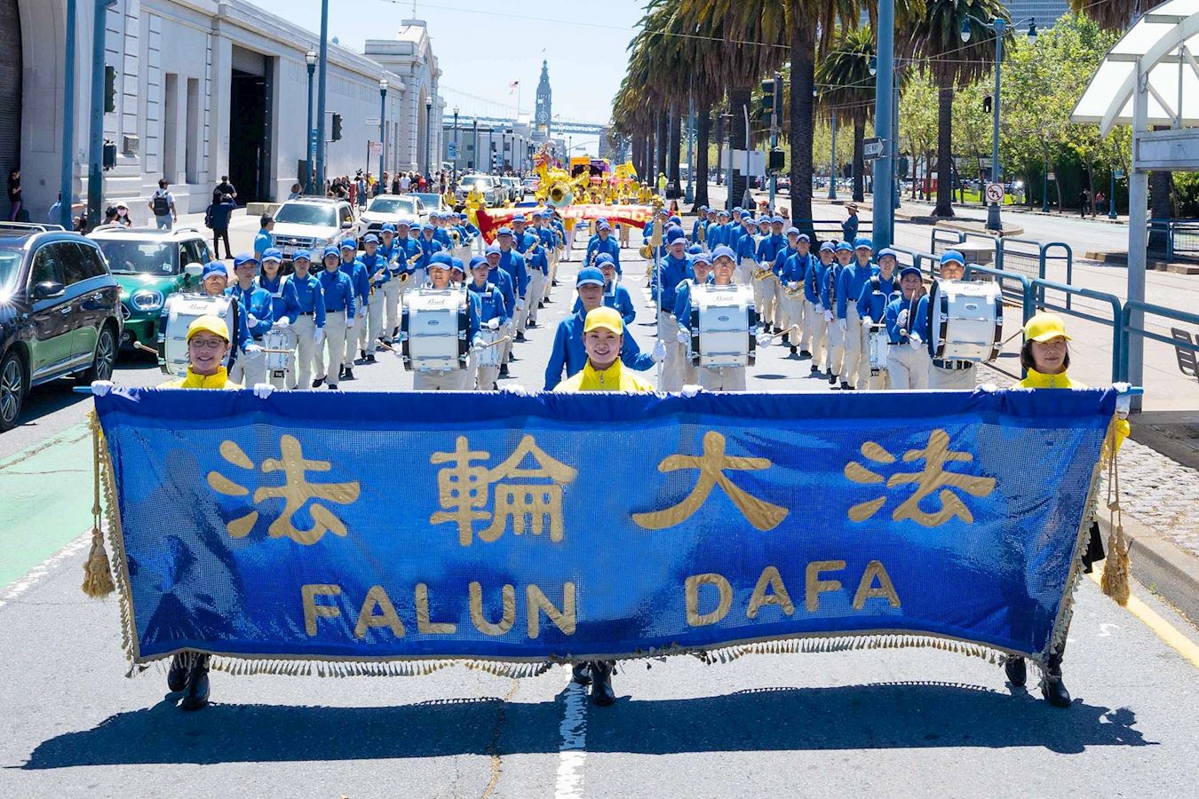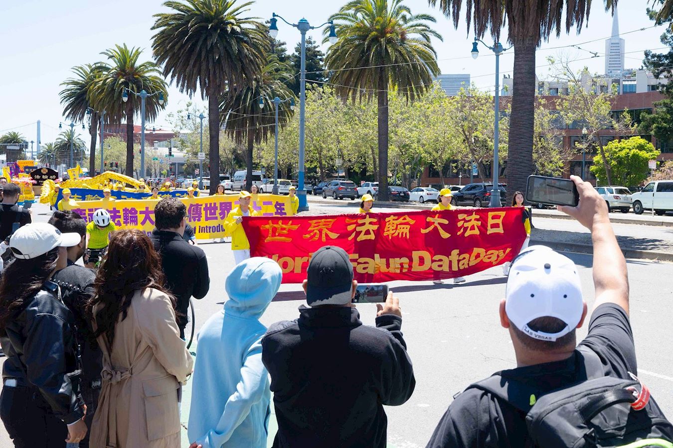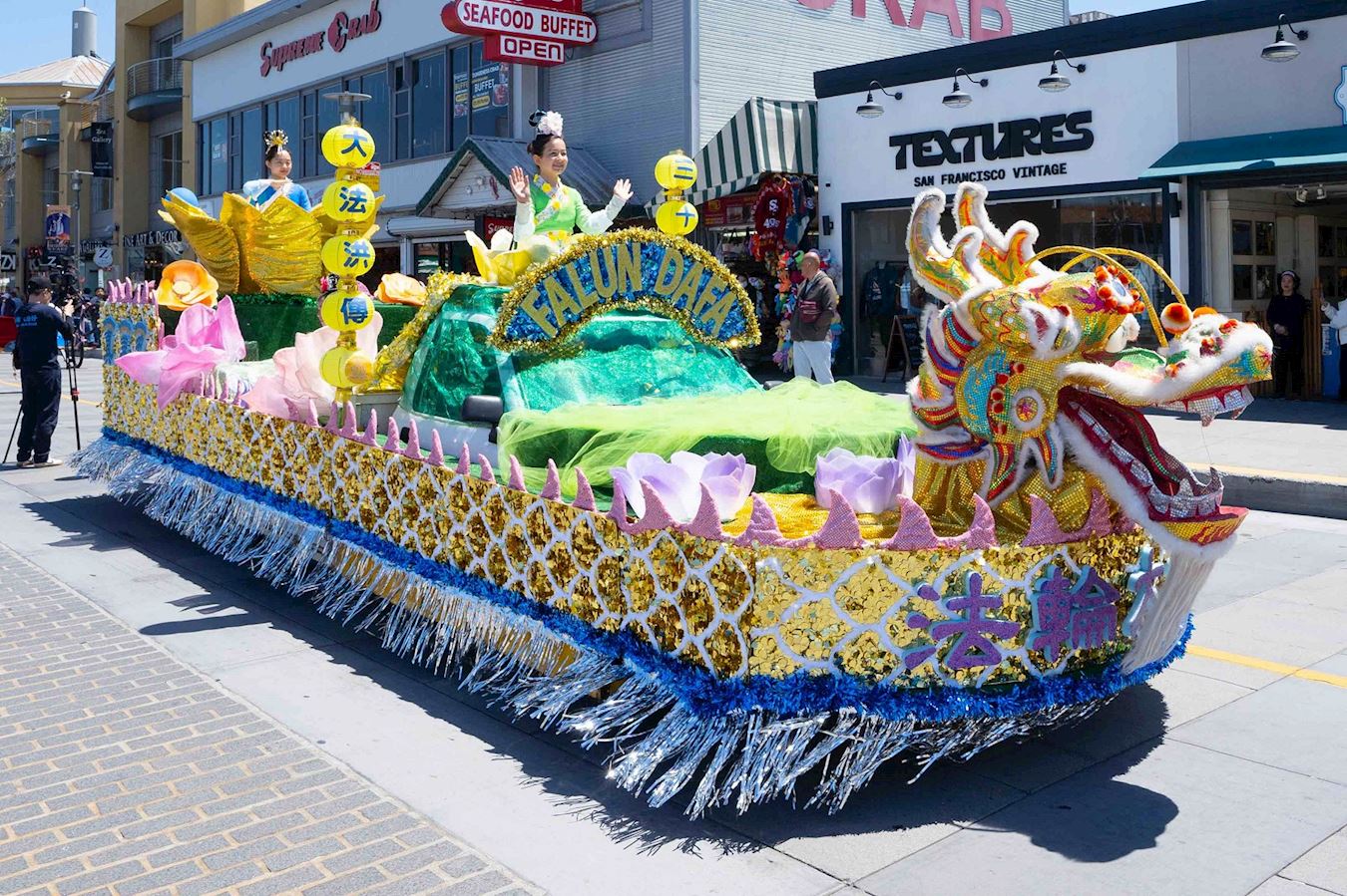 中午十二点,庆祝游行开始。法轮功学员从渡轮大厦出发,沿着内河码头(Embacadero)大道,经过著名的渔人码头,最后抵达海洋公园。