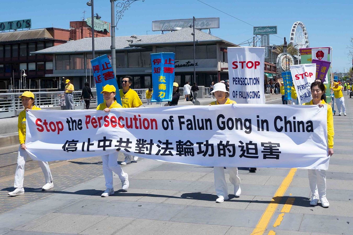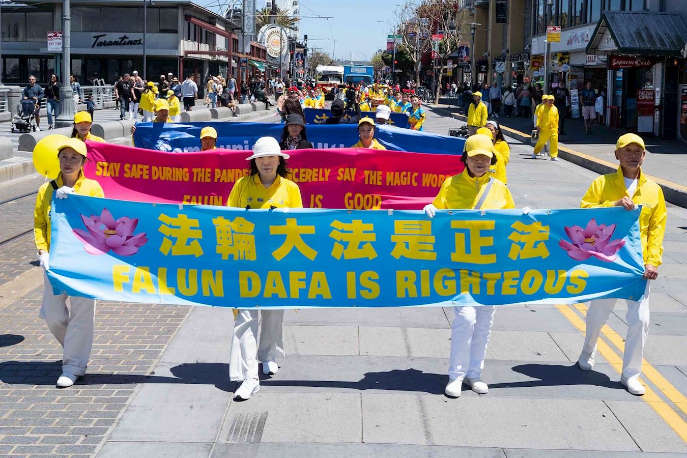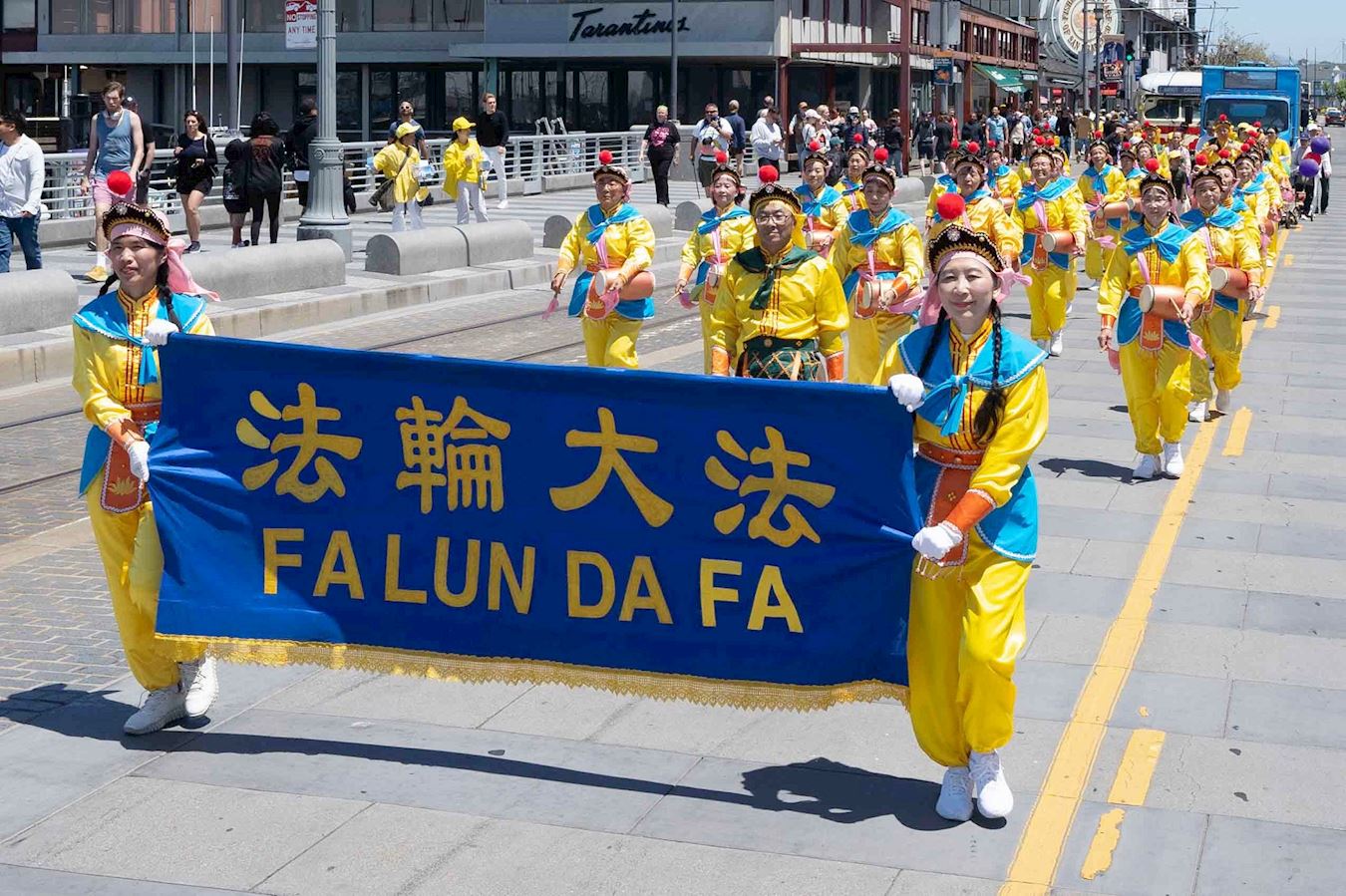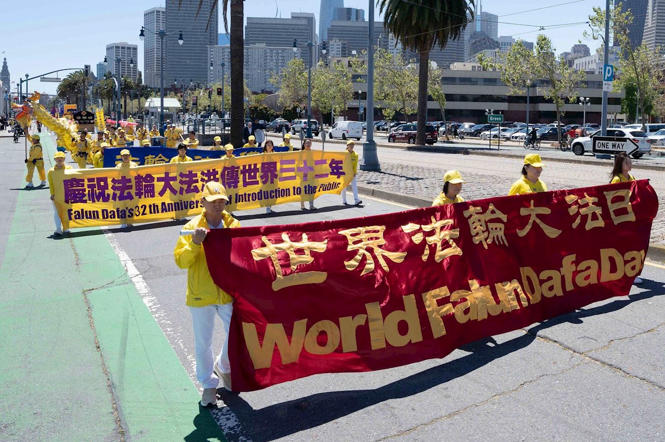 中午十二点,庆祝游行开始。法轮功学员从渡轮大厦出发,沿着内河码头(Embacadero)大道,经过著名的渔人码头,最后抵达海洋公园。