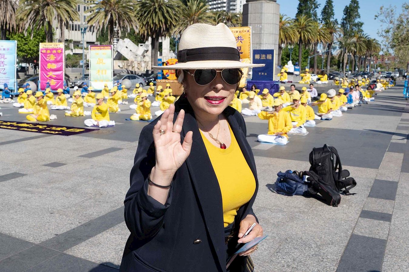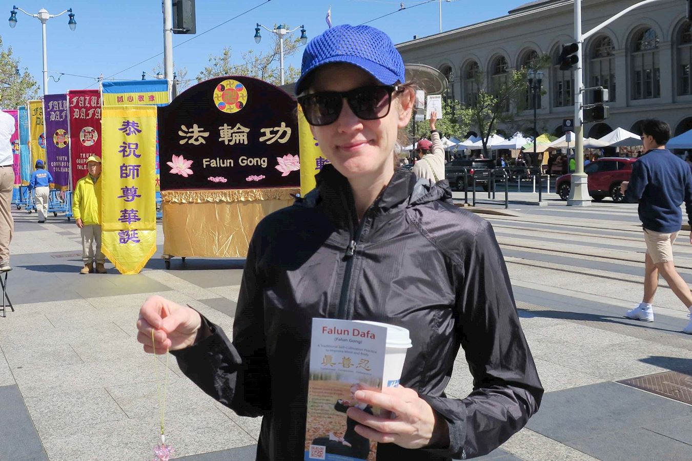 旧金山市民罗斯·卡内尔(Rose Carnell)非常喜欢法轮功学员所展示的功法,她表示,“很高兴能看到他们在这里展示功法,他们的动作非常祥和,站在这里所有负面的想法都没有了。”