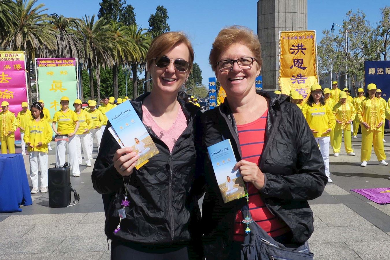 西尔维亚·松比米 (Silvia Sombimi)和派翠西亚·斯卡扎诺斯基(Patricia Scazanosqi)从巴西来旧金山旅游,当她们经过学员正在集体大炼功的场面,就迫不及待的想了解什么是法轮功。