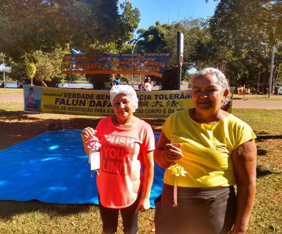 附近餐厅的老板黛萨(Deuza,右)和店员露琪(Rute,左)表示,每周都听到你们悠扬的音乐,观赏你们祥和的炼功场,我们从心里喜爱你们。你们横幅上写的真、善、忍三个字的内涵非常美好,我们会记住,并让家人也一定记住。