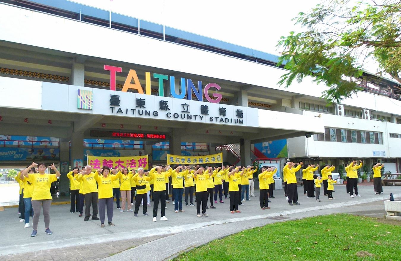 ![]() 图2:学员在台东县立体育场前集体炼功,展现大法美好。 |