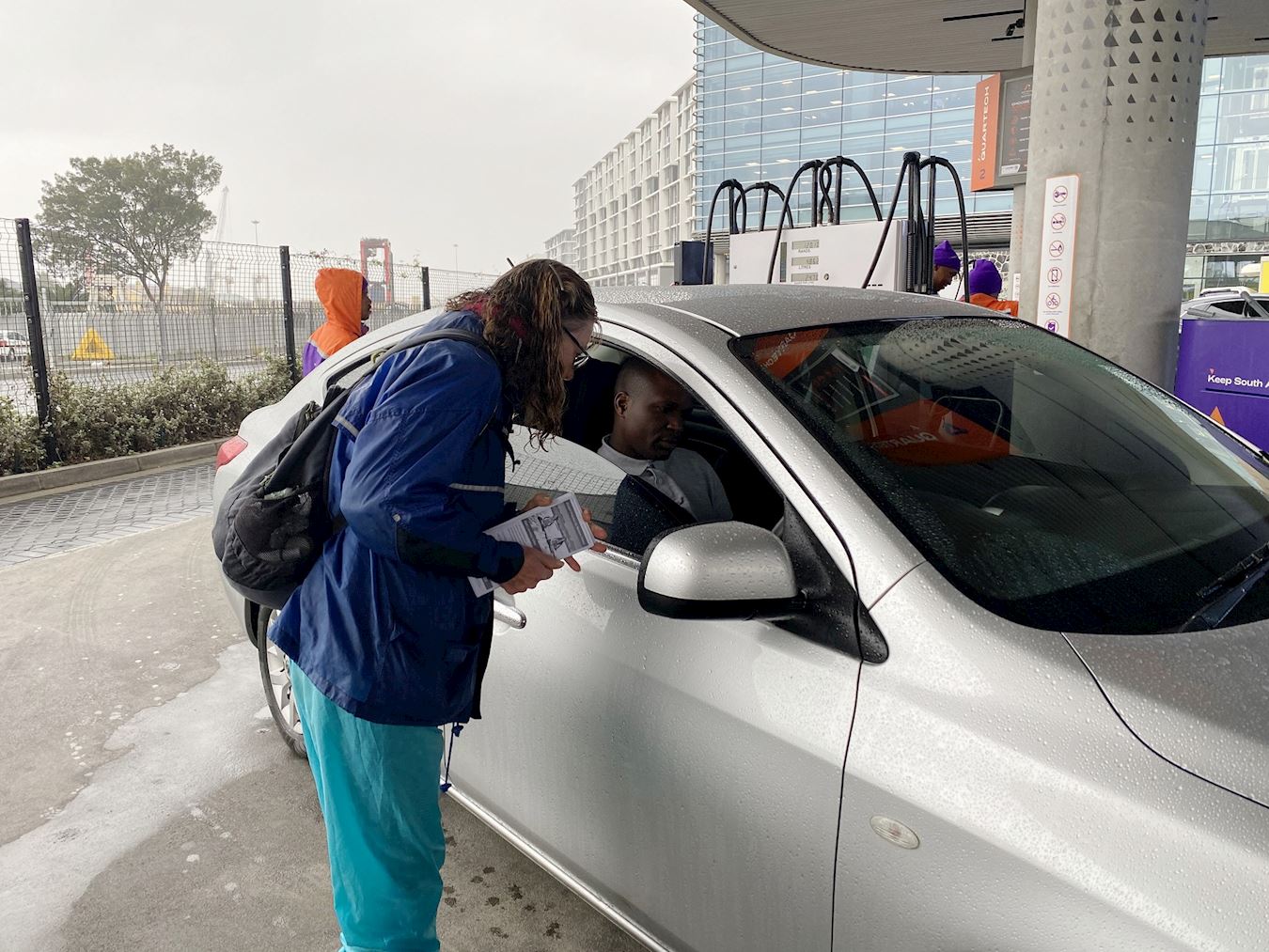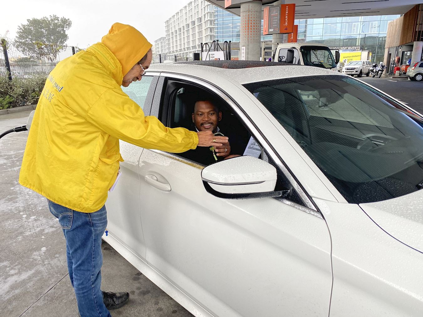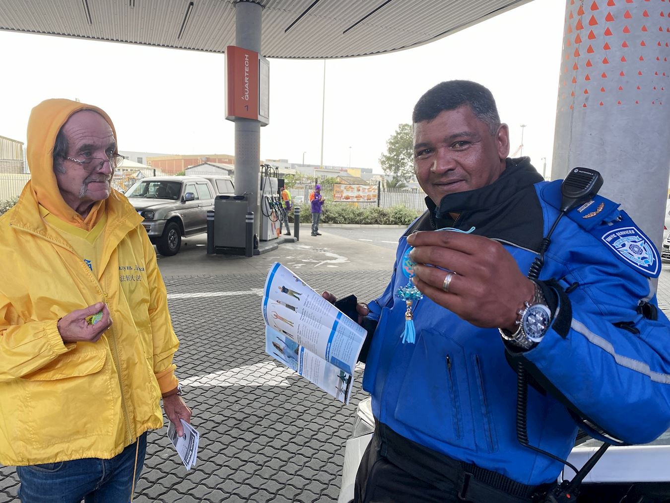 南非五月适值秋末,开普敦当天陰雨綿綿。法轮功学员来到码头附近的加油站阿斯特朗能源公司(Astron Energ)发传单,讲真相。在加油站附设超市一带,车水马龙,人群熙来人往。学员们或给加油的司机讲真相,或为购物的民众介绍大法,有的向路过的行人发资料。唯盼市民與游客都能获闻真、善、忍,接受法轮大法的祝福。