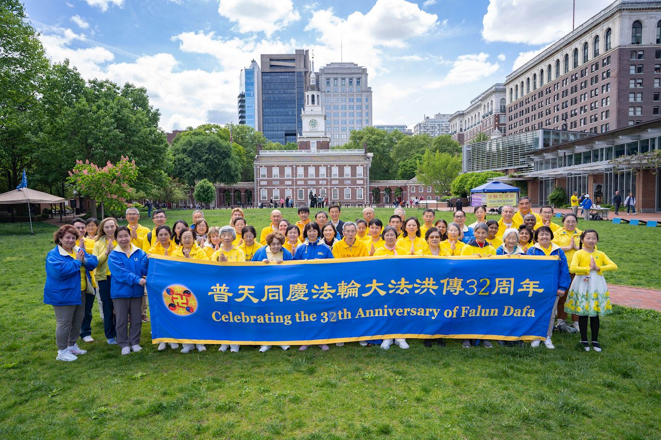 ![]() 图1:二零二四年五月十一日,大费城法轮功学员在费城自由钟独立广场庆祝世界法轮大法日,祝法轮功创始人李洪志先生生日快乐。 |