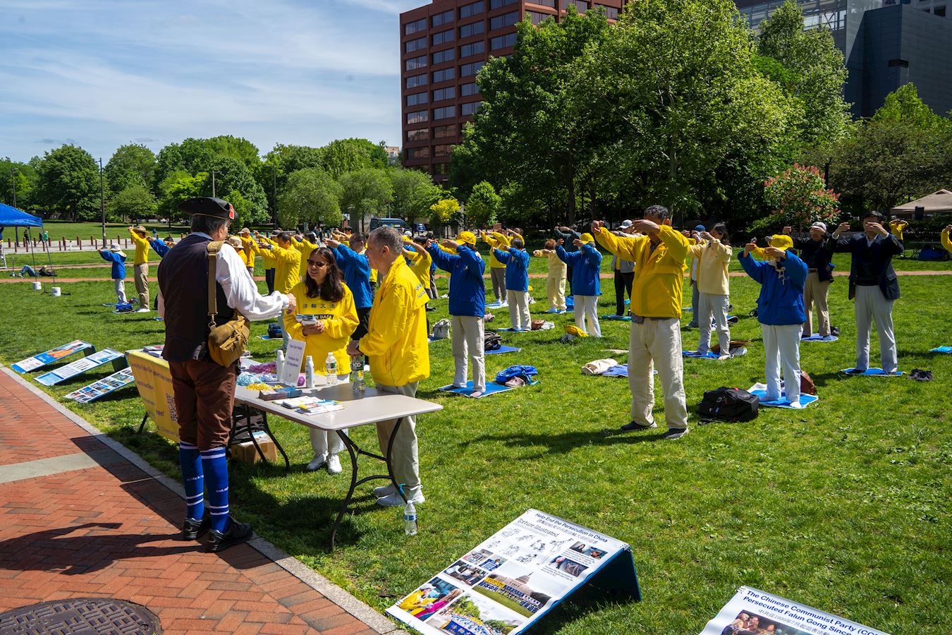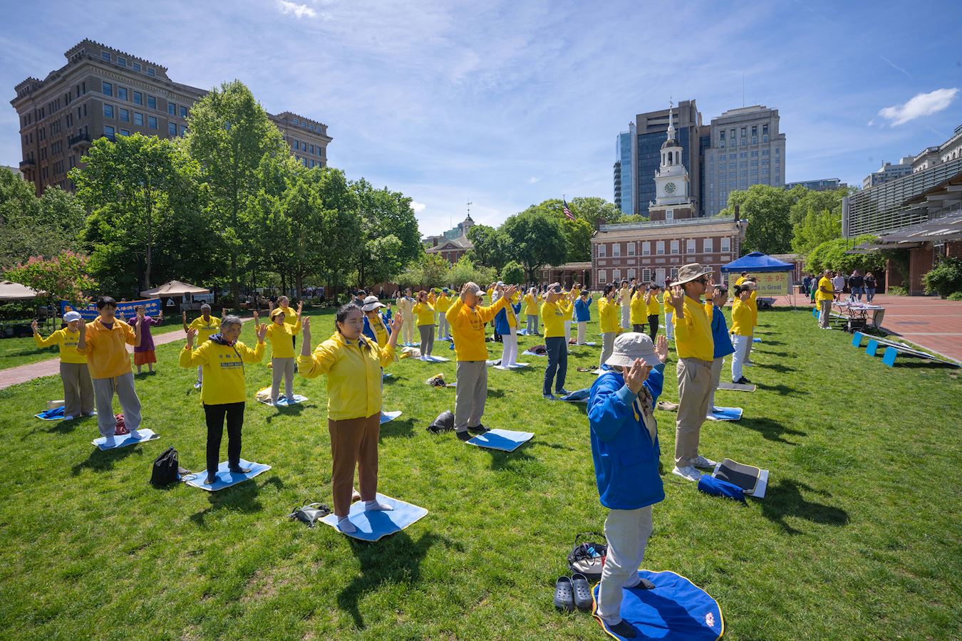 ![]() 图2:二零二四年五月十一日,大费城法轮功学员在费城自由钟独立广场庆祝世界法轮大法日。法轮功学员集体炼功。 |