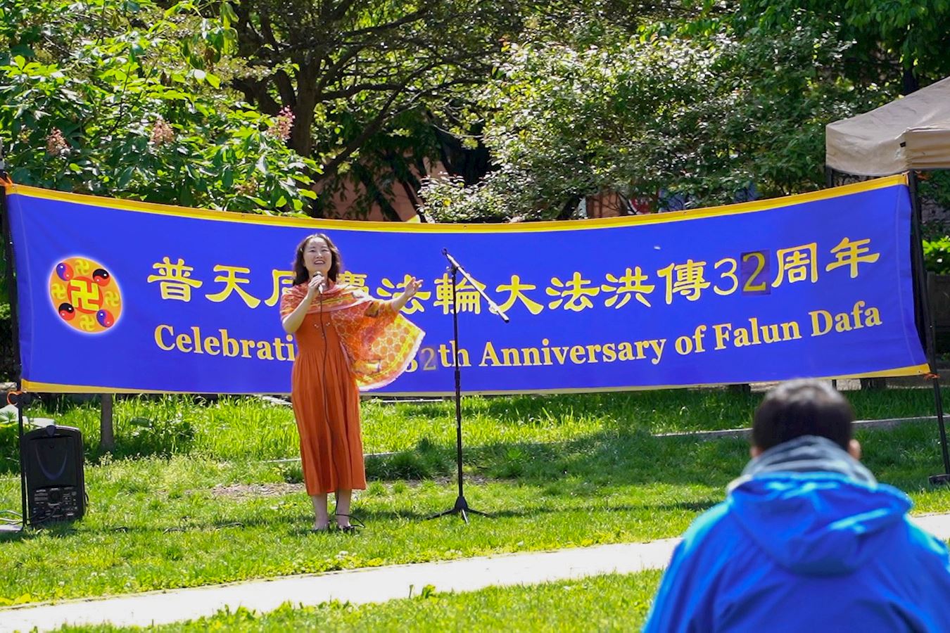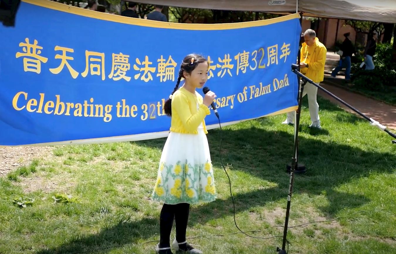 ![]() 图4:二零二四年五月十一日,大费城法轮功学员在费城自由钟独立广场庆祝世界法轮大法日。十岁大法小弟子演唱“插莲花”。 |