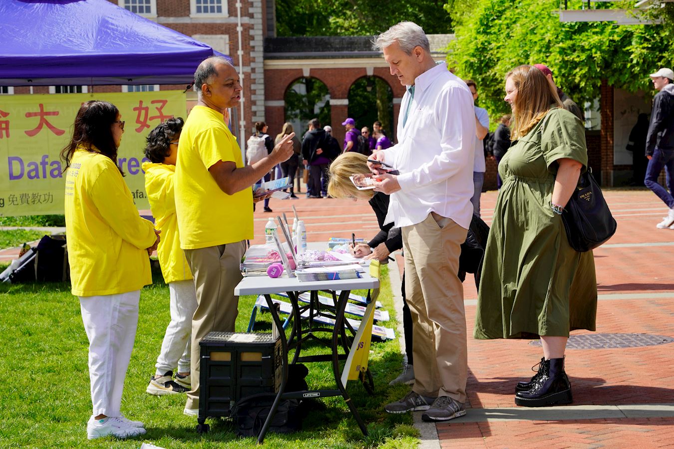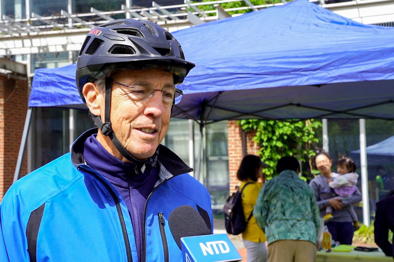 来自北加州的退休理疗师杰克·埃默里(Jack Emery),正和朋友骑自行车从新泽西州纽瓦克前往弗吉尼亚海滩,被法轮功学员平和的炼功场面所吸引。他说他对精神疗法很感兴趣,非常认可法轮大法所倡导的理念。他认识到几年前中共政府做的人体展,“这是迫害的一部份,中共对自己的一些人民所做的事情。”“我们应该尽一切努力来减轻这些不人道行为。”“我们应该善待彼此。”