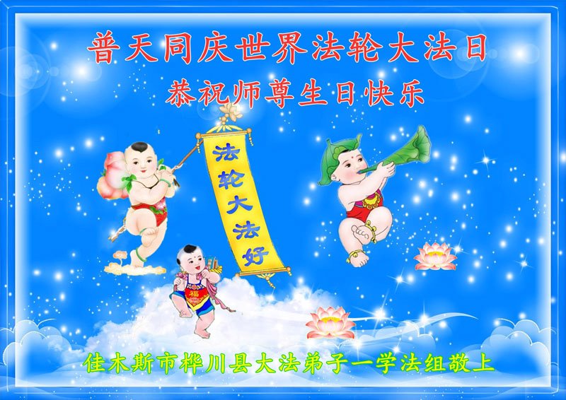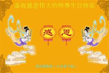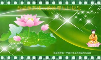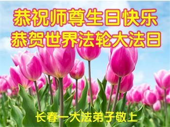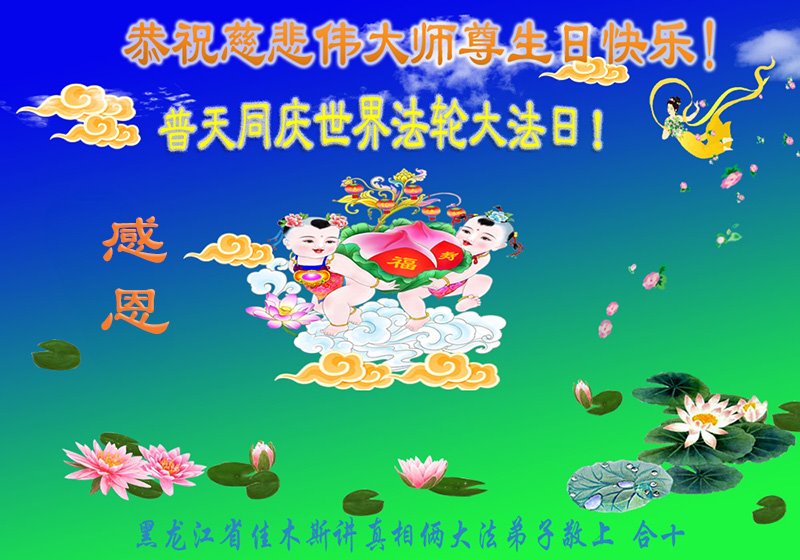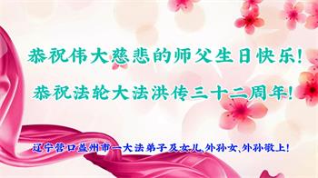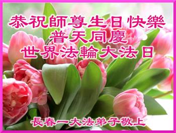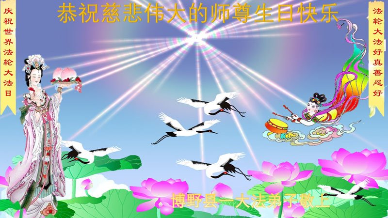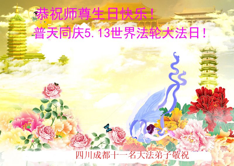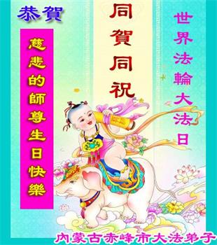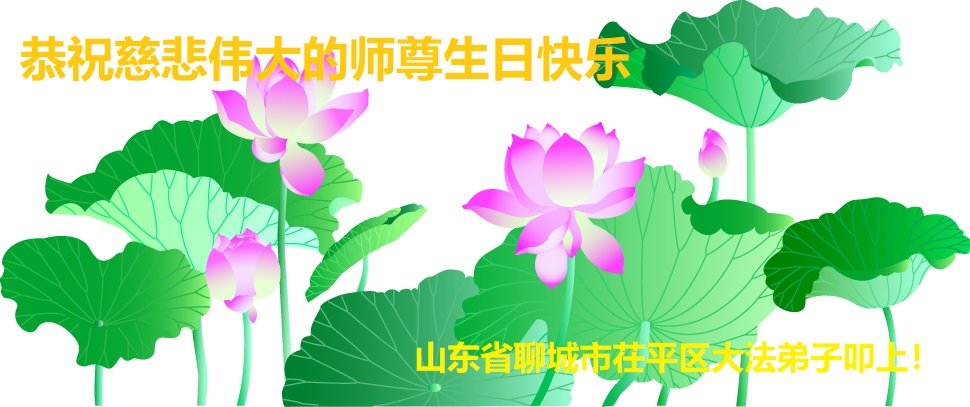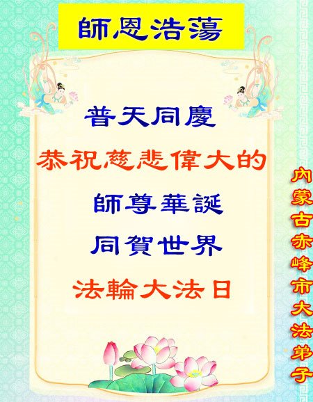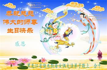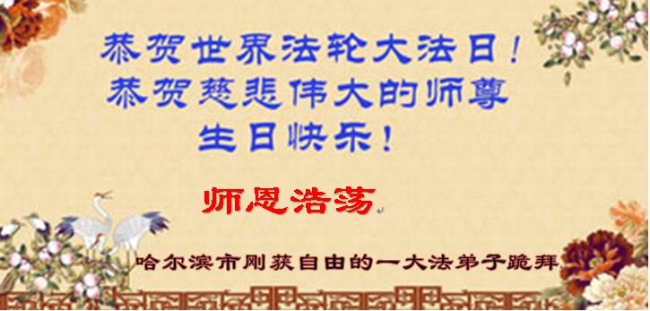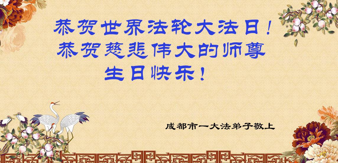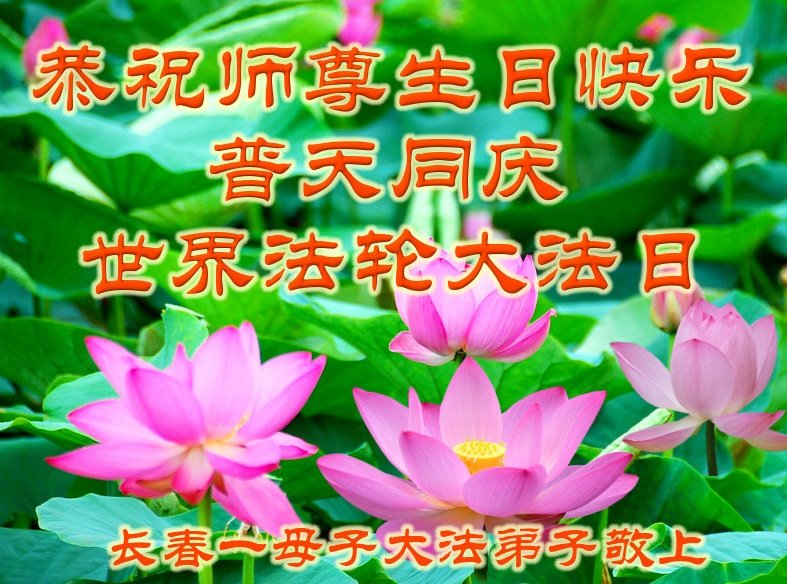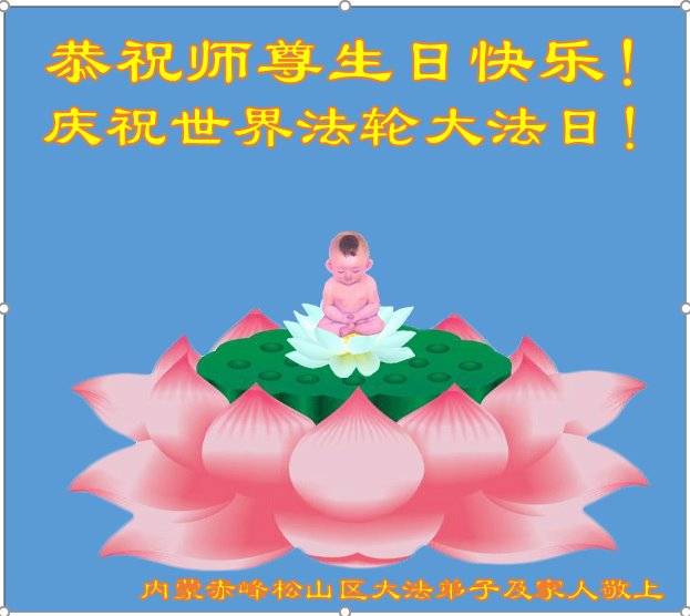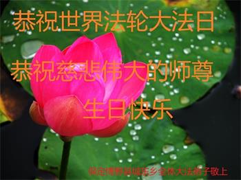 我是开发区大法弟子,看师父各地讲法时泪水连连,师父操心弟子,救度各地众生,非常的辛苦。每次我都对自己要求,做好三件事,对得起师父的苦度。我一人炼功,全家人都受益,都支持。我一家十一口人感恩师父,同庆世界法轮大法日!恭祝师父生日快乐!
